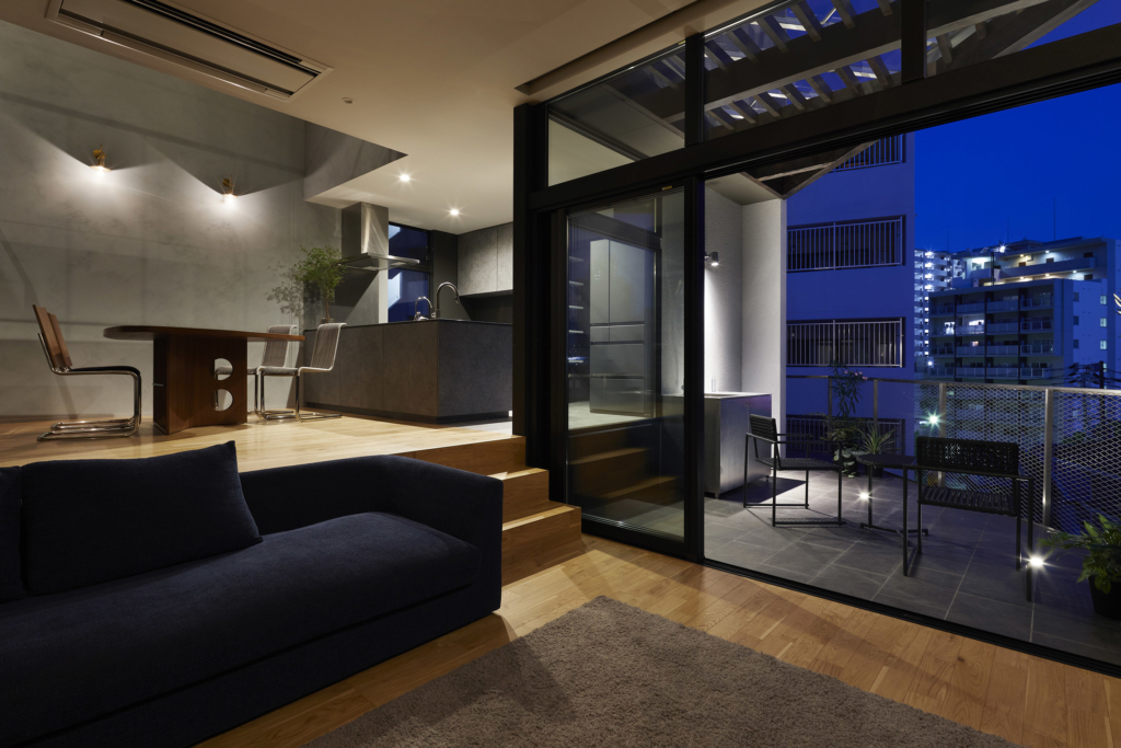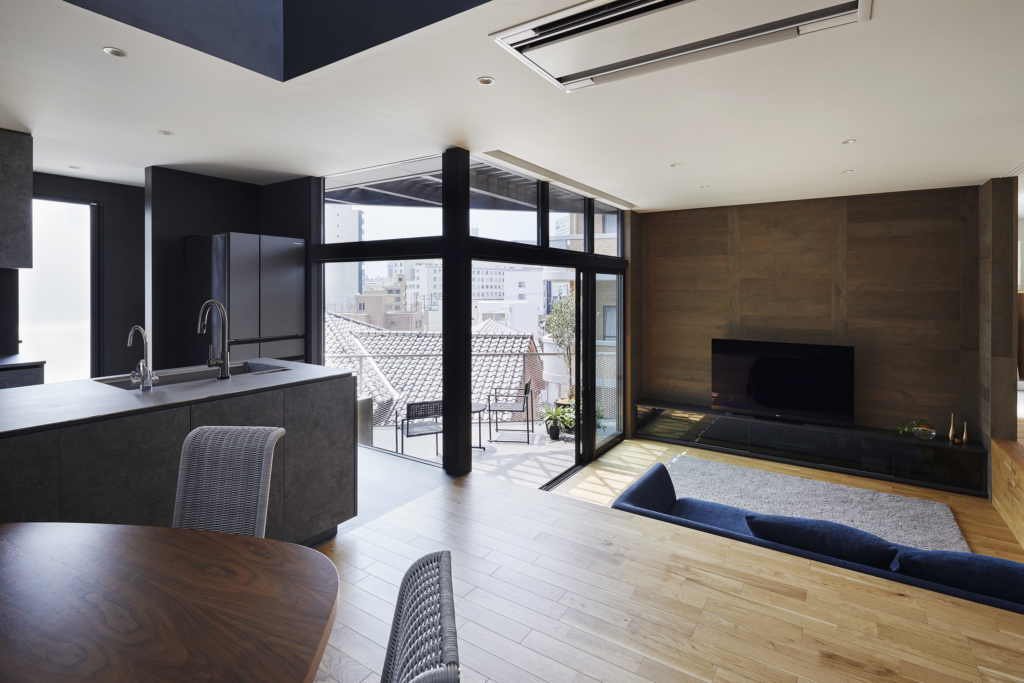 敷地の風は街並み方向から山並み方向へ風が通ることから、それぞれ通風として有効な開口を配置する構成を検討した。街並に対して開いた窓はテラスとつながり、吹抜けを介して山並みとつながる窓を配置する。1階は街並みを、2階は山並みを望むことができ、さらに景色を取り込むだけではなく光と風も同時に取り込んでいる。敷地と道路には高低差があるため、緩やかな段差によって分けられた諸室が導かれ、さらに敷地形状が三角形であることから雁行した空間が導かれた。雁行配置の余白が2つのテラスとなり、多目的なスペースとして活用されている。広島市の中心部は遠くを見渡せば山並の景色にたどり着くという自然に恵まれた都市。その自然環境と都市の風景を取り込んだ豊かな住宅となったのではと考えている。