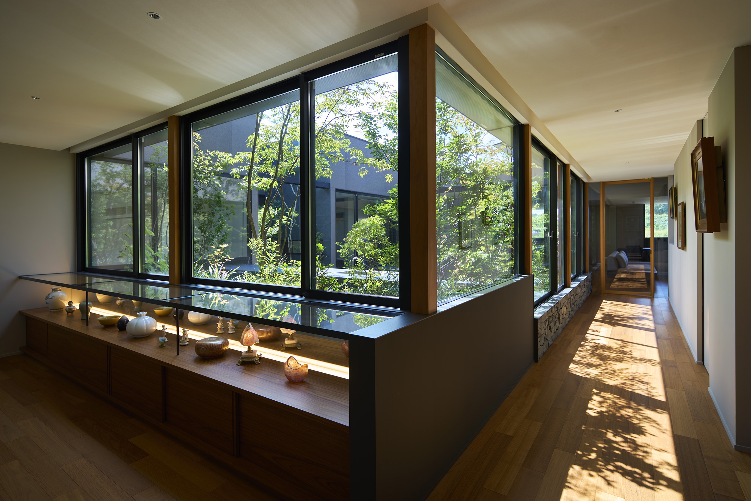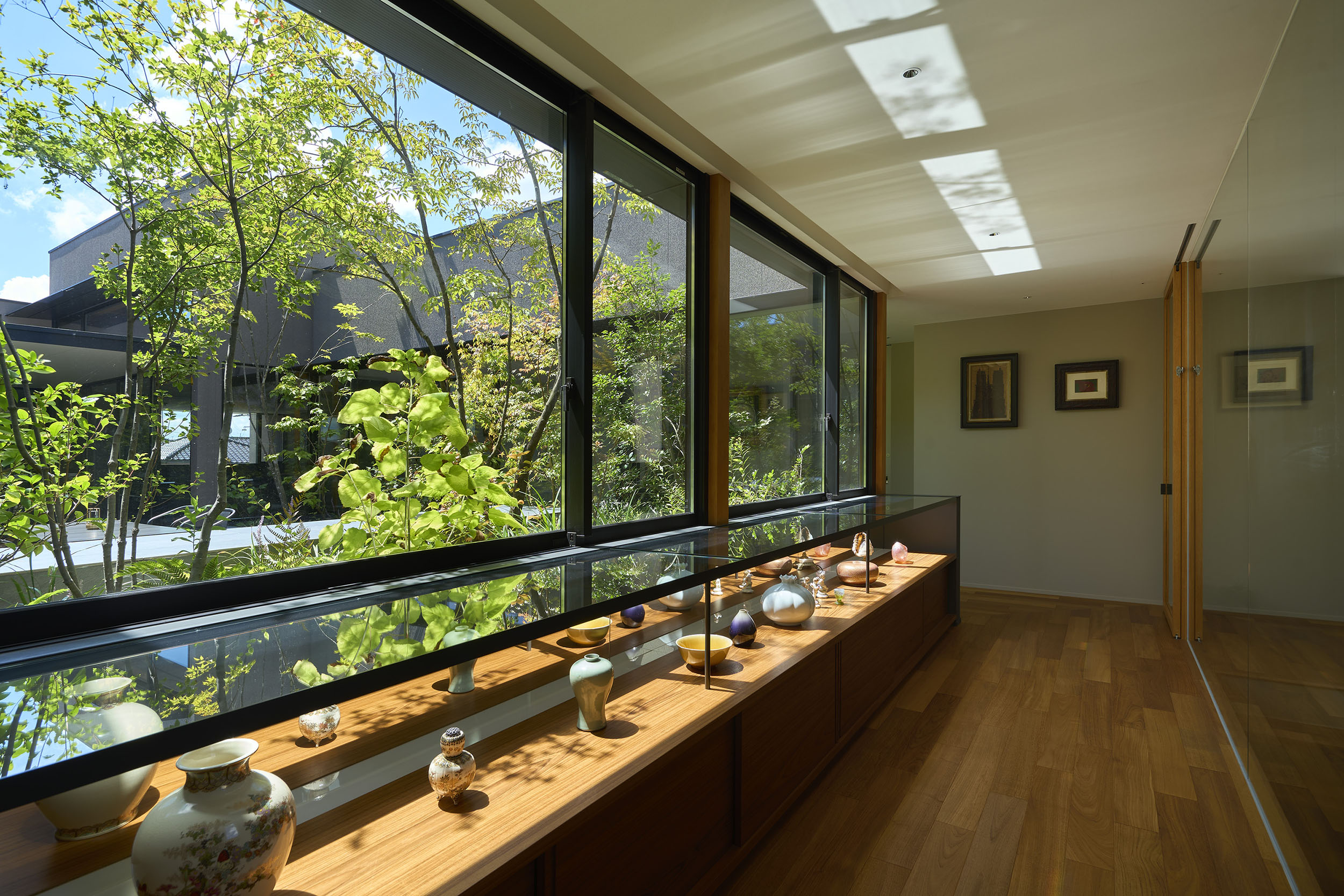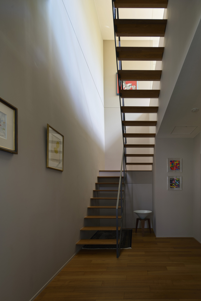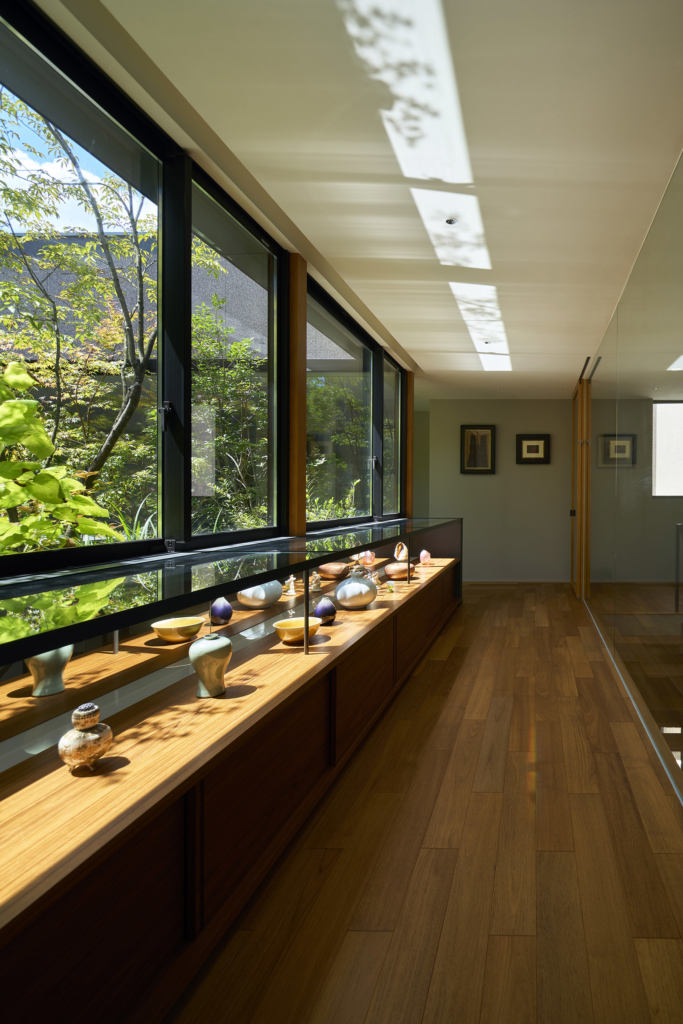 住宅部分は1階に設けた玄関ホールから2階へアプローチする動線とし、玄関ホールや階段、廊下といった移動のための空間にも展示機能を備えた。アートに造詣の深い建主の要望に応えるため、家全体がギャラリーとして振る舞うよう計画している。回廊形式の廊下からはアートと庭を同時に眺めることができ、生活と鑑賞行為が自然に交錯する。
