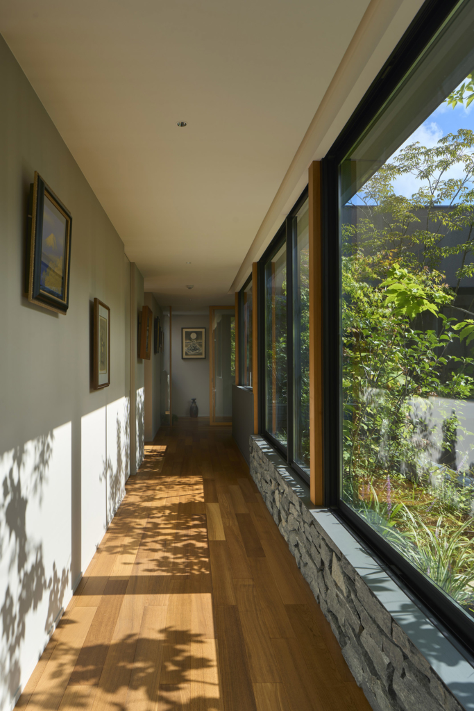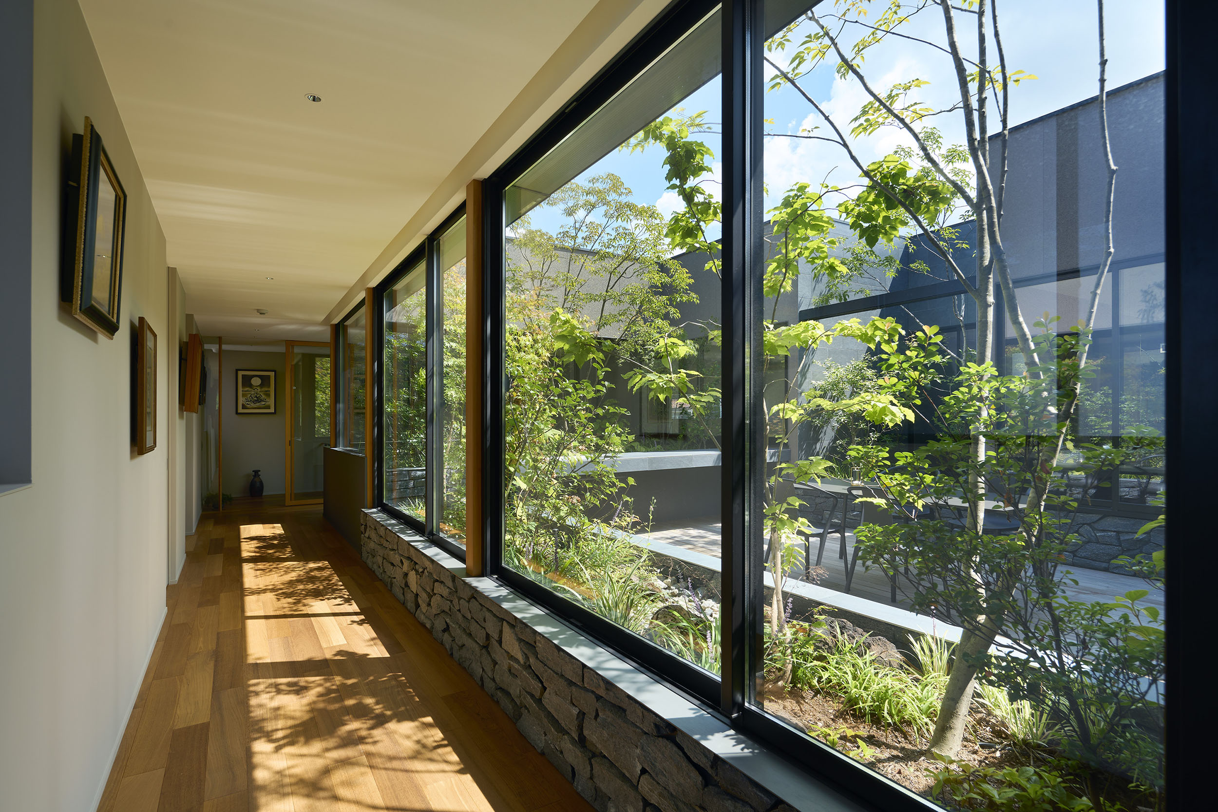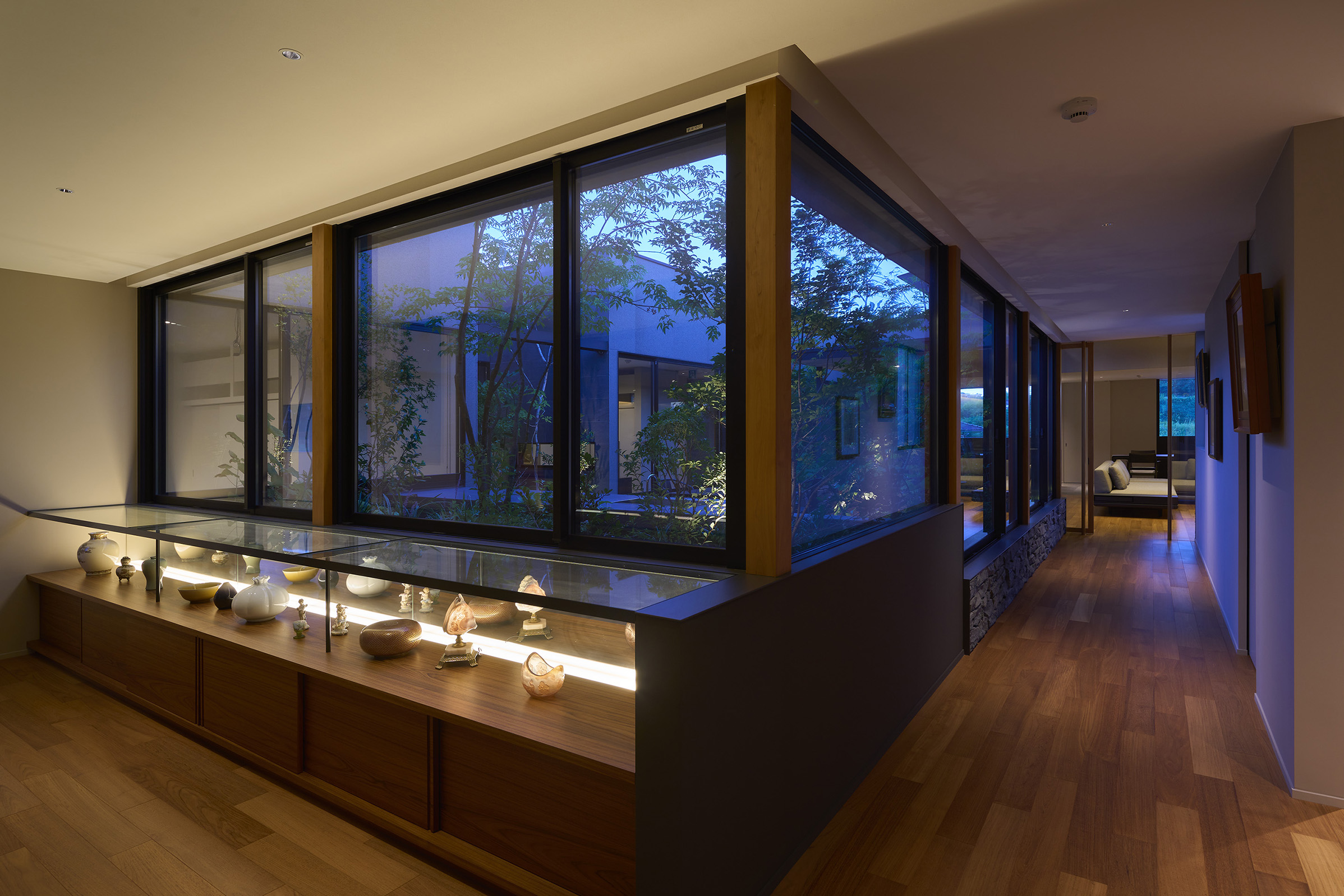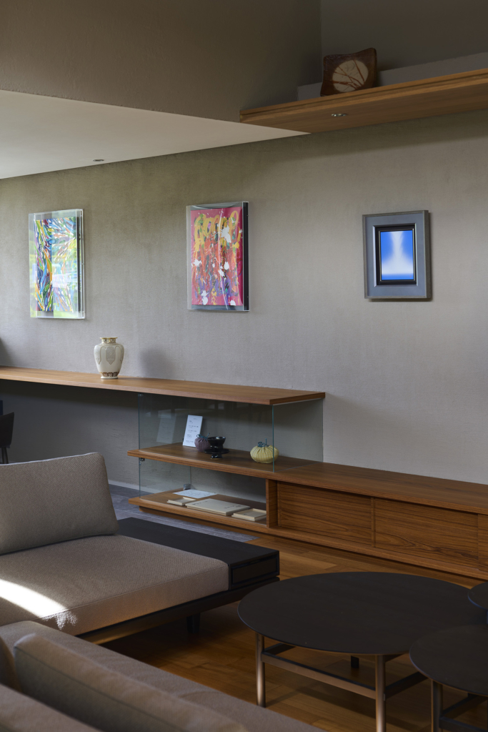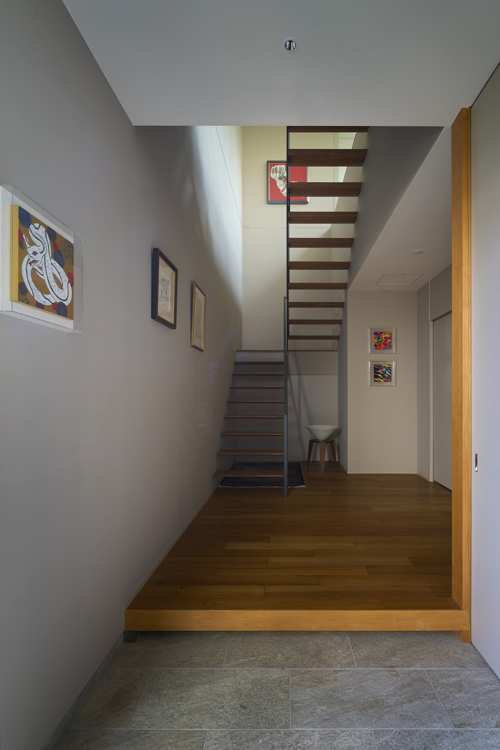 住宅部分は1階に設けた玄関ホールから2階へアプローチする動線とし、玄関ホールや階段、廊下といった移動のための空間にも展示機能を備えた。アートに造詣の深い建主の要望に応えるため、家全体がギャラリーとして振る舞うよう計画している。回廊形式の廊下からはアートと庭を同時に眺めることができ、生活と鑑賞行為が自然に交錯する。