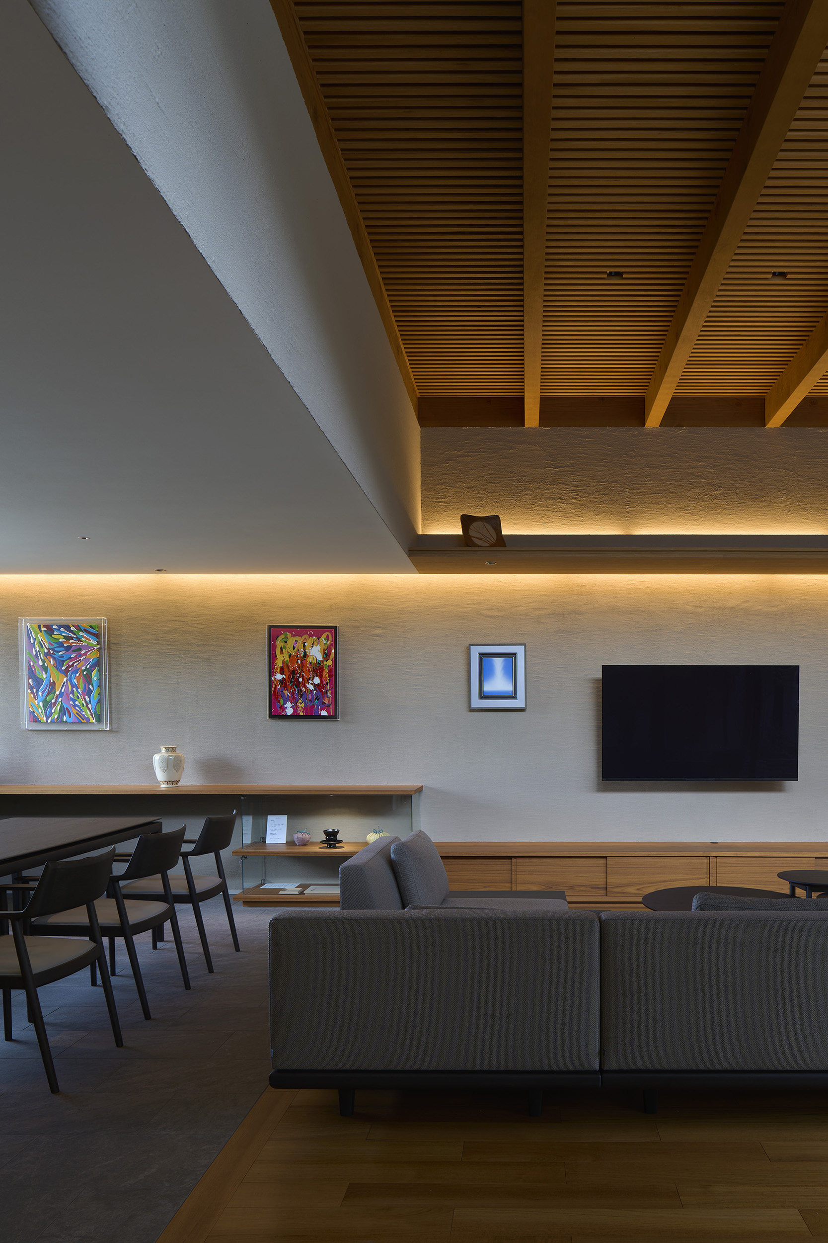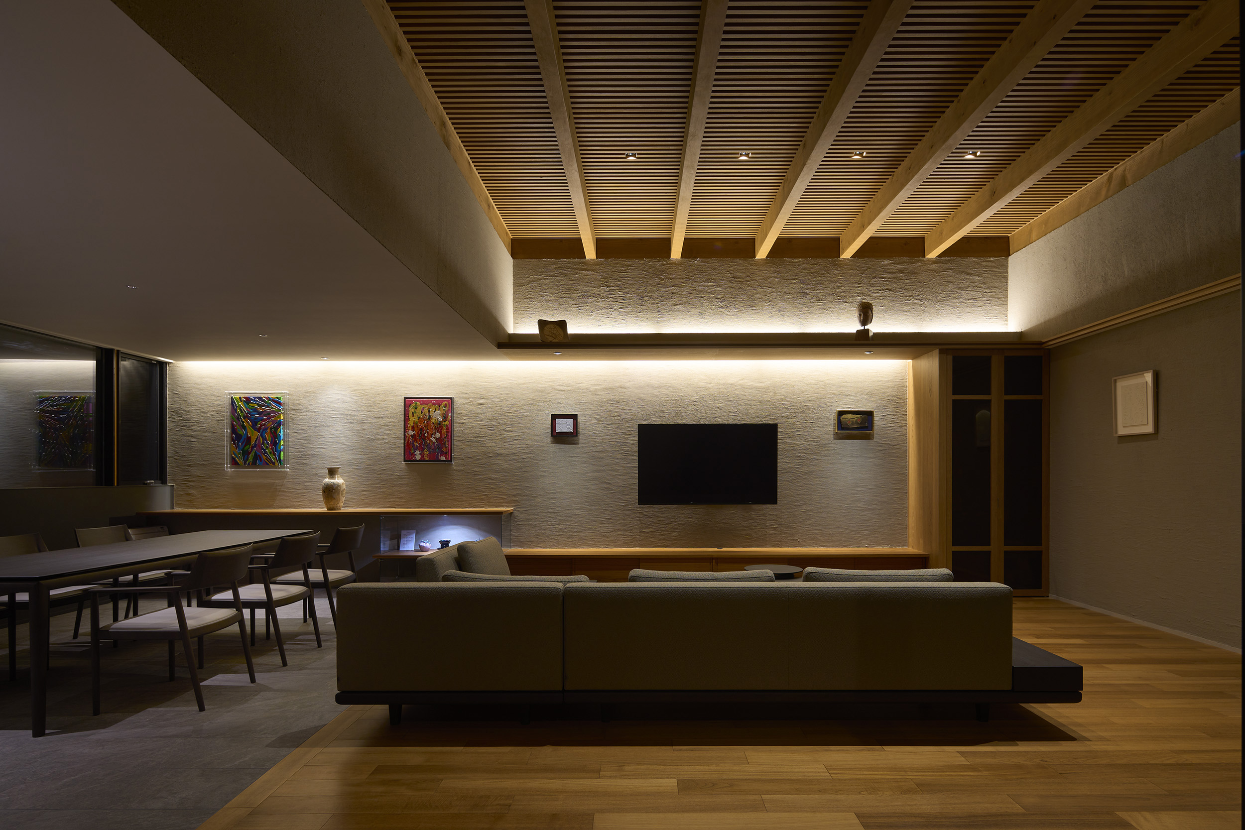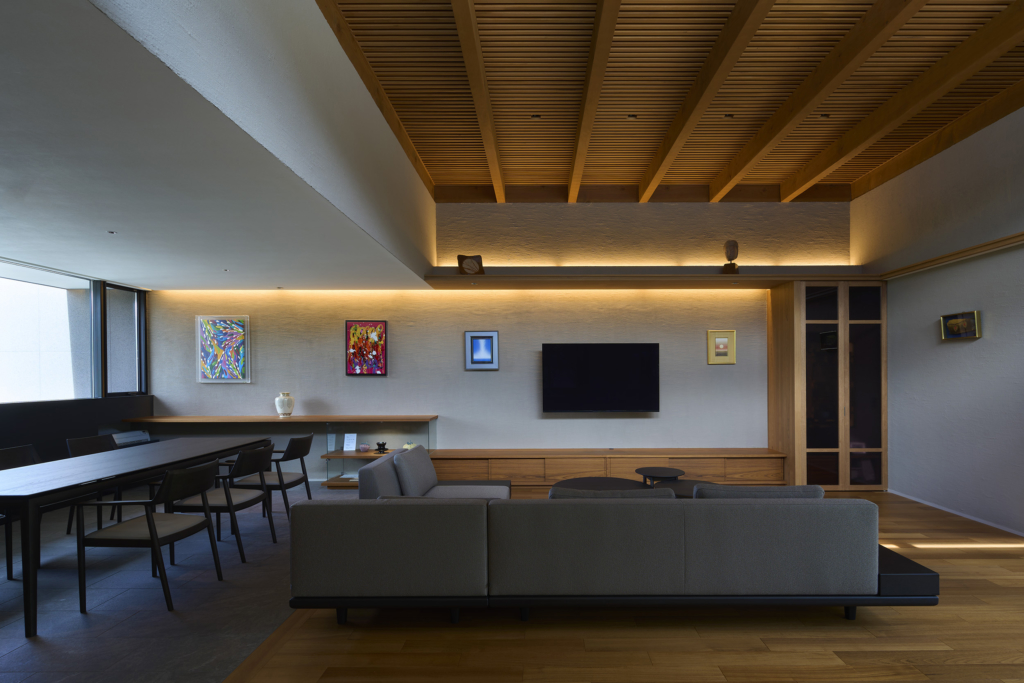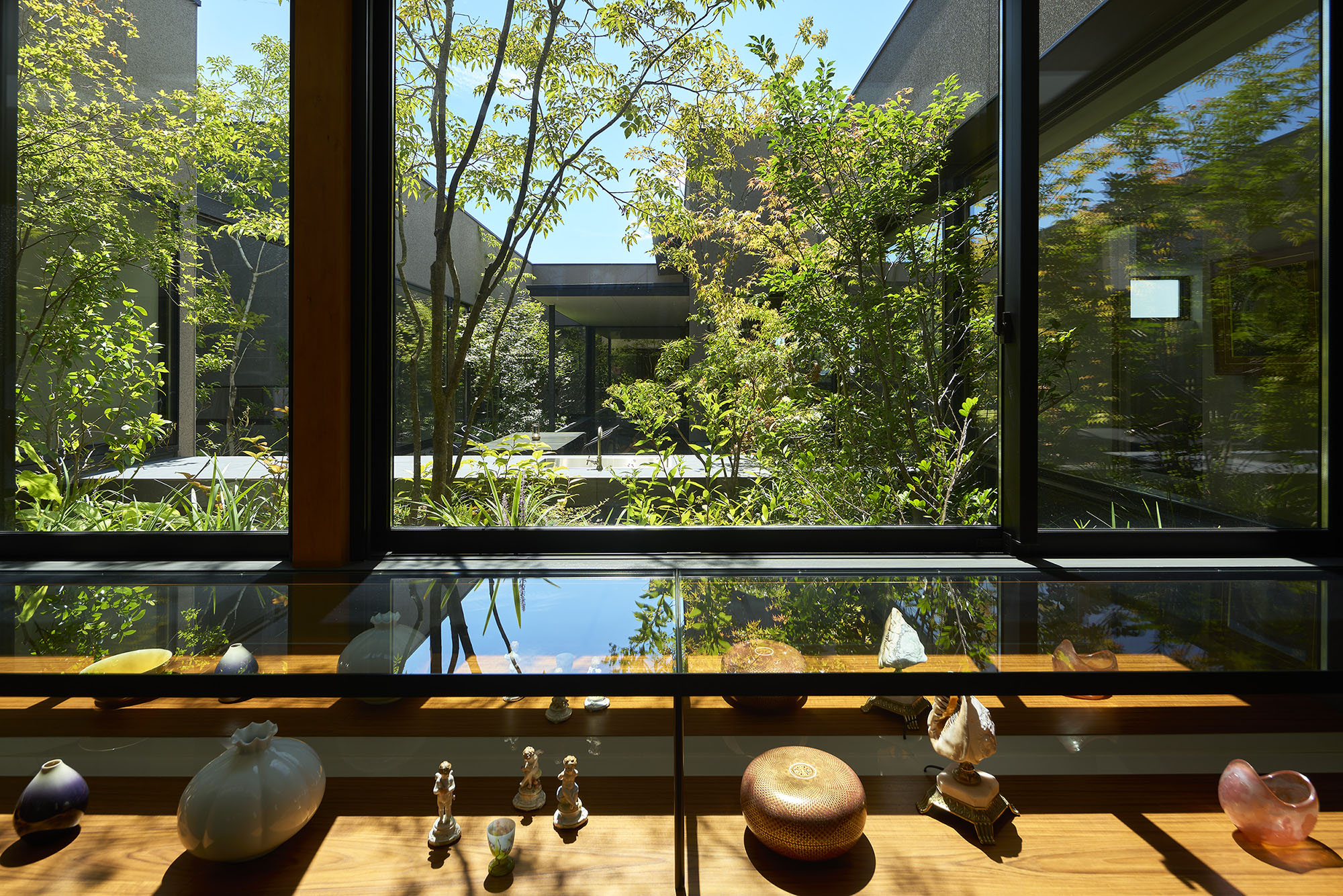 住宅部分は1階に設けた玄関ホールから2階へアプローチする動線とし、玄関ホールや階段、廊下といった移動のための空間にも展示機能を備えた。アートに造詣の深い建主の要望に応えるため、家全体がギャラリーとして振る舞うよう計画している。回廊形式の廊下からはアートと庭を同時に眺めることができ、生活と鑑賞行為が自然に交錯する。