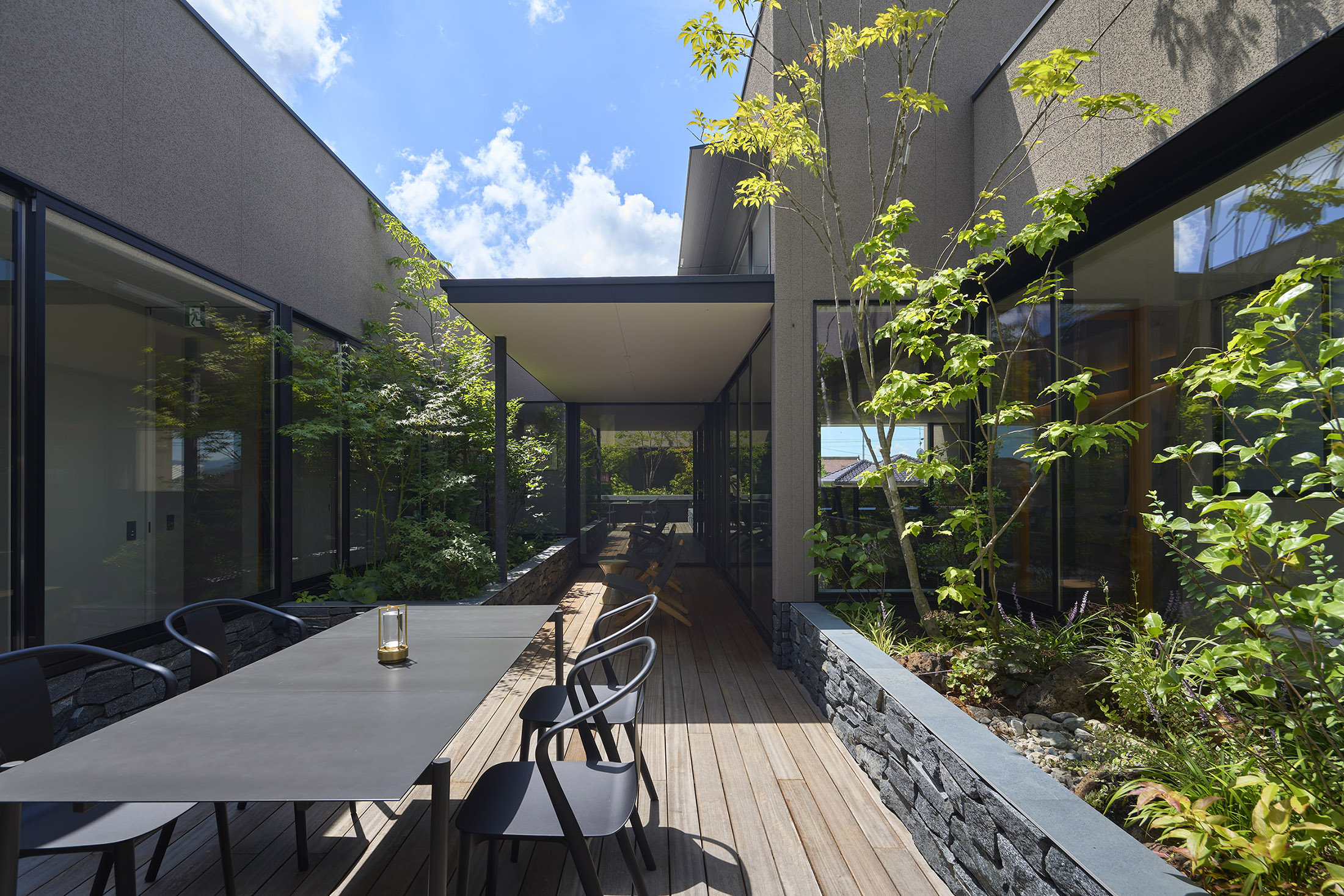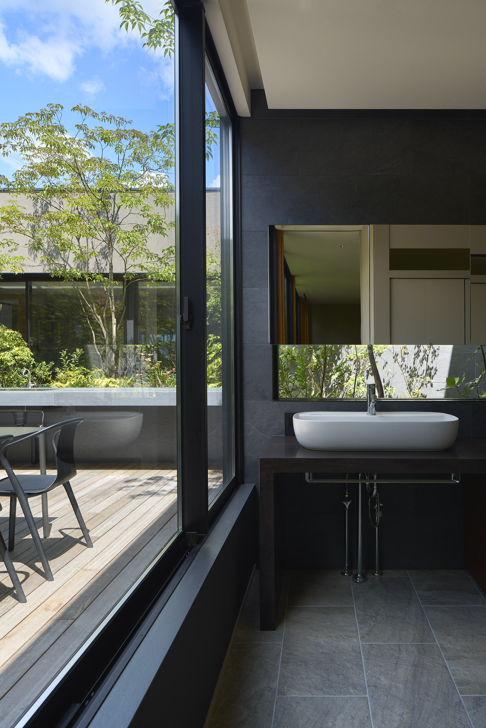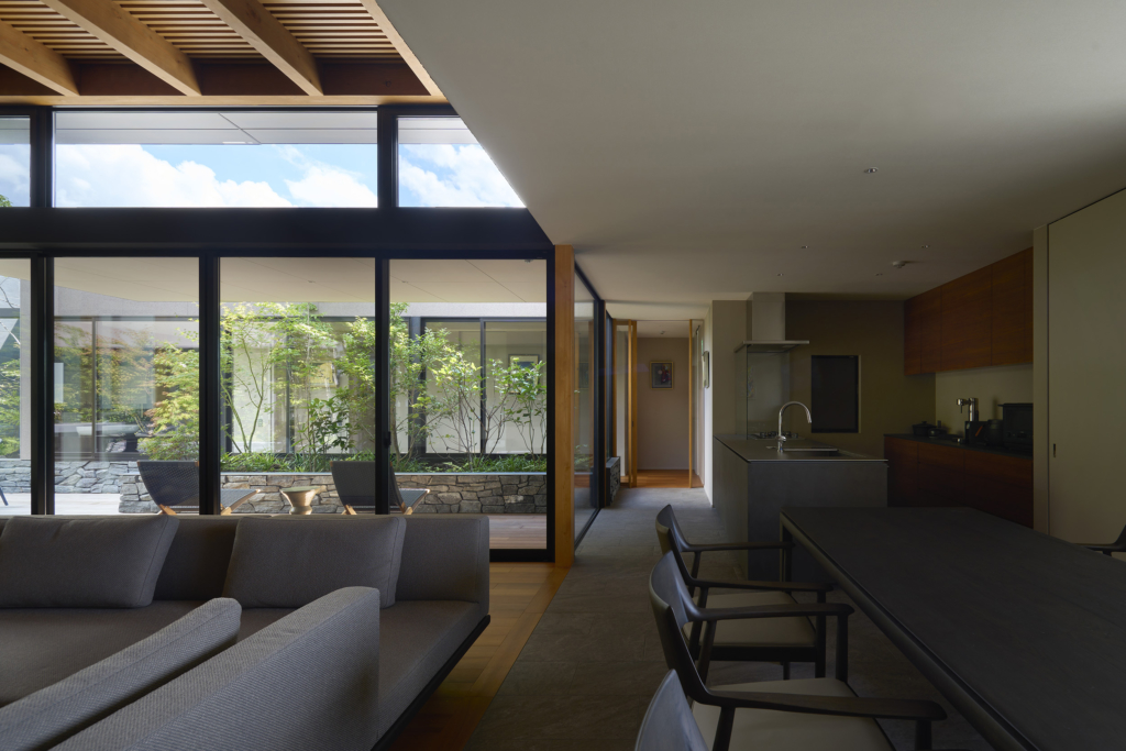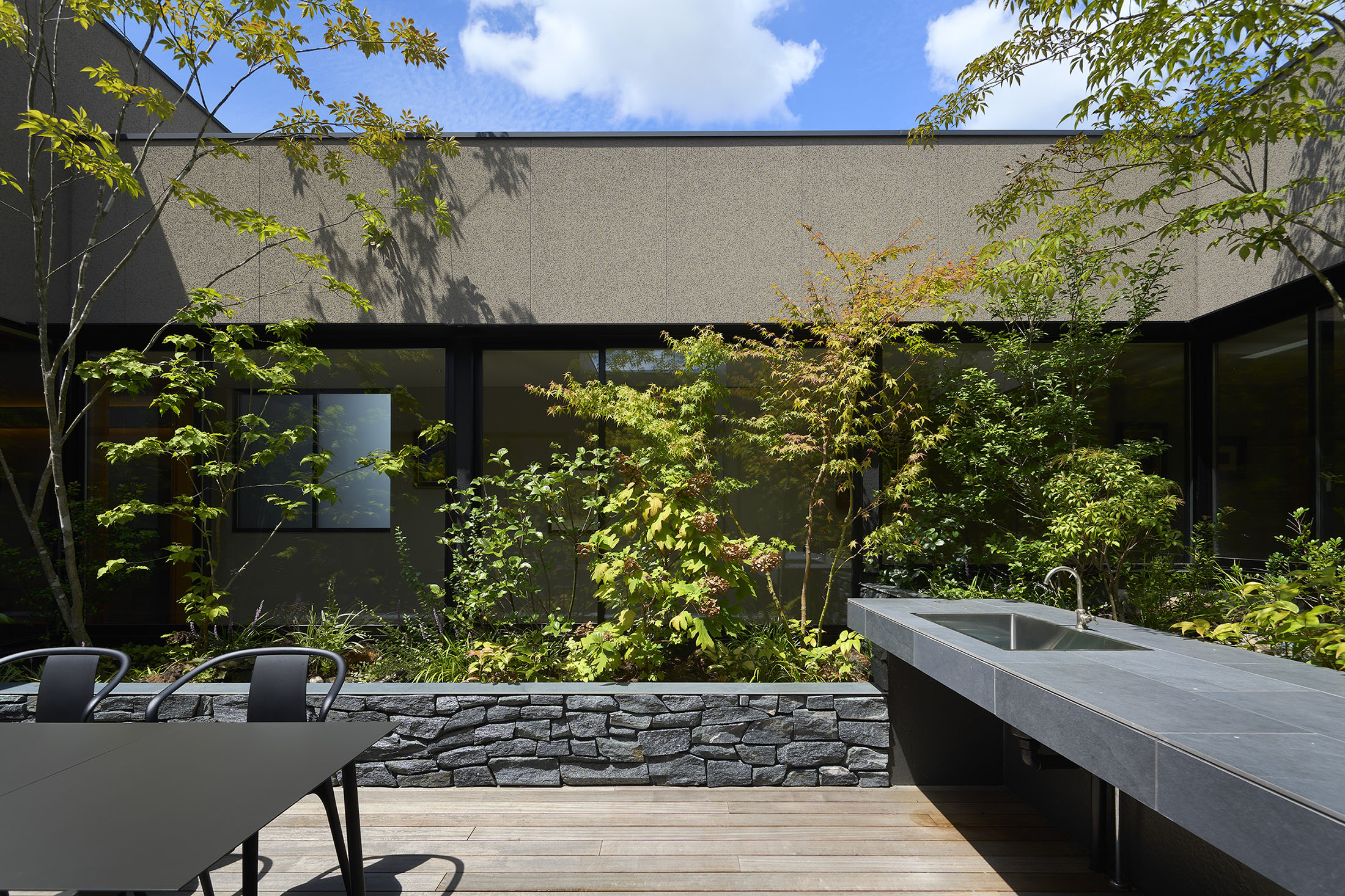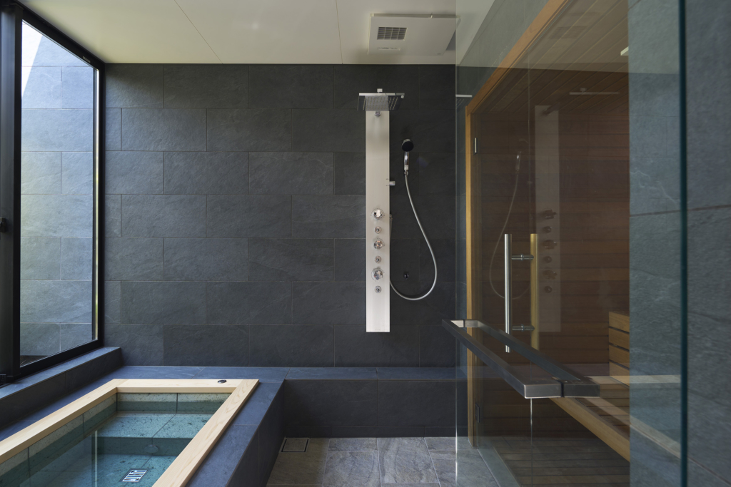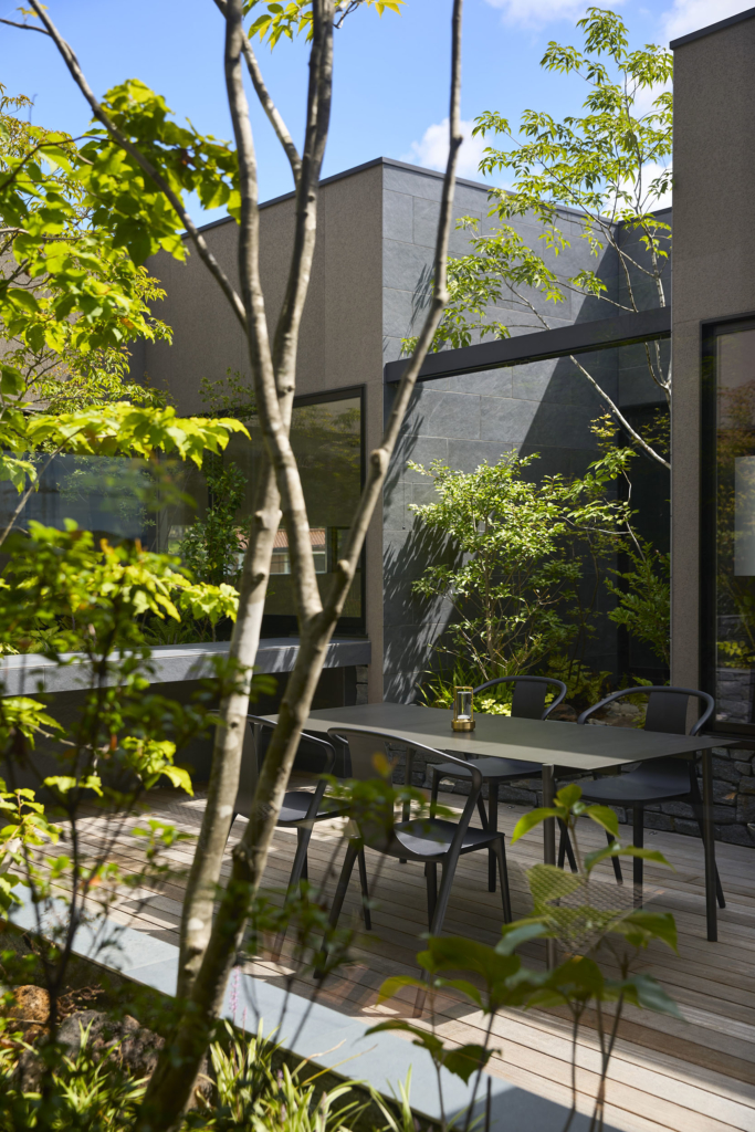中央の庭は、アウターリビングとアウターダイニングに緩やかにゾーニングされ、深い軒によって守られたリビングの延長空間と、アウトドアキッチンを備えたダイニングは、季節や気分によって多様な家族の過ごし方を許容する。さらにその外周にも庭を設けることで、コートハウスの構成でありながら外の季節や気配を生活に取り込むことを可能にした。各室に設けた開口部を通じて中央の庭を軸に風が巡り、空気が循環するよう環境計画にも配慮している。また浴室から庭を通りアウターリビングまで連続する動線は、サウナ利用時の外気浴としても機能し、内外が緩やかに交差する居住体験を生み出している。