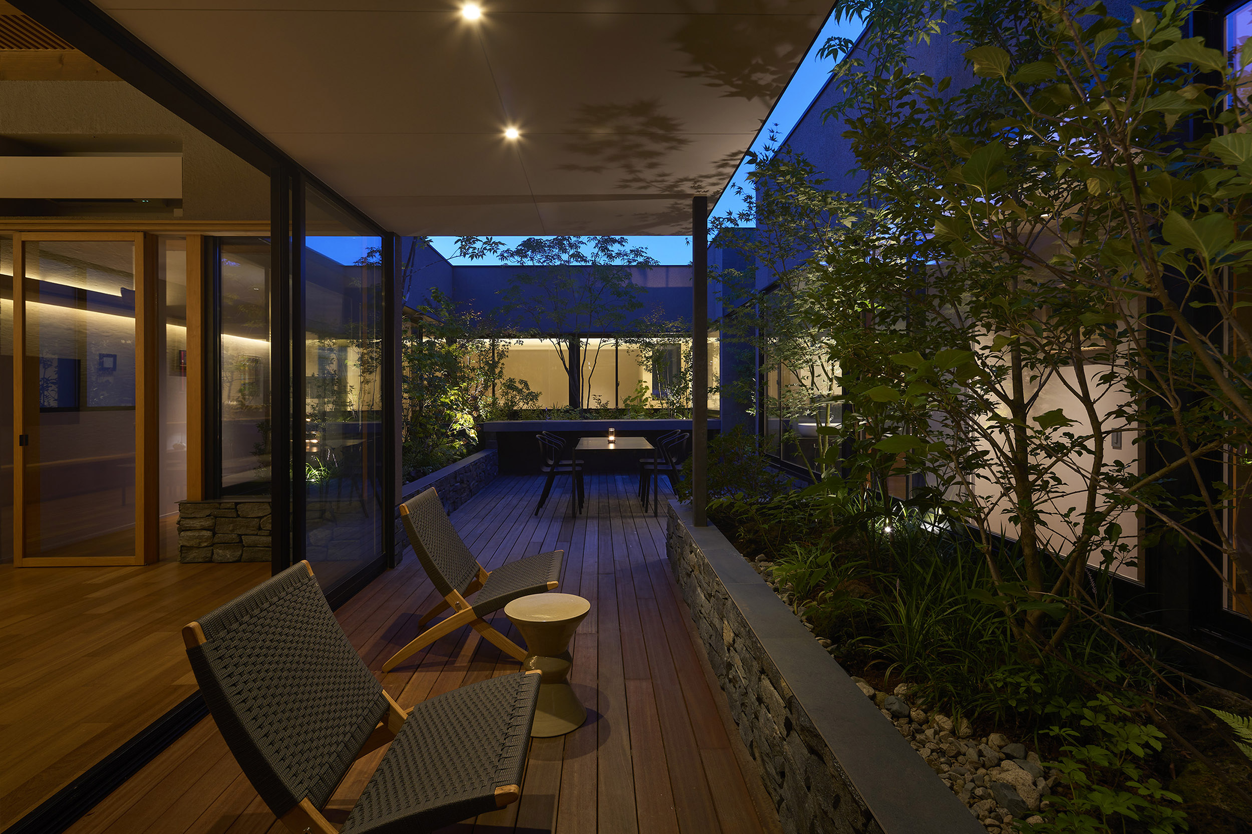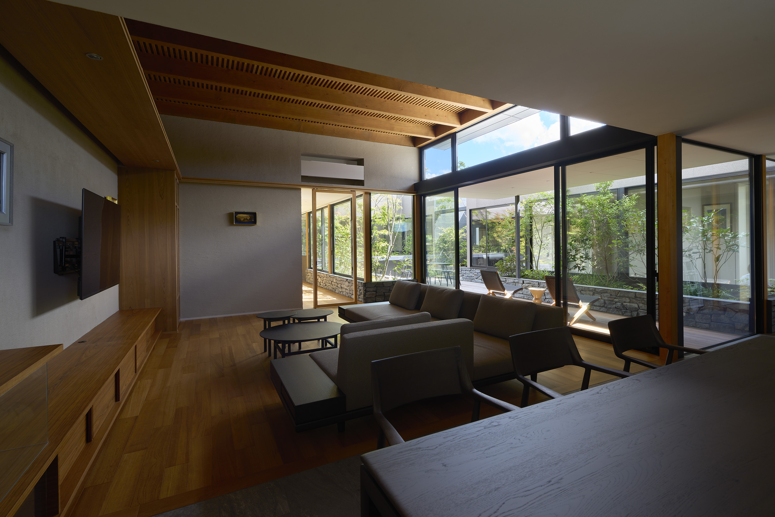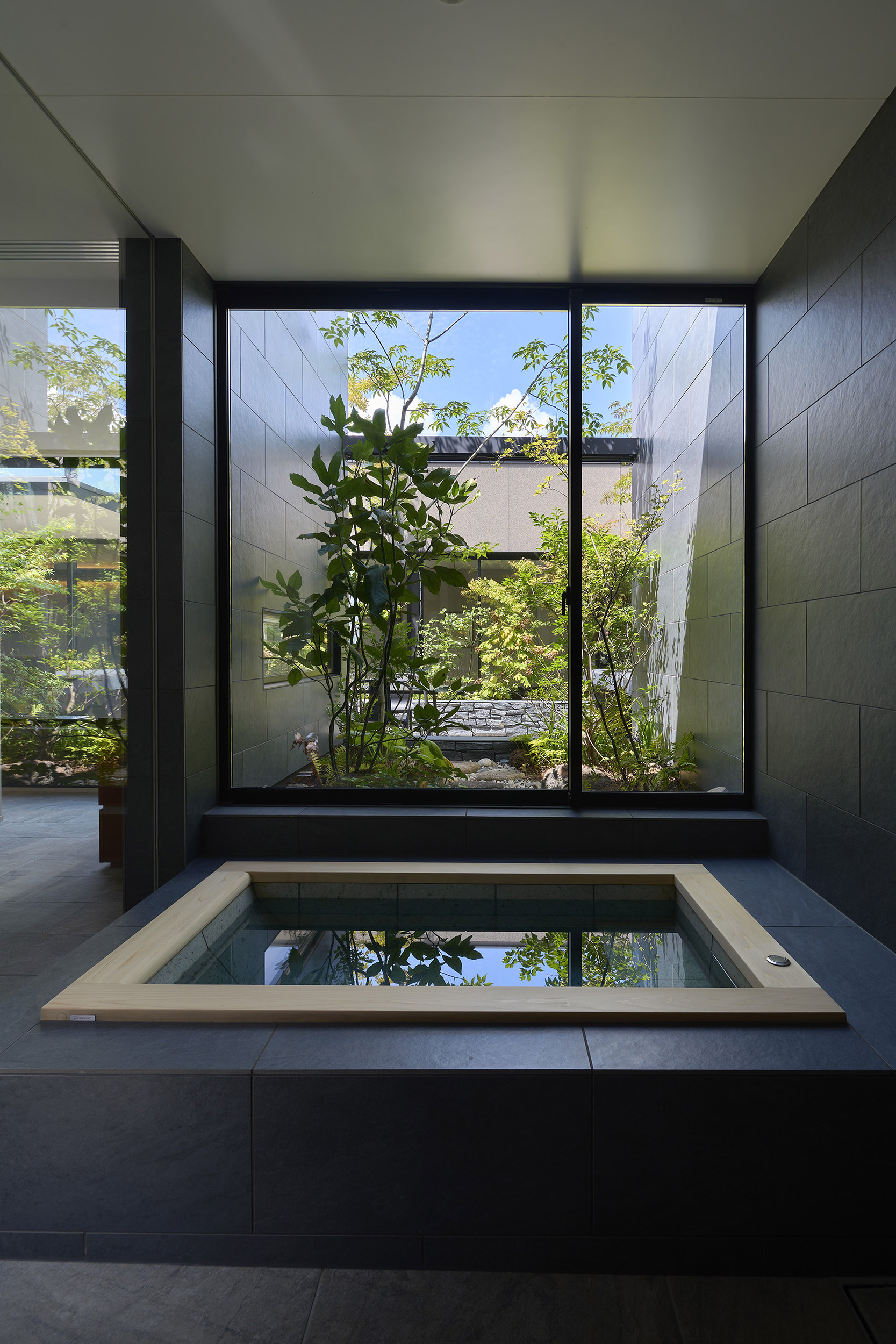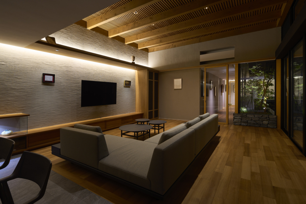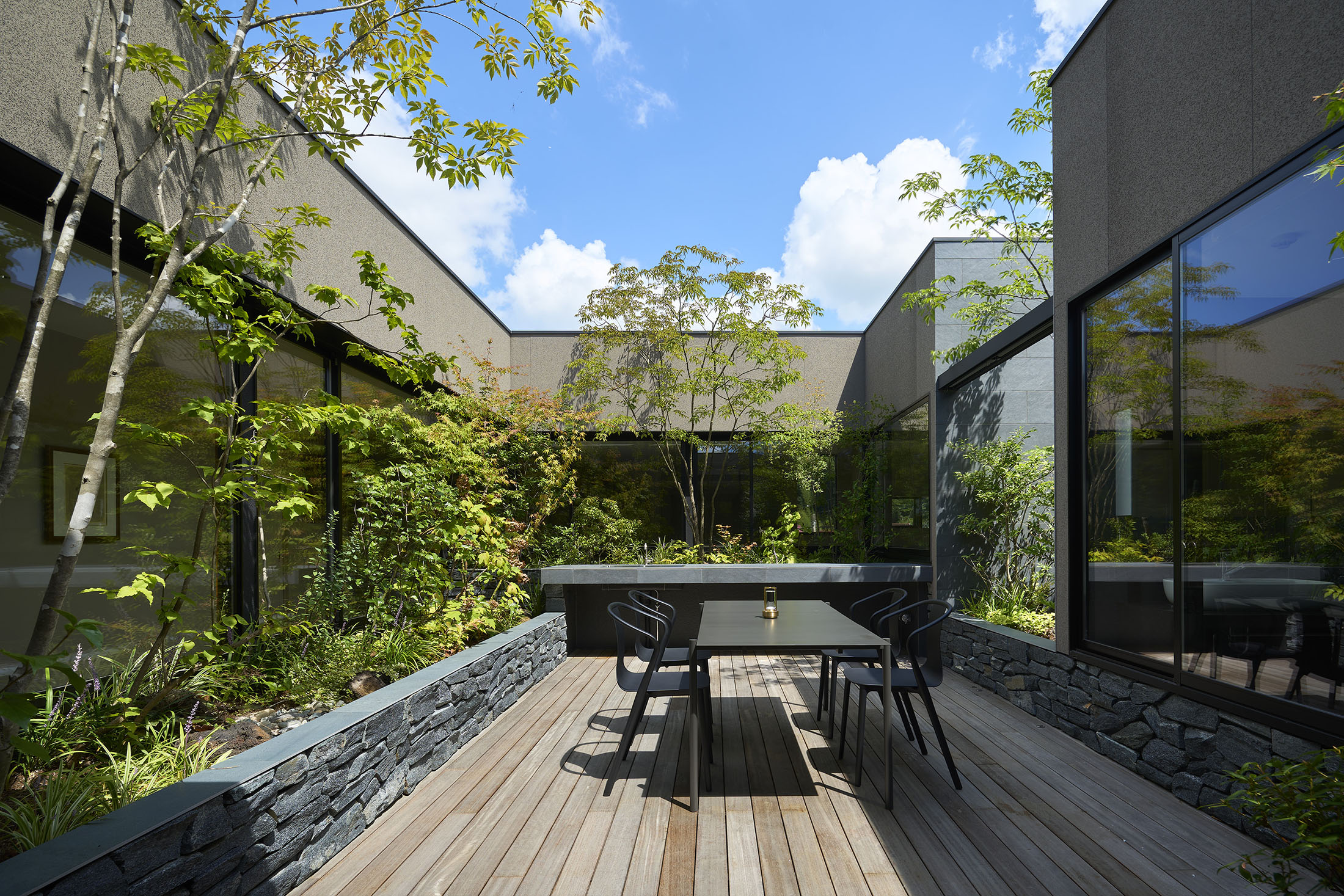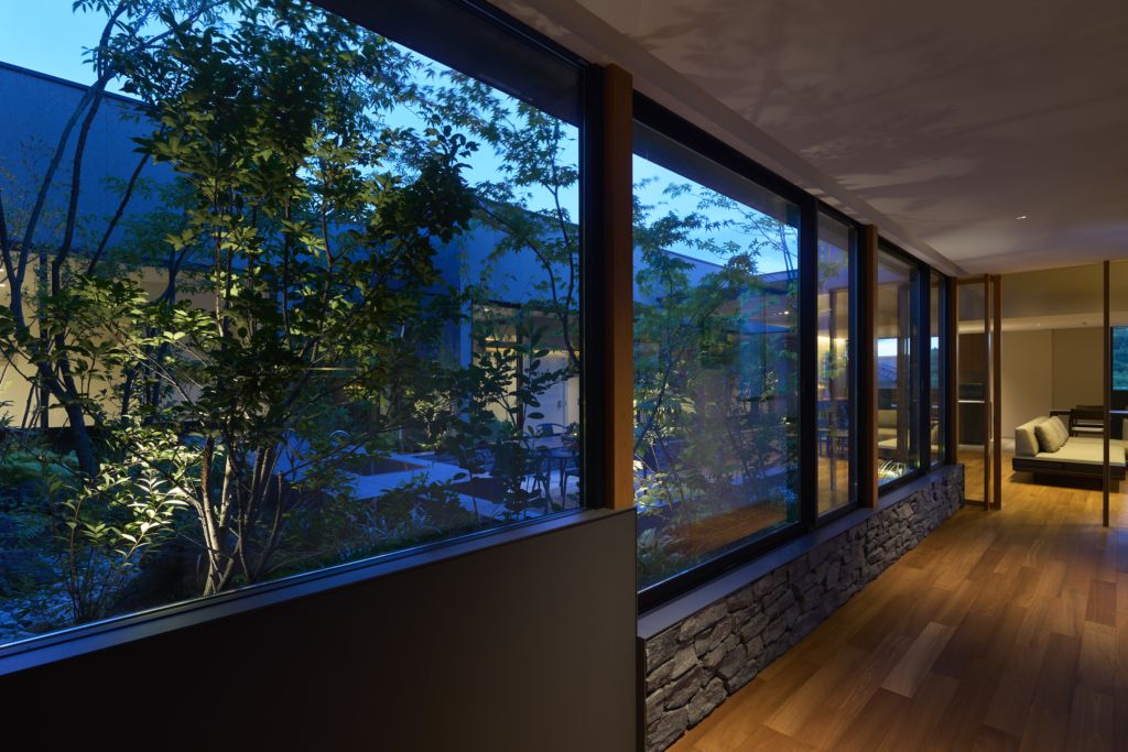 中央の庭は、アウターリビングとアウターダイニングに緩やかにゾーニングされ、深い軒によって守られたリビングの延長空間と、アウトドアキッチンを備えたダイニングは、季節や気分によって多様な家族の過ごし方を許容する。さらにその外周にも庭を設けることで、コートハウスの構成でありながら外の季節や気配を生活に取り込むことを可能にした。各室に設けた開口部を通じて中央の庭を軸に風が巡り、空気が循環するよう環境計画にも配慮している。また浴室から庭を通りアウターリビングまで連続する動線は、サウナ利用時の外気浴としても機能し、内外が緩やかに交差する居住体験を生み出している。