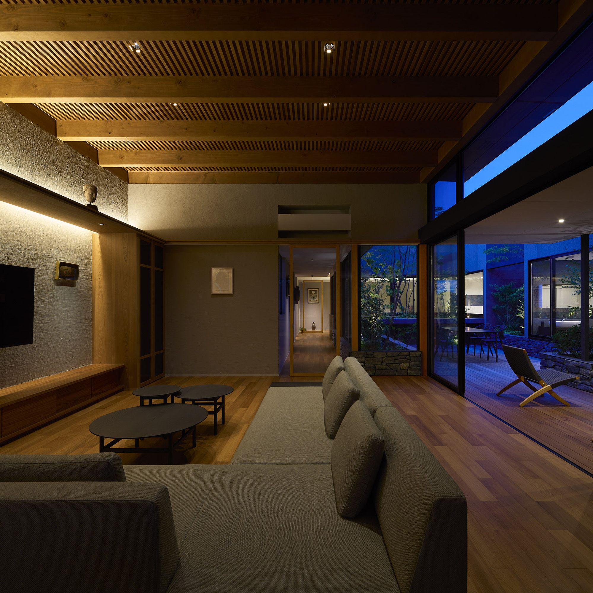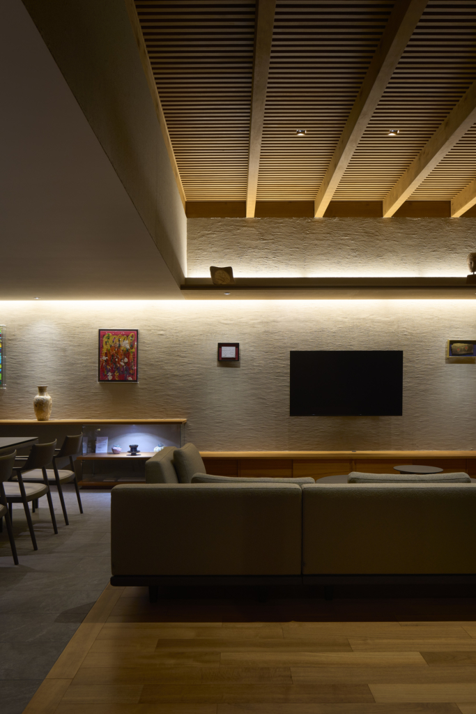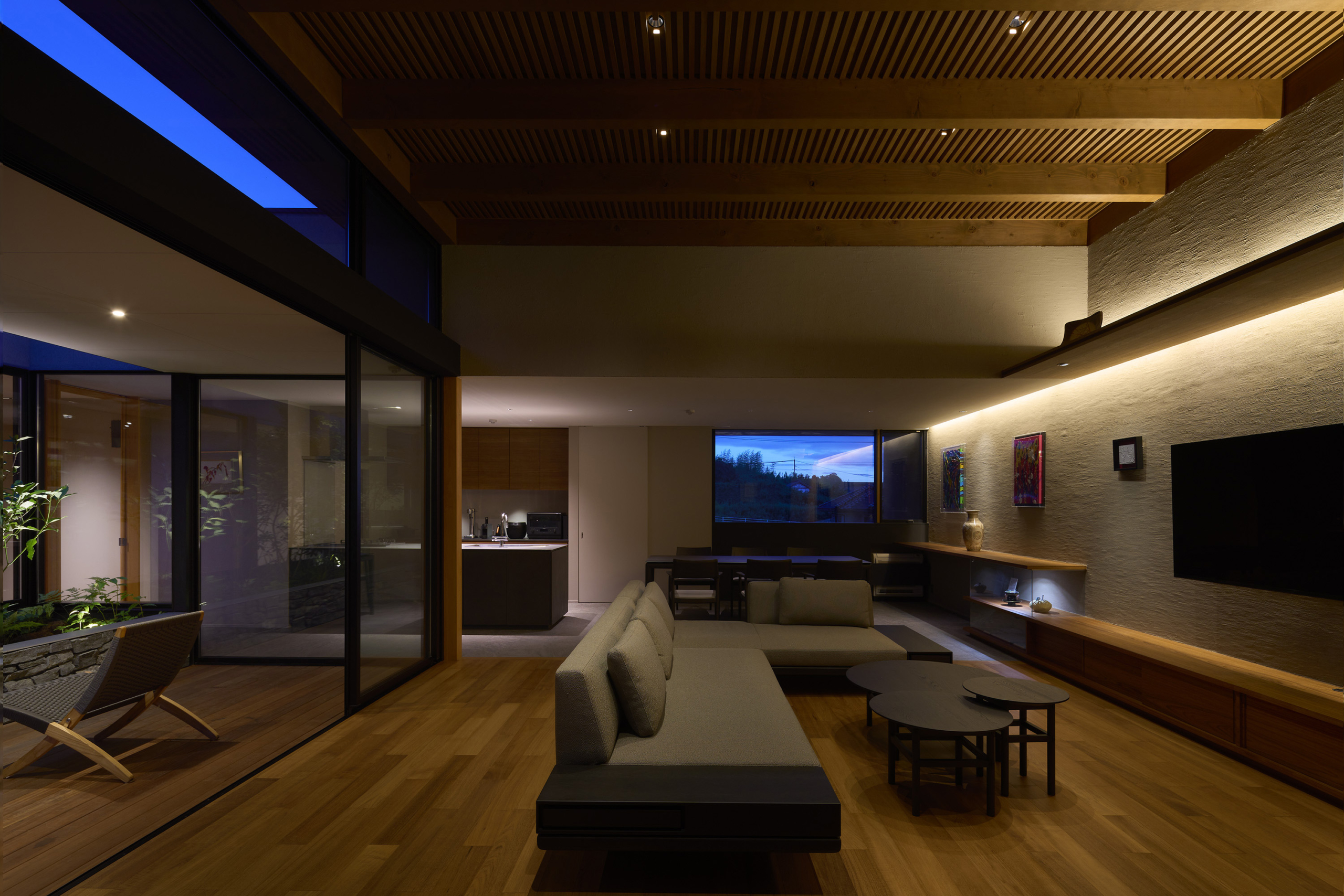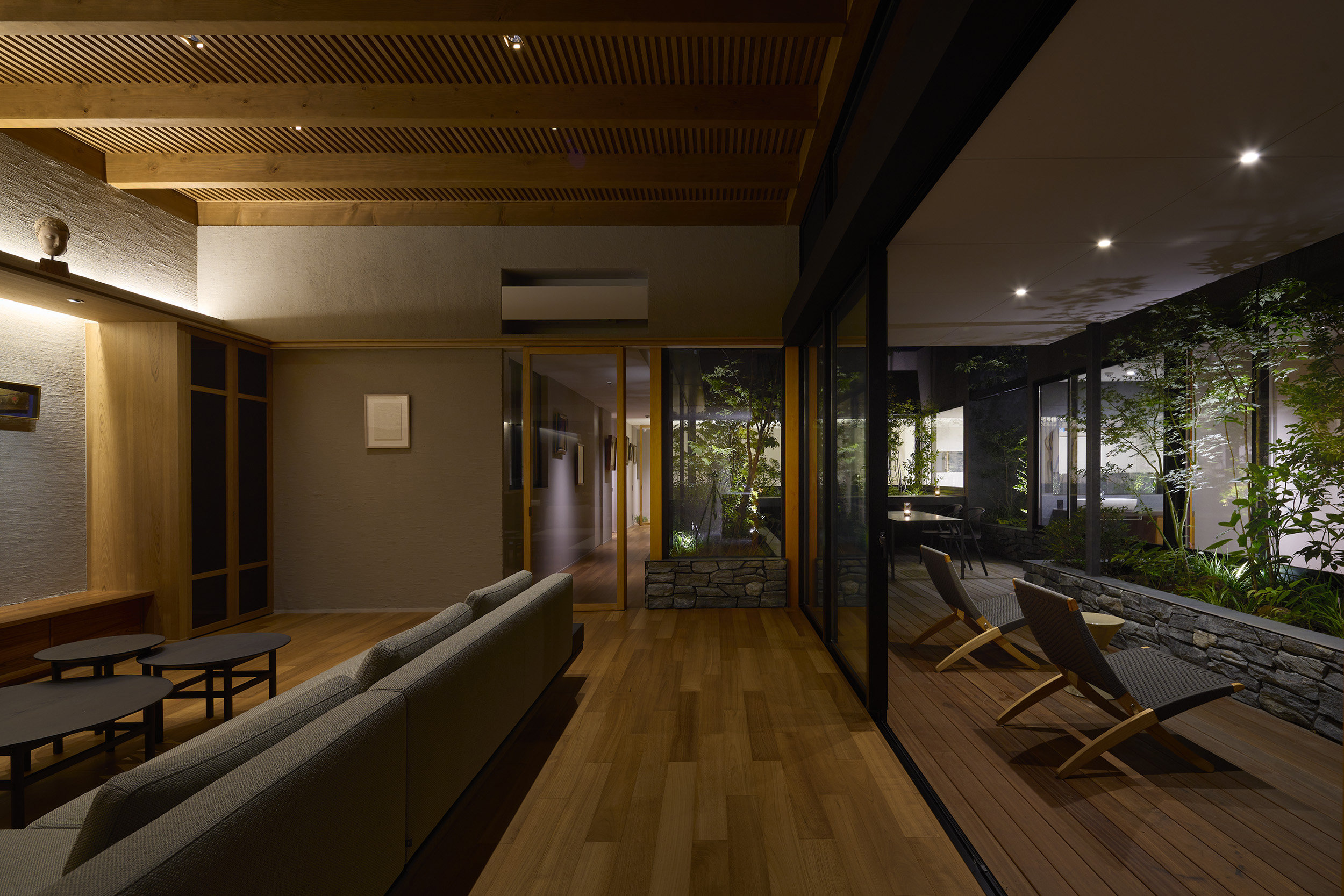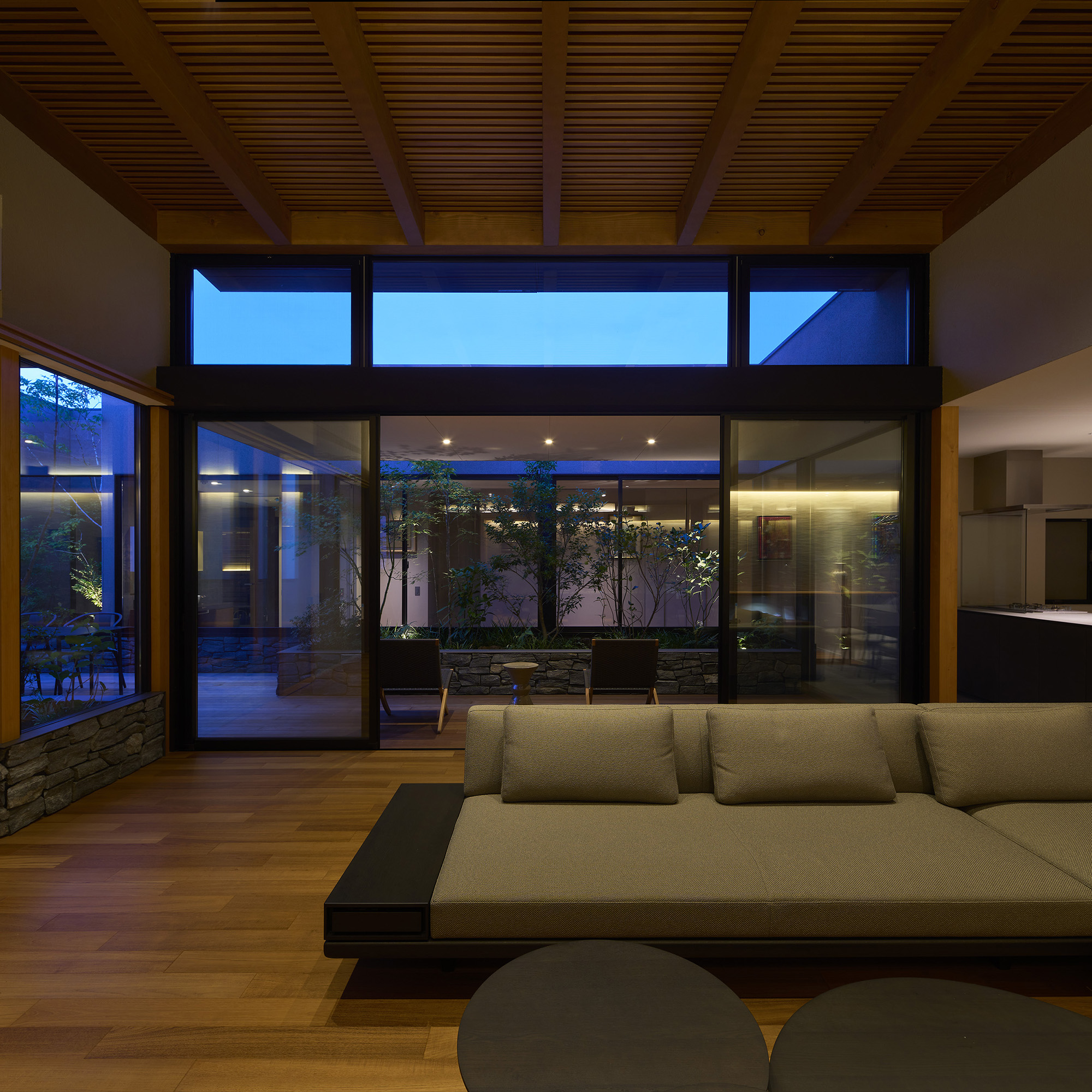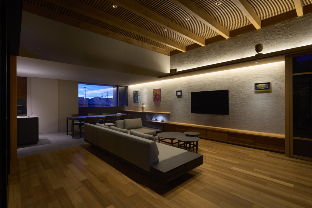 中央の庭は、アウターリビングとアウターダイニングに緩やかにゾーニングされ、深い軒によって守られたリビングの延長空間と、アウトドアキッチンを備えたダイニングは、季節や気分によって多様な家族の過ごし方を許容する。さらにその外周にも庭を設けることで、コートハウスの構成でありながら外の季節や気配を生活に取り込むことを可能にした。各室に設けた開口部を通じて中央の庭を軸に風が巡り、空気が循環するよう環境計画にも配慮している。また浴室から庭を通りアウターリビングまで連続する動線は、サウナ利用時の外気浴としても機能し、内外が緩やかに交差する居住体験を生み出している。
