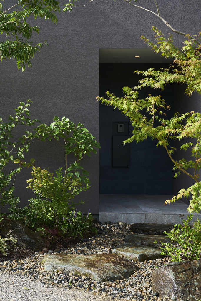 地域に開かれた店舗と、プライバシーを保ちながら外部環境と緩やかにつながる住まいを併設した店舗併用住宅である。1階は周辺環境へと視線と動線を拡張するように外周部へ庭を配置し、店舗空間が街ににじみ出す構成としている。一方、2階の住宅部分では空間構成を反転させ、中央に庭を据え、諸室がそれを取り囲むコートハウス形式を採用した。外周に庭をもつ1階と、内側に庭を抱く2階。この図と地が反転した構成によって、建築は地域との接続と生活の内側への静かな広がりという、異なる性格を同居させている。