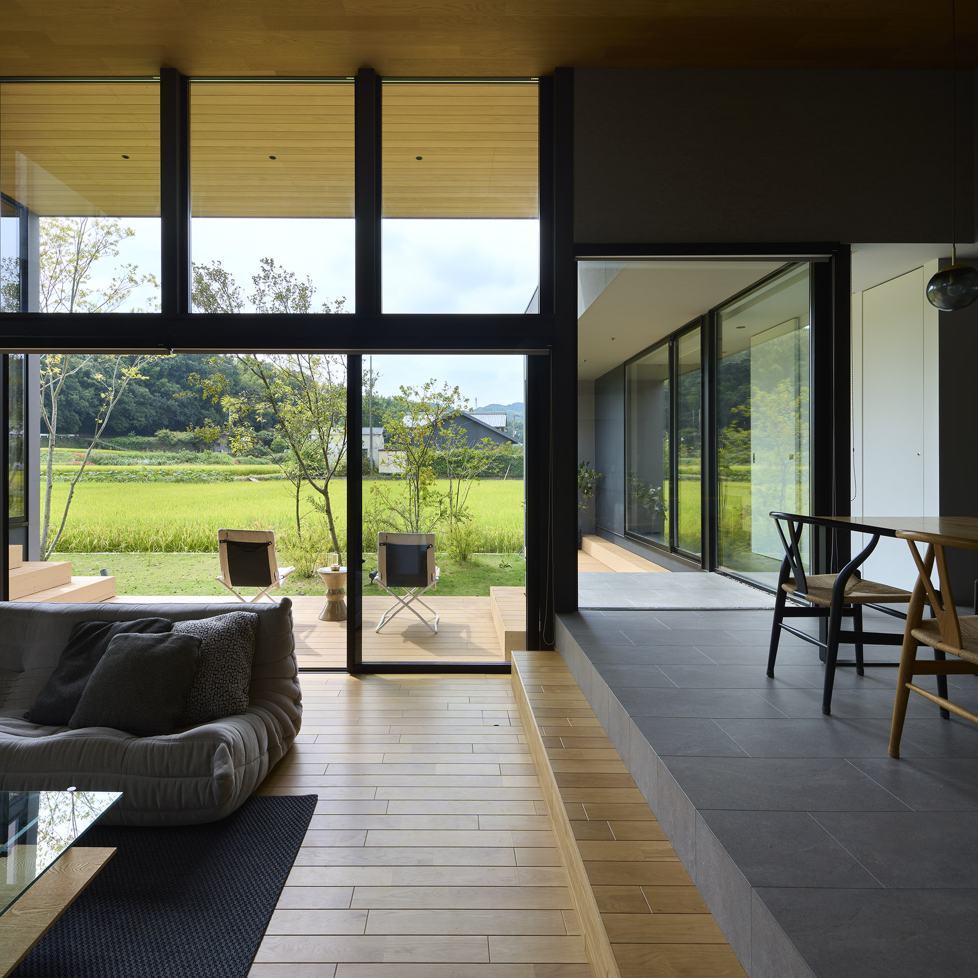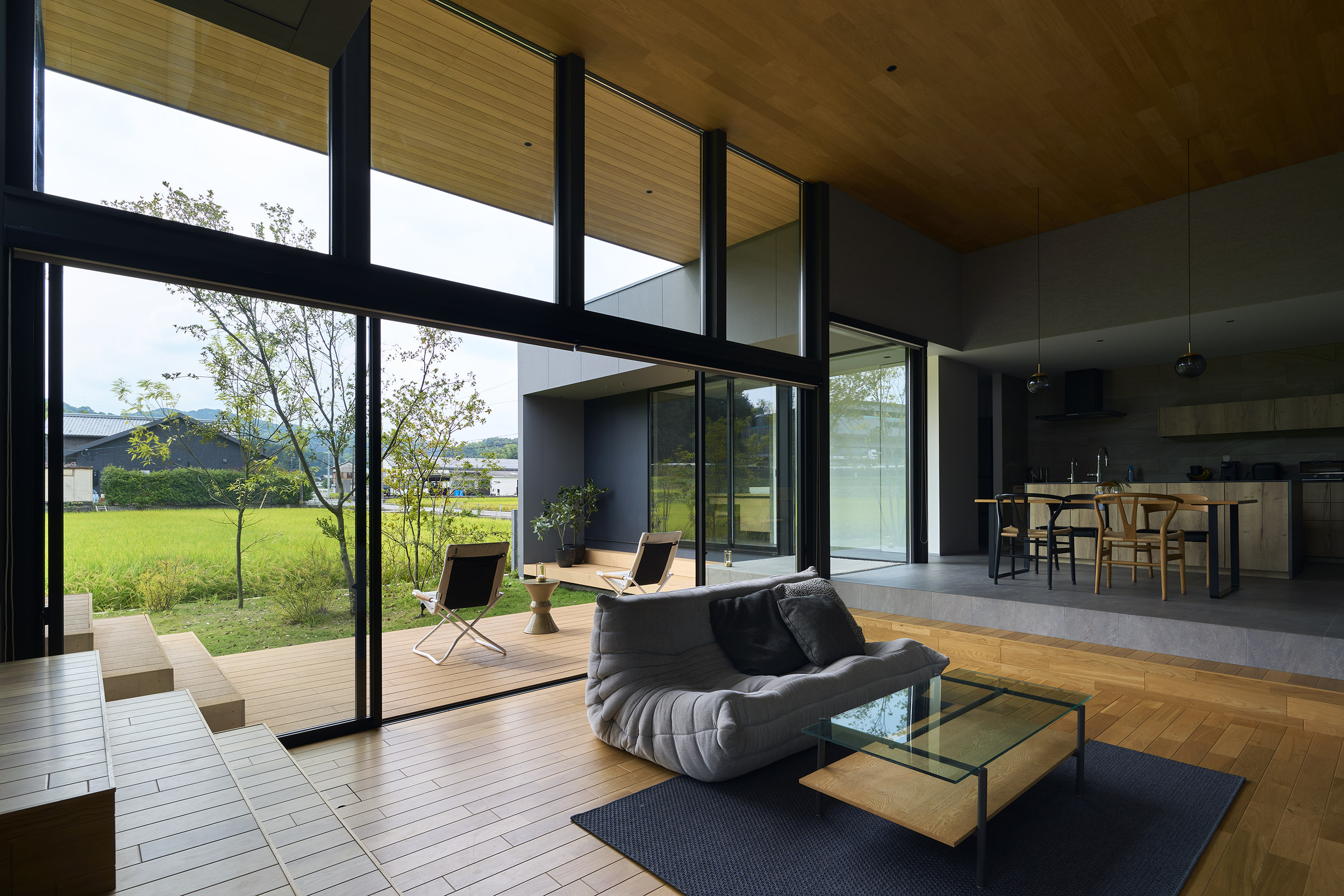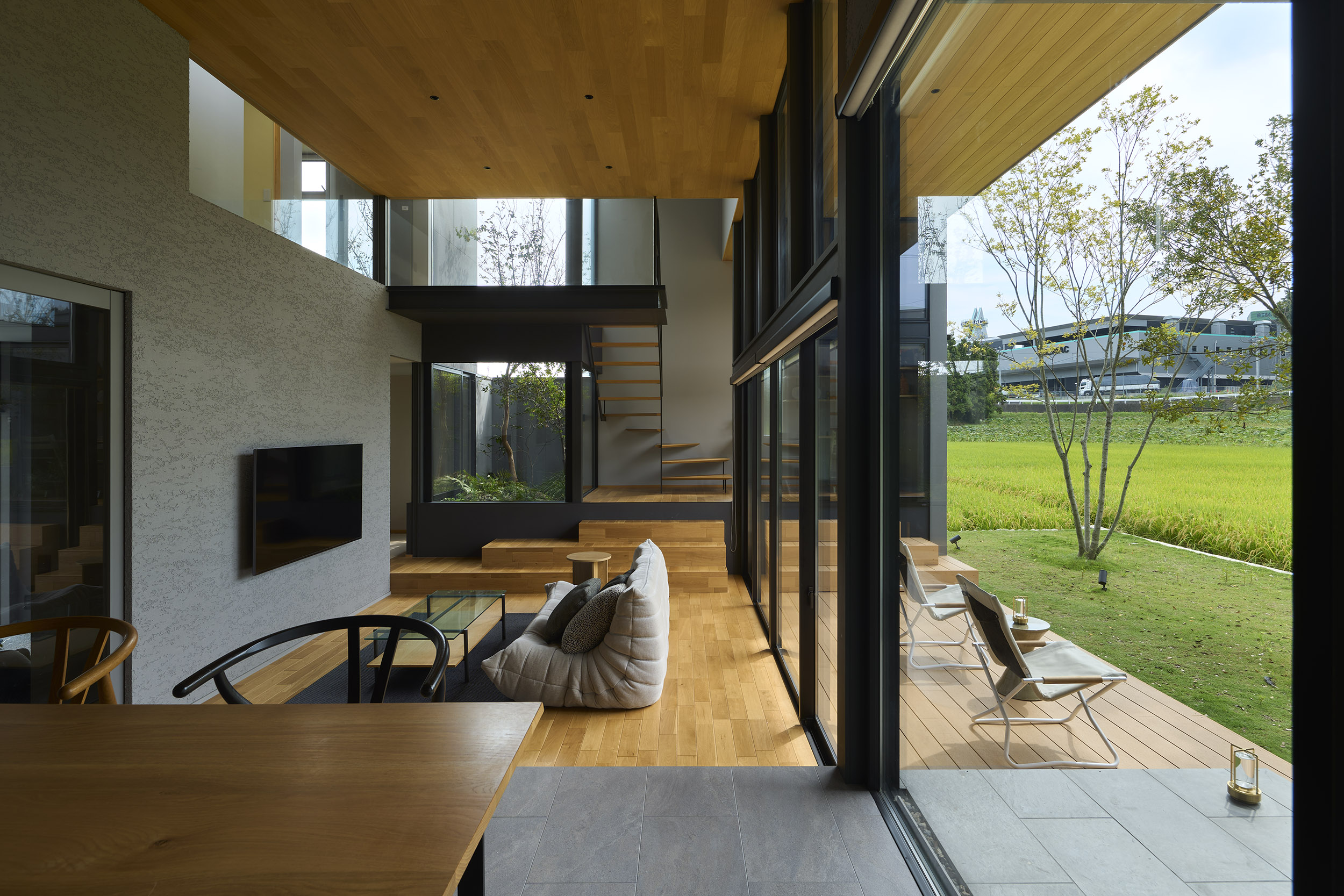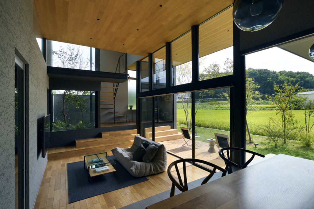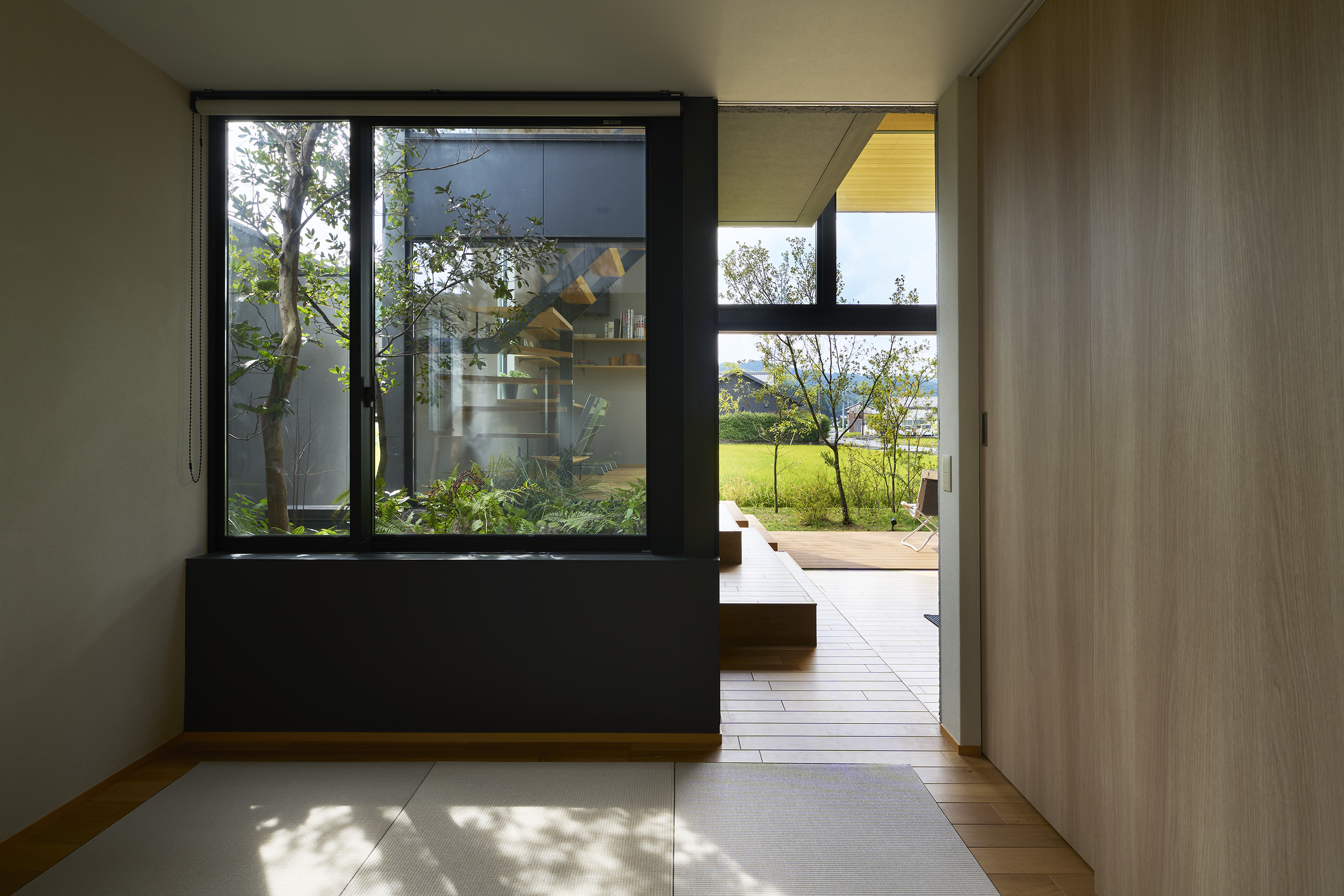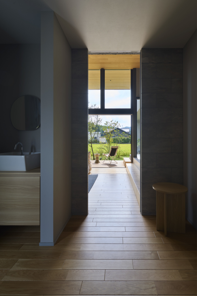 東と西にも開口を連続させ、視線の抜けはひとつの方向に依存せず、時間の移ろいとともに変化する風景を受け入れていく。開口に沿って設けたテラスは、内部と庭をやわらかく媒介し、とりわけ南側の深い庇の下では、内と外の境界が曖昧になり、季節や天気に応じて居場所が移動するような滞在が可能となる。
