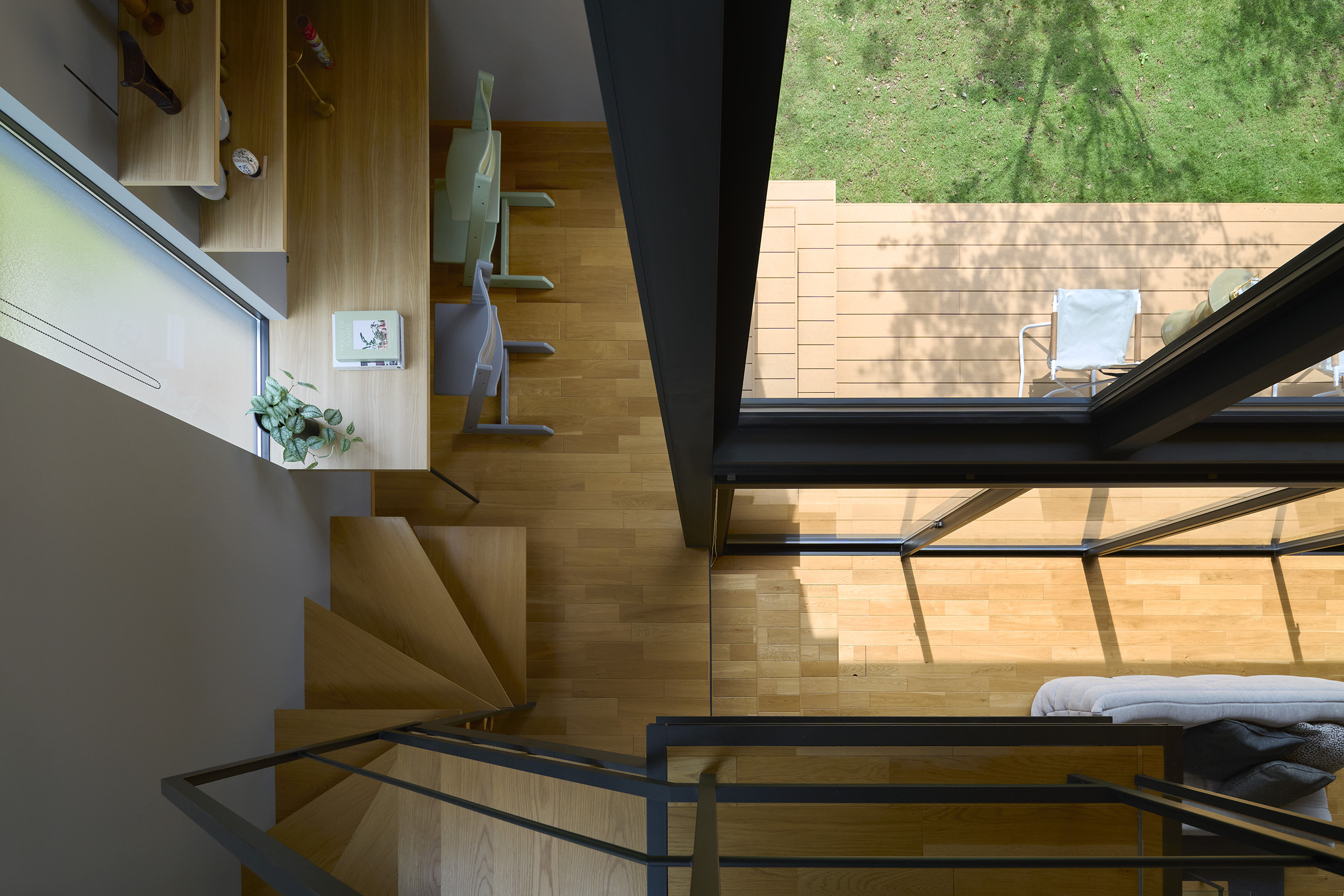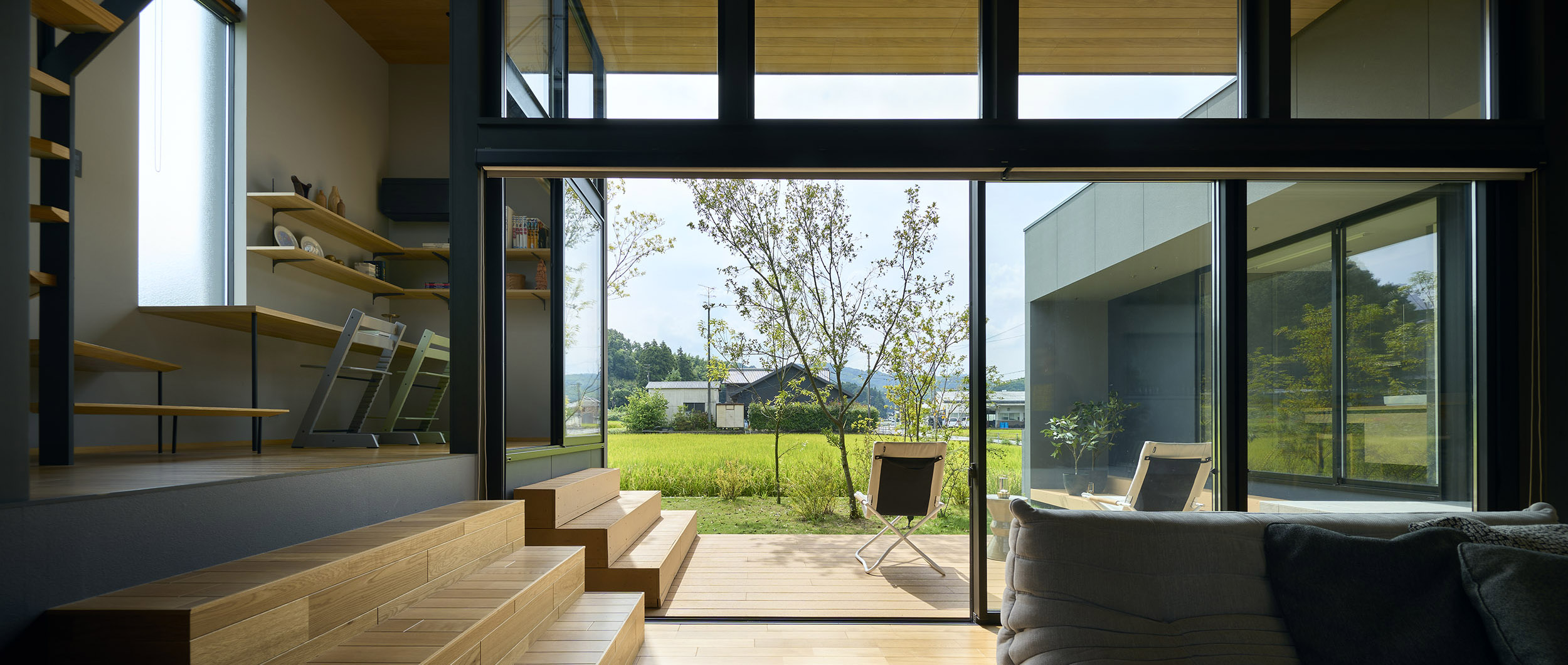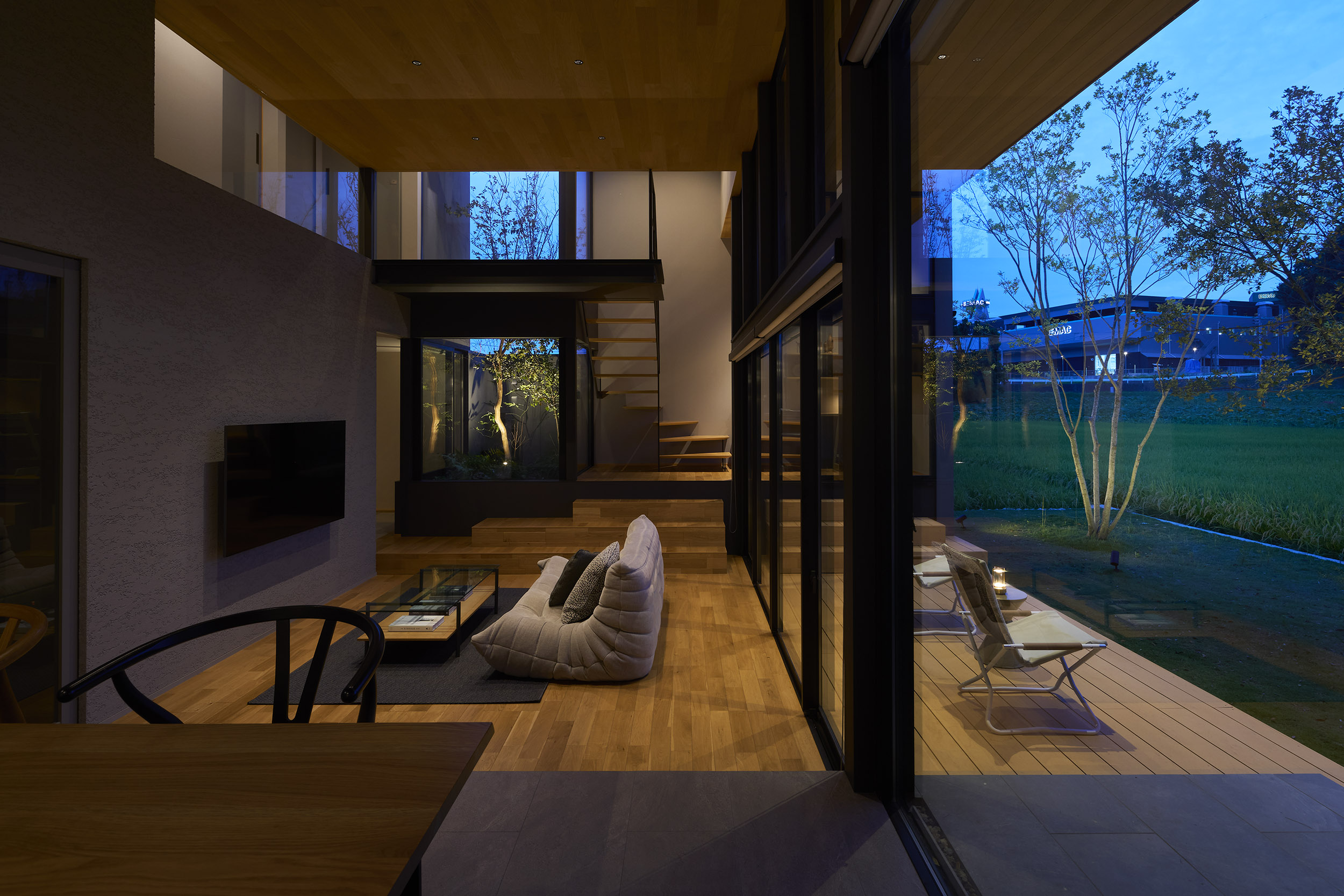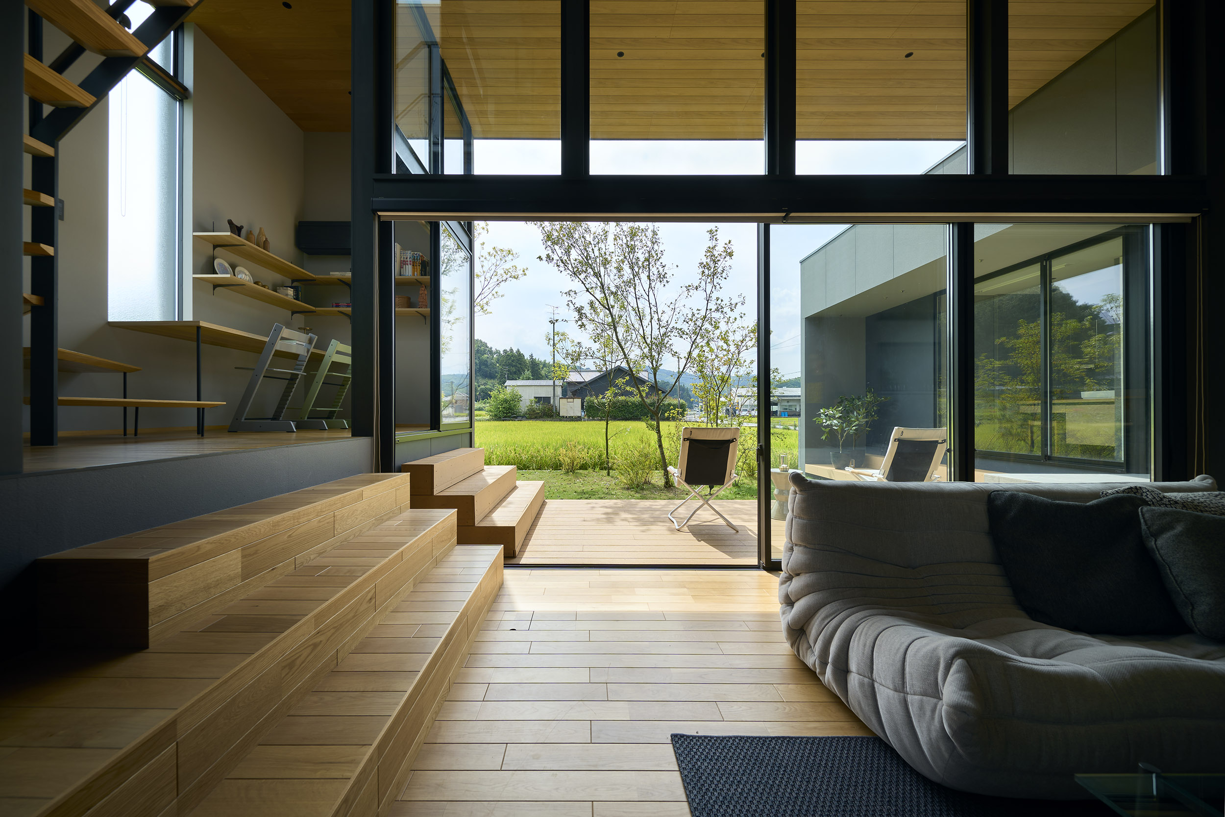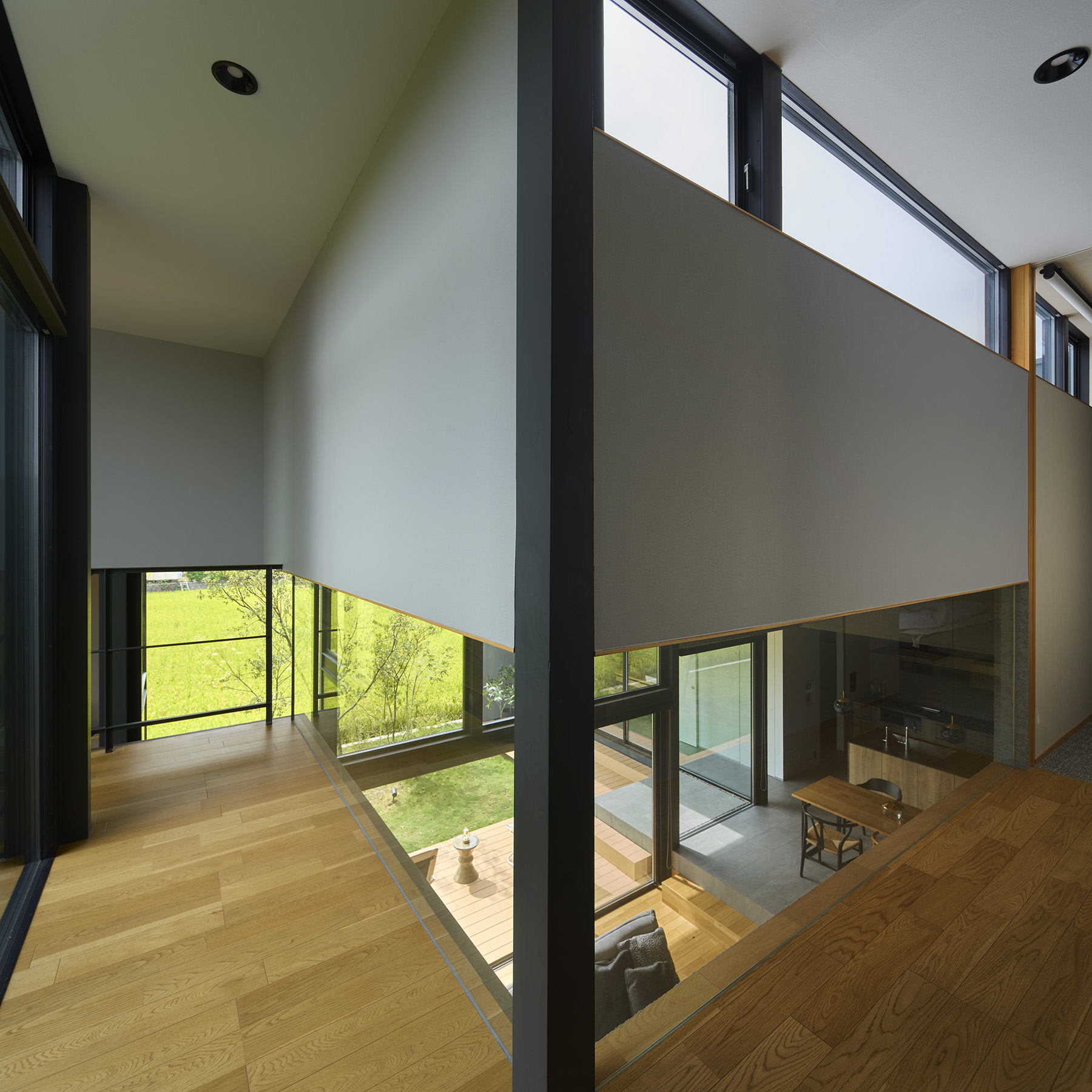 東と西にも開口を連続させ、視線の抜けはひとつの方向に依存せず、時間の移ろいとともに変化する風景を受け入れていく。開口に沿って設けたテラスは、内部と庭をやわらかく媒介し、とりわけ南側の深い庇の下では、内と外の境界が曖昧になり、季節や天気に応じて居場所が移動するような滞在が可能となる。