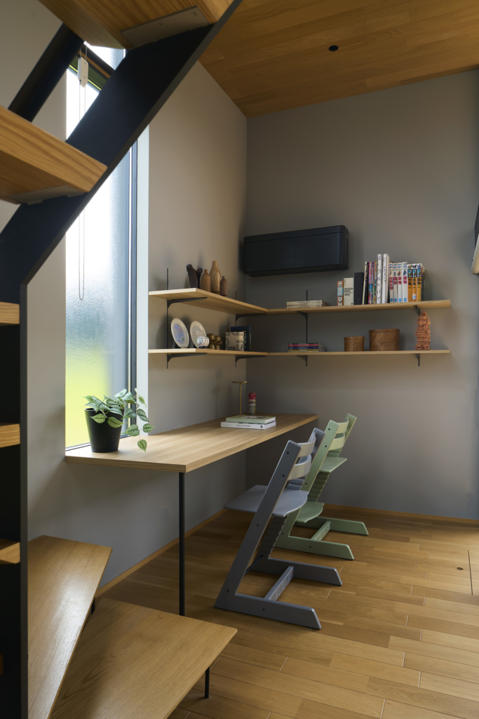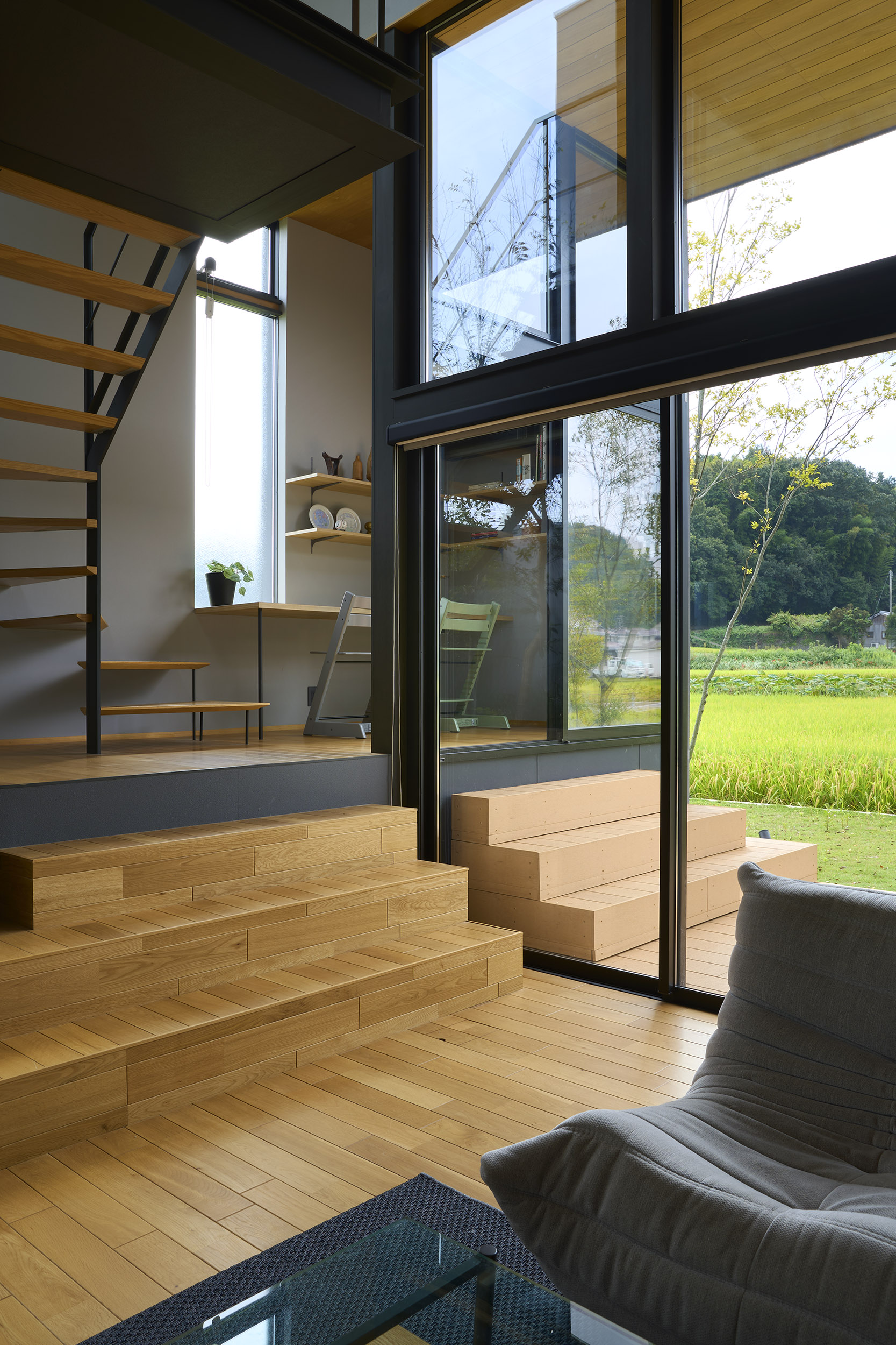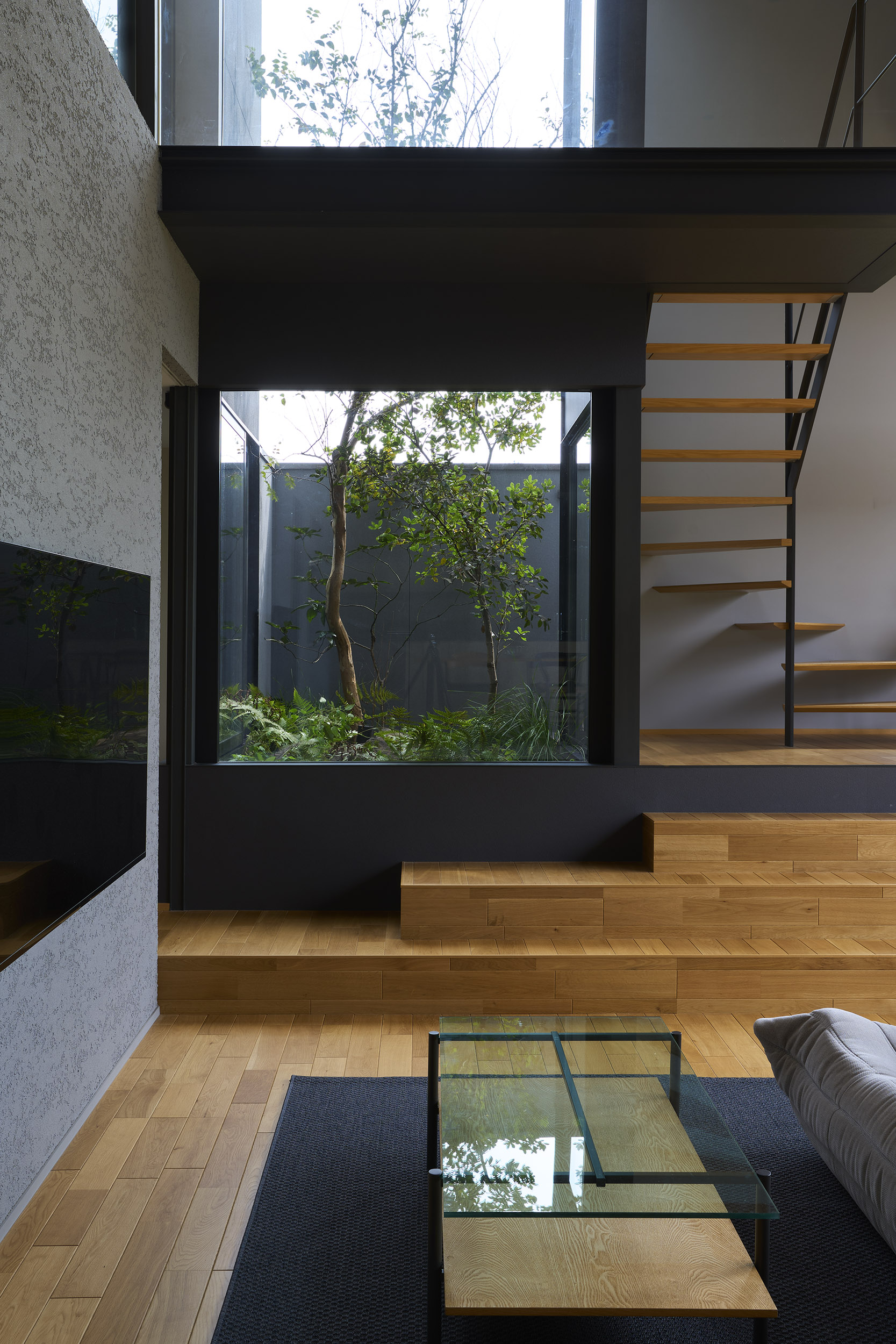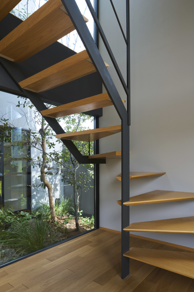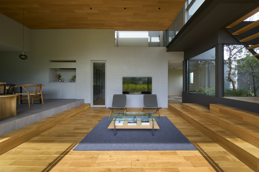 まずこの住宅はまず南へ向けて大きく開く。そこに据えられたリビングは、光と景色を受け止める中心としてあり、周囲の諸室が半階上がったレベルでそれを包み込む。視線の高さがずれることで、外へ開く感覚と、内部に守られる感覚が同時に立ち現れ、住まいの中にひとつの地形のような風景が生まれている。