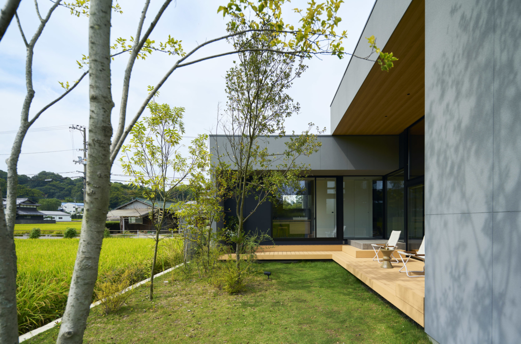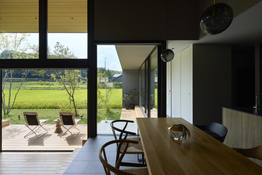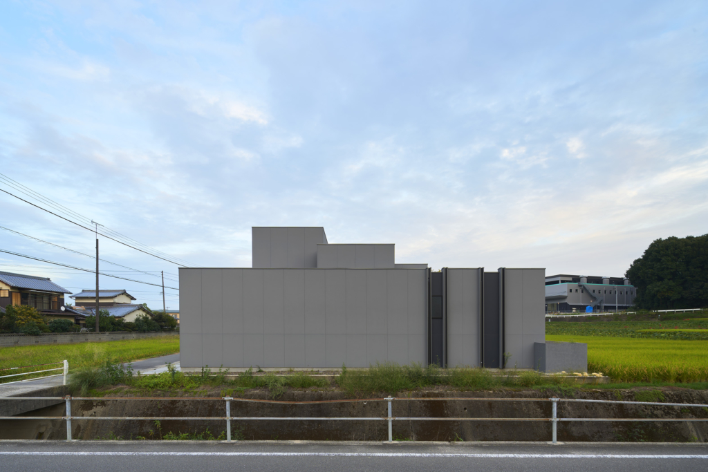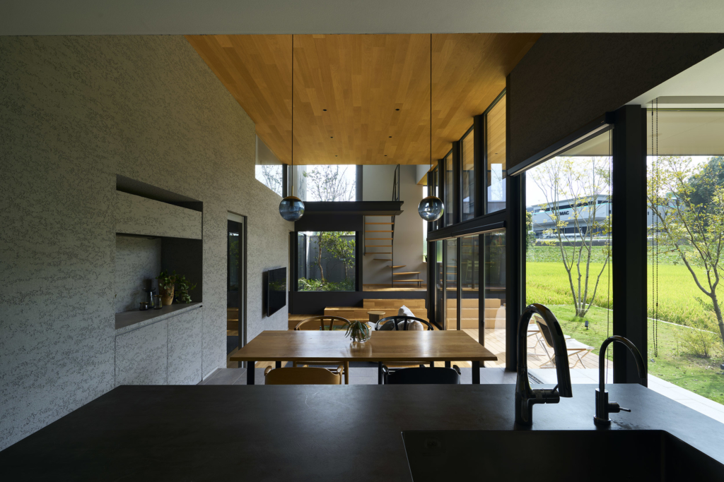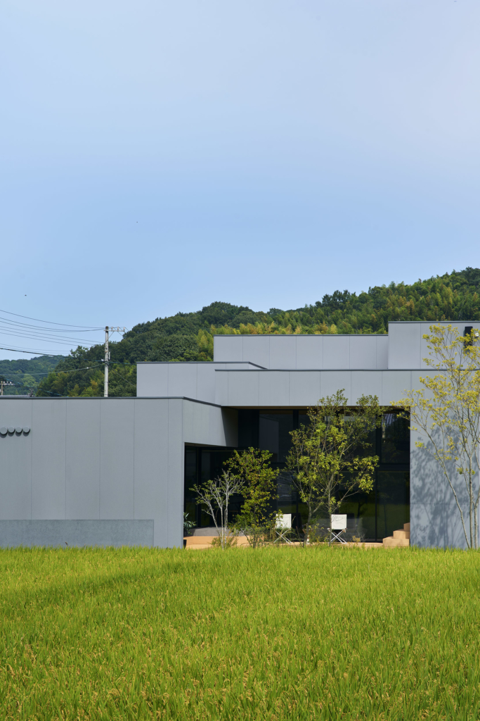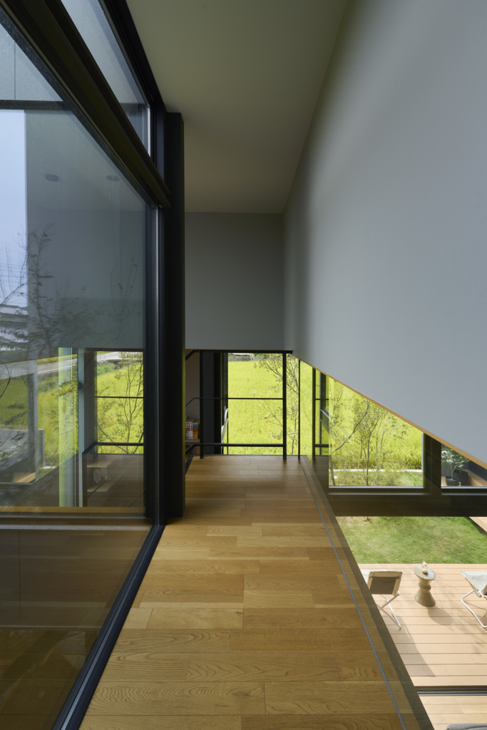 今治市西部の静かな田園地帯に位置し、親族から受け継がれた土地に新たな住まいを描く計画である。風が稲穂を揺らし、遠くの山並みがゆるやかに地平を形づくる、その豊かな外部環境は、この住宅が開くべき方向性を静かに示している。しかし同時に、敷地の近くには幹線道路が走り、周囲との距離感や視線の扱いが慎重に求められる場所でもあった。