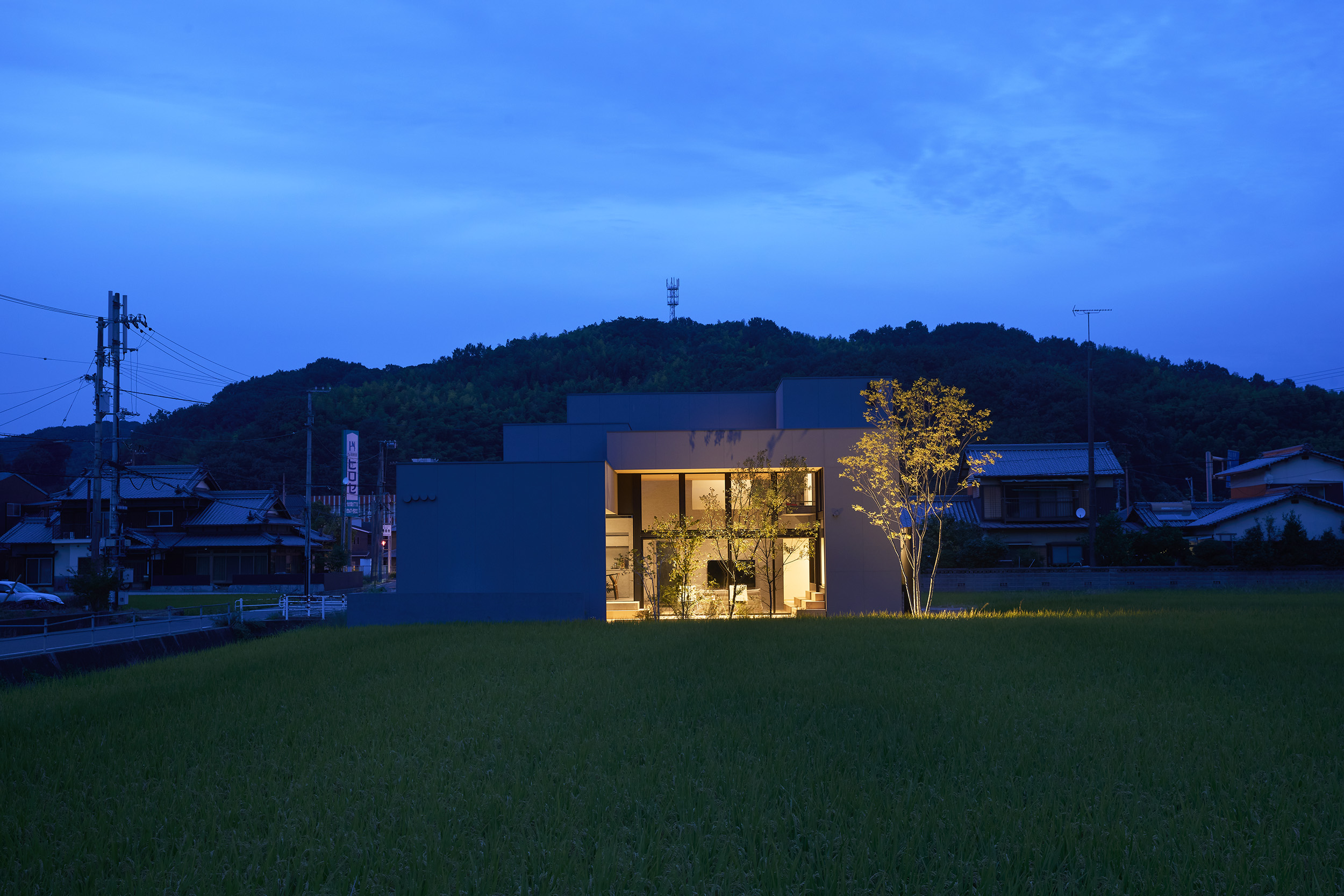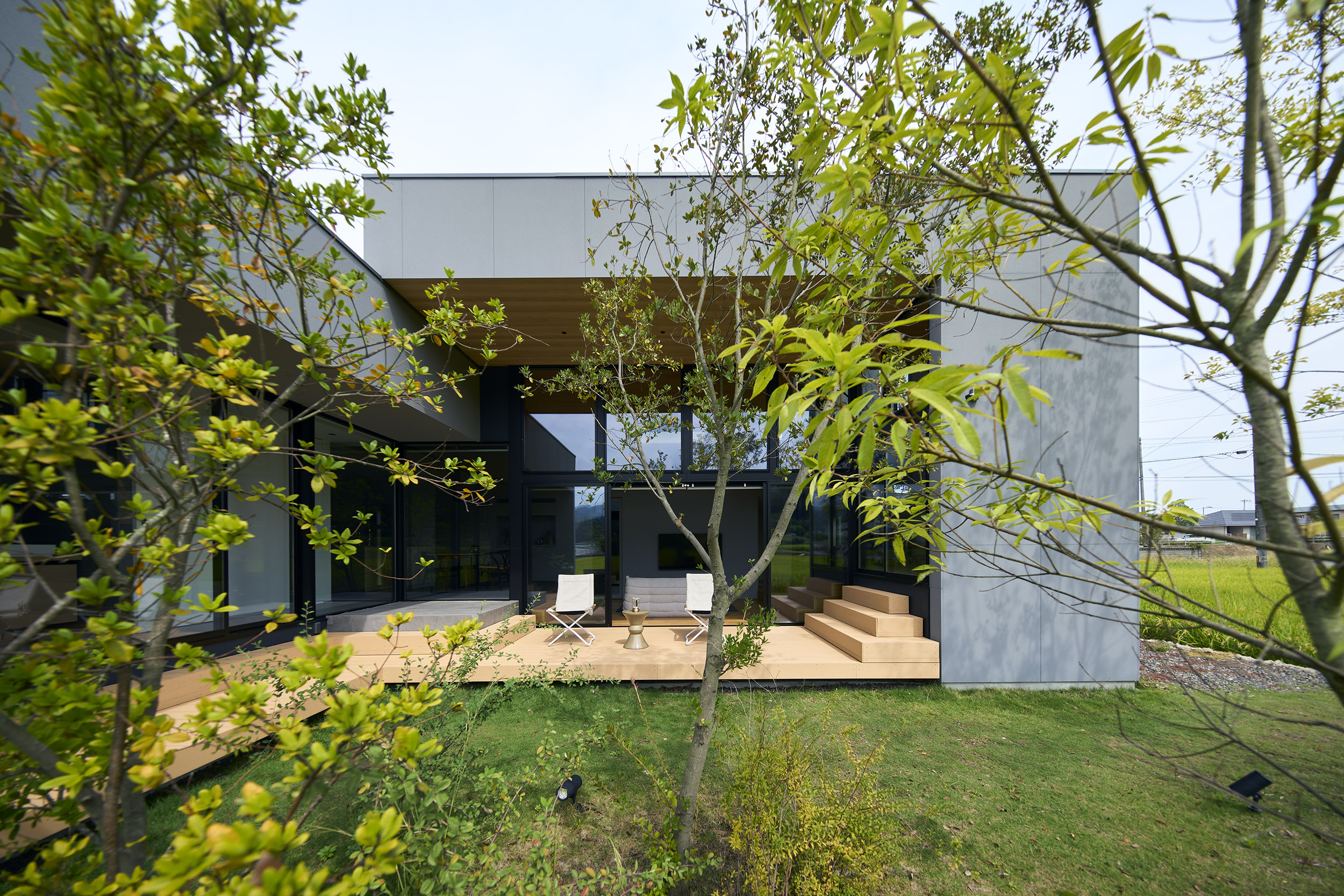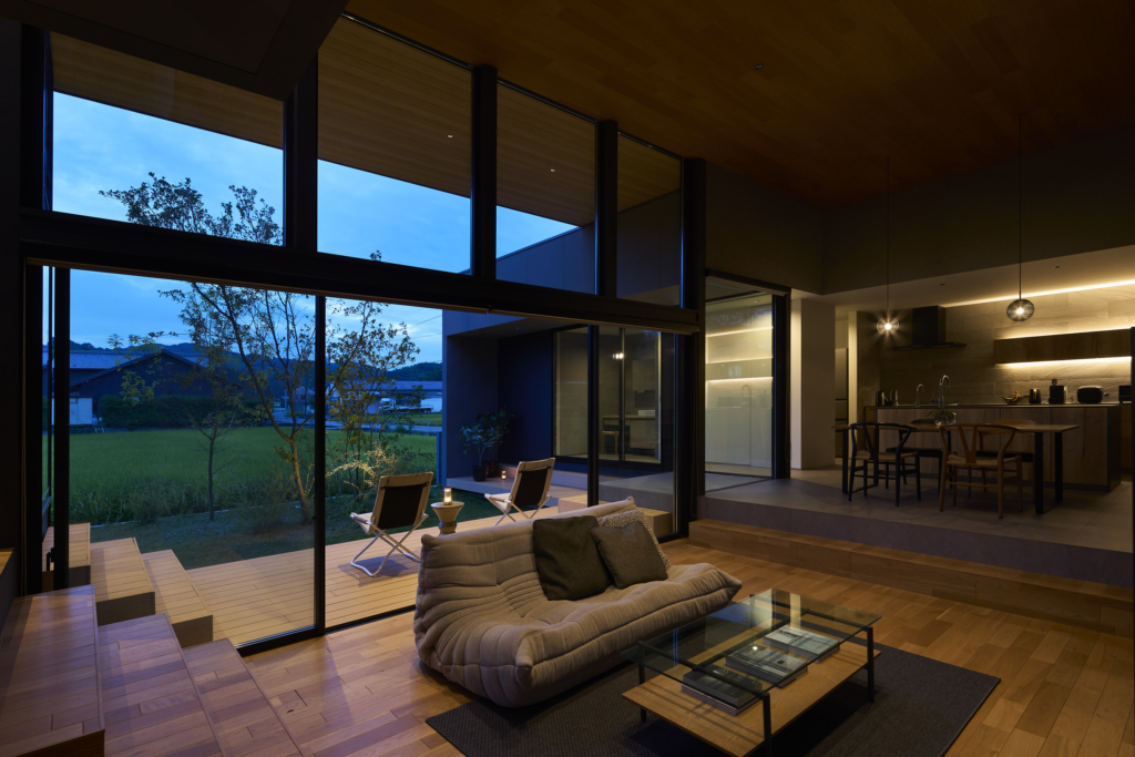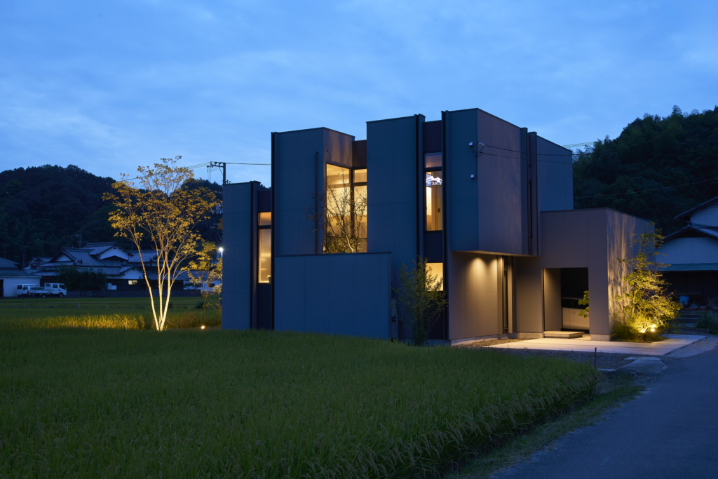 今治市西部の静かな田園地帯に位置し、親族から受け継がれた土地に新たな住まいを描く計画である。風が稲穂を揺らし、遠くの山並みがゆるやかに地平を形づくる、その豊かな外部環境は、この住宅が開くべき方向性を静かに示している。しかし同時に、敷地の近くには幹線道路が走り、周囲との距離感や視線の扱いが慎重に求められる場所でもあった。