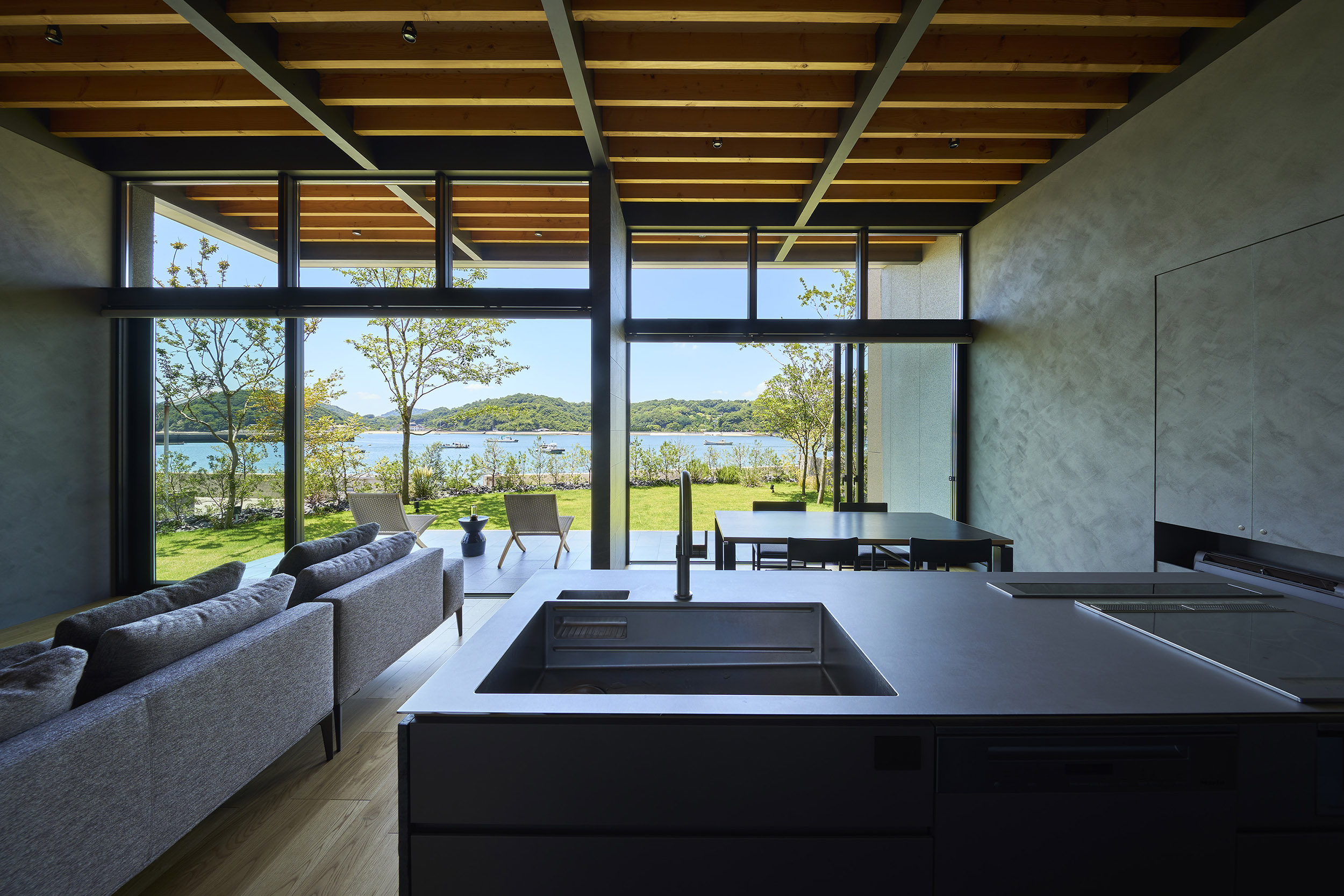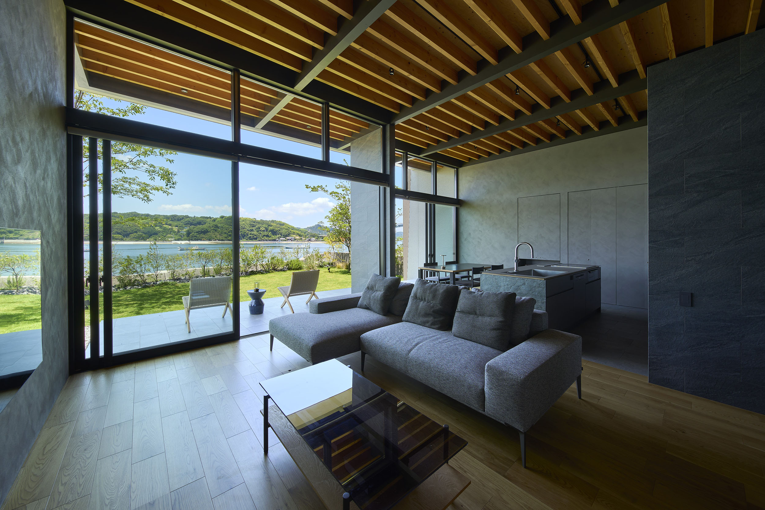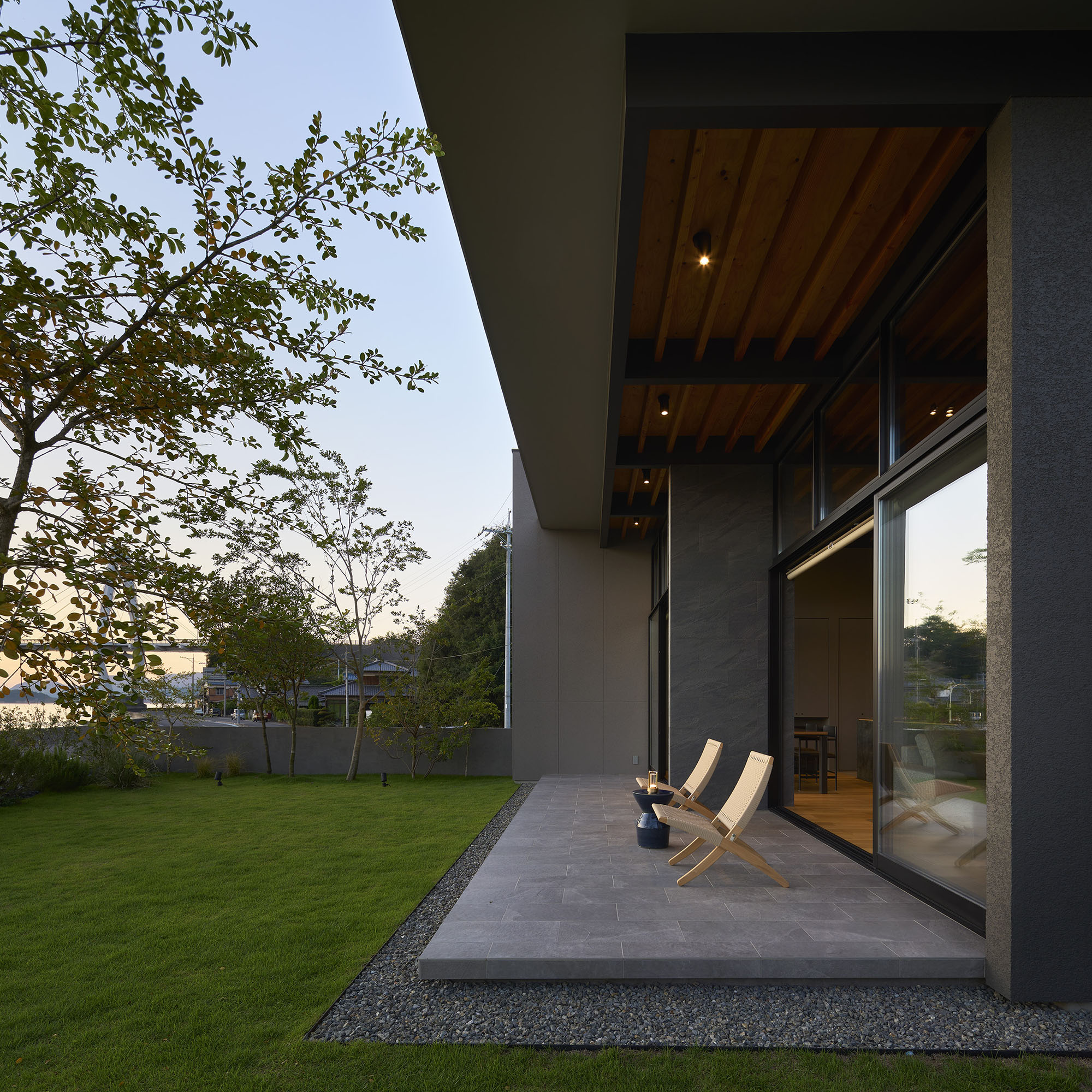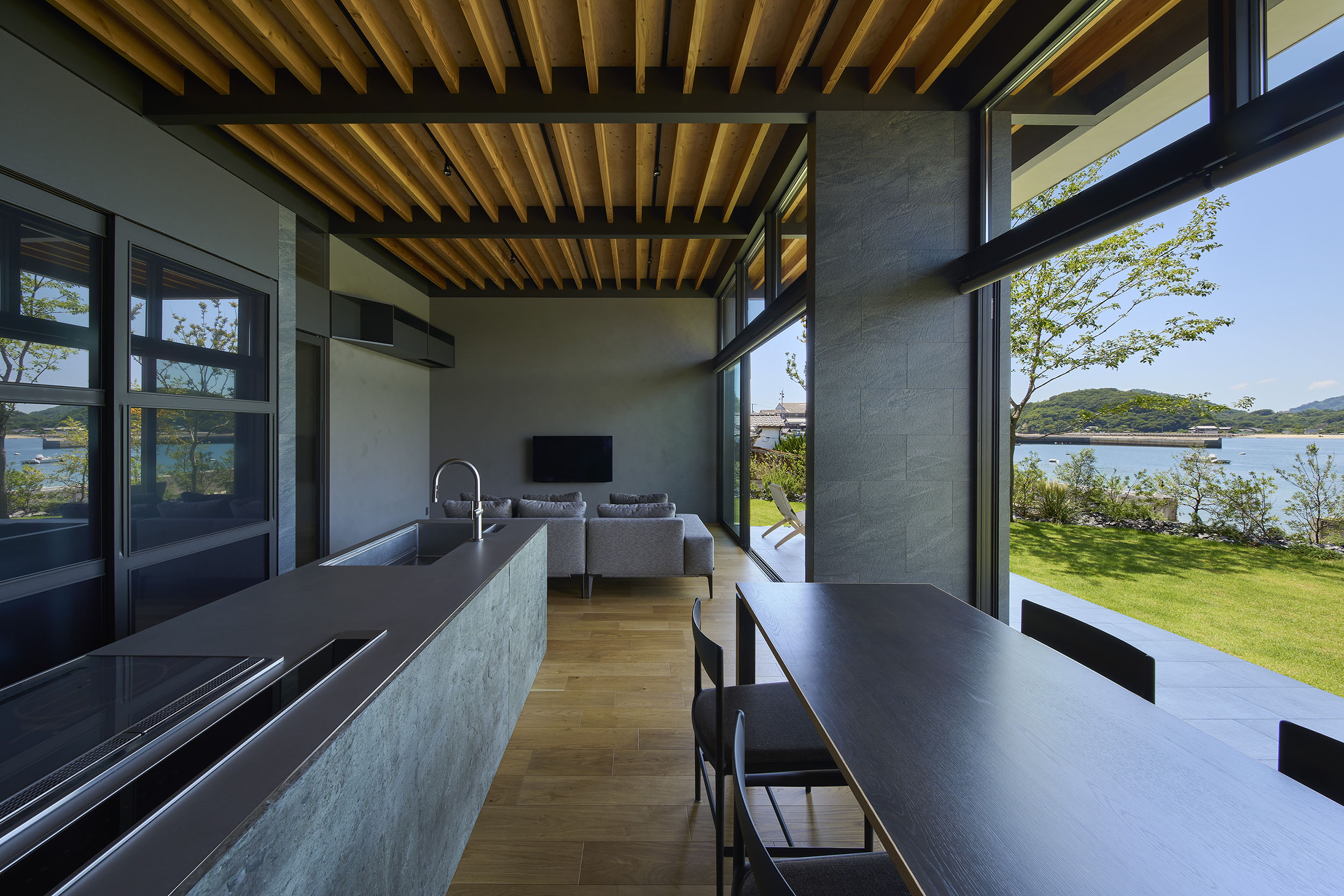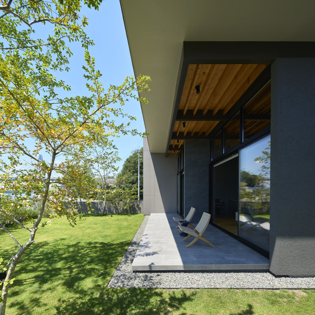 前面道路の喧噪をやわらげるように、敷地には大きな庭を設け、植栽の層を重ねることで視線を和らげつつ、海を望む開放感を確保している。リビングに面したテラスには三メートルを超える深い軒を伸ばし、内と外をつなぐもう一つの居間=アウターリビングとして計画した。軒裏の可動簾は、西日を調えながら、季節ごとの光を繊細に演出する。