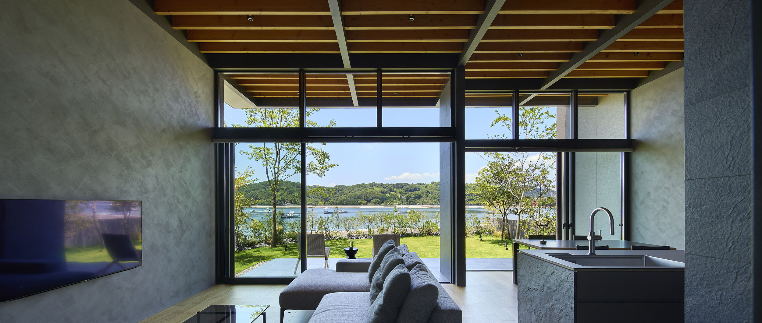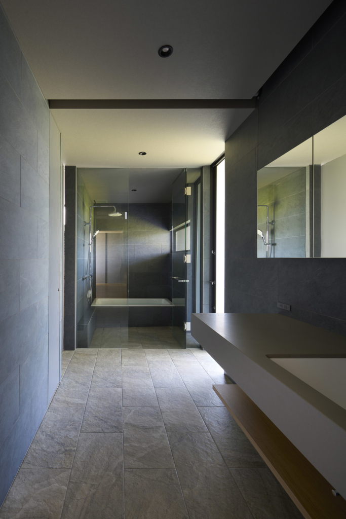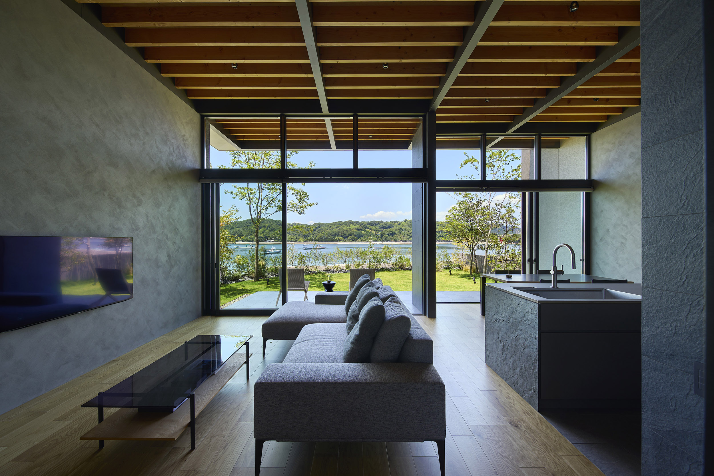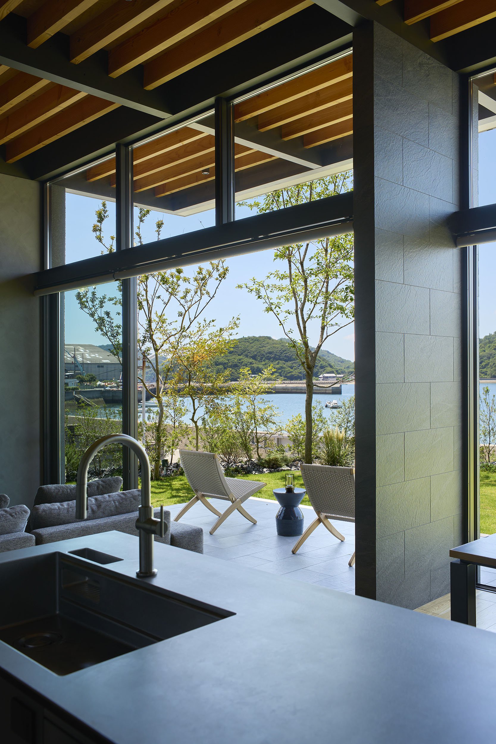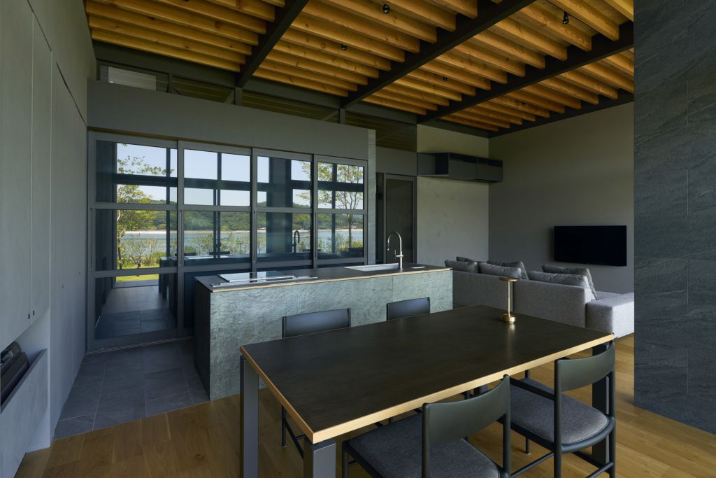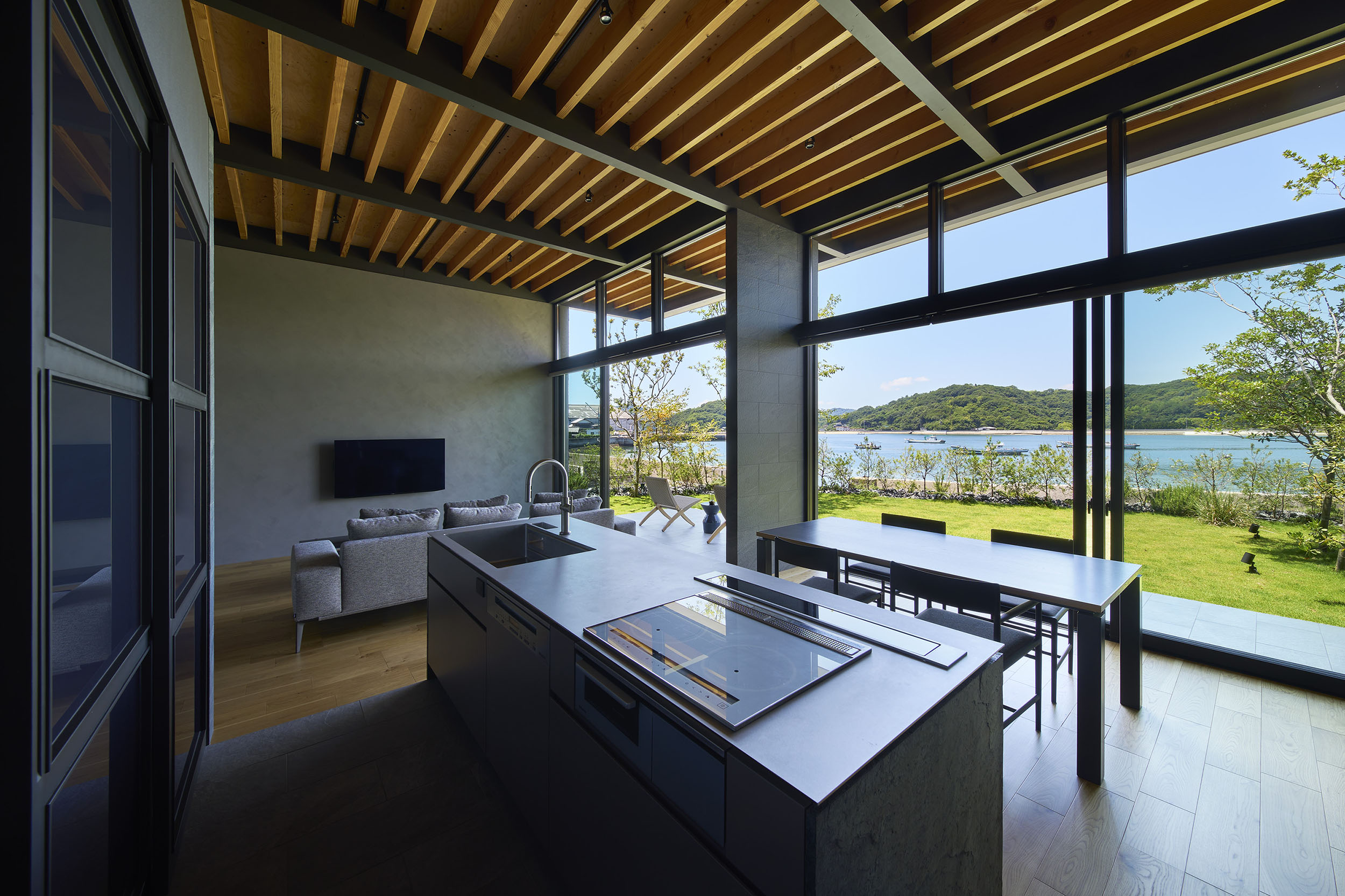 前面道路の喧噪をやわらげるように、敷地には大きな庭を設け、植栽の層を重ねることで視線を和らげつつ、海を望む開放感を確保している。リビングに面したテラスには三メートルを超える深い軒を伸ばし、内と外をつなぐもう一つの居間=アウターリビングとして計画した。軒裏の可動簾は、西日を調えながら、季節ごとの光を繊細に演出する。