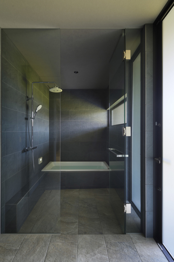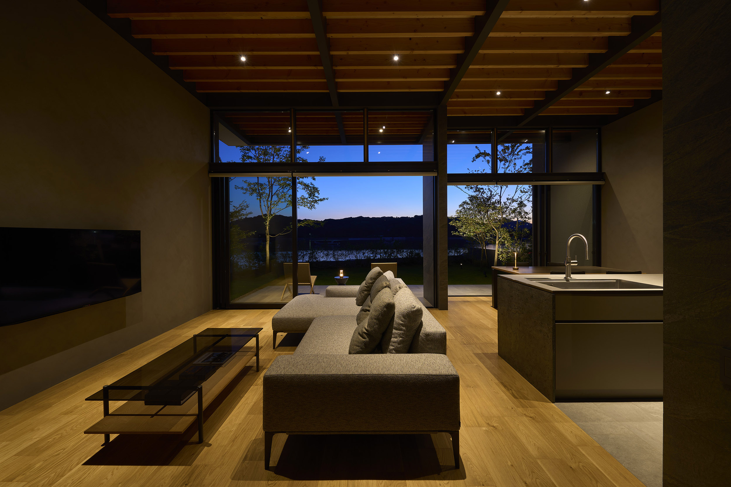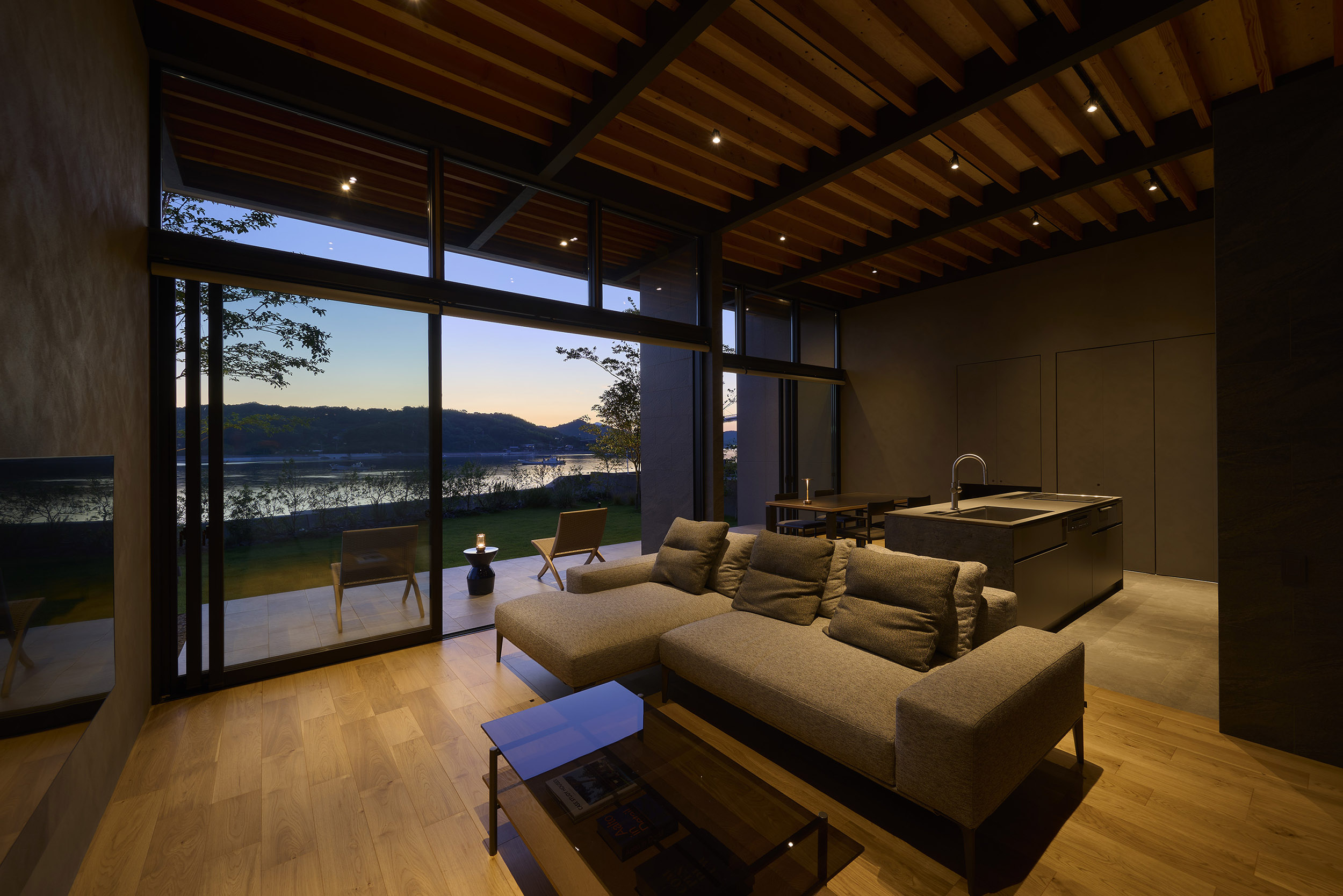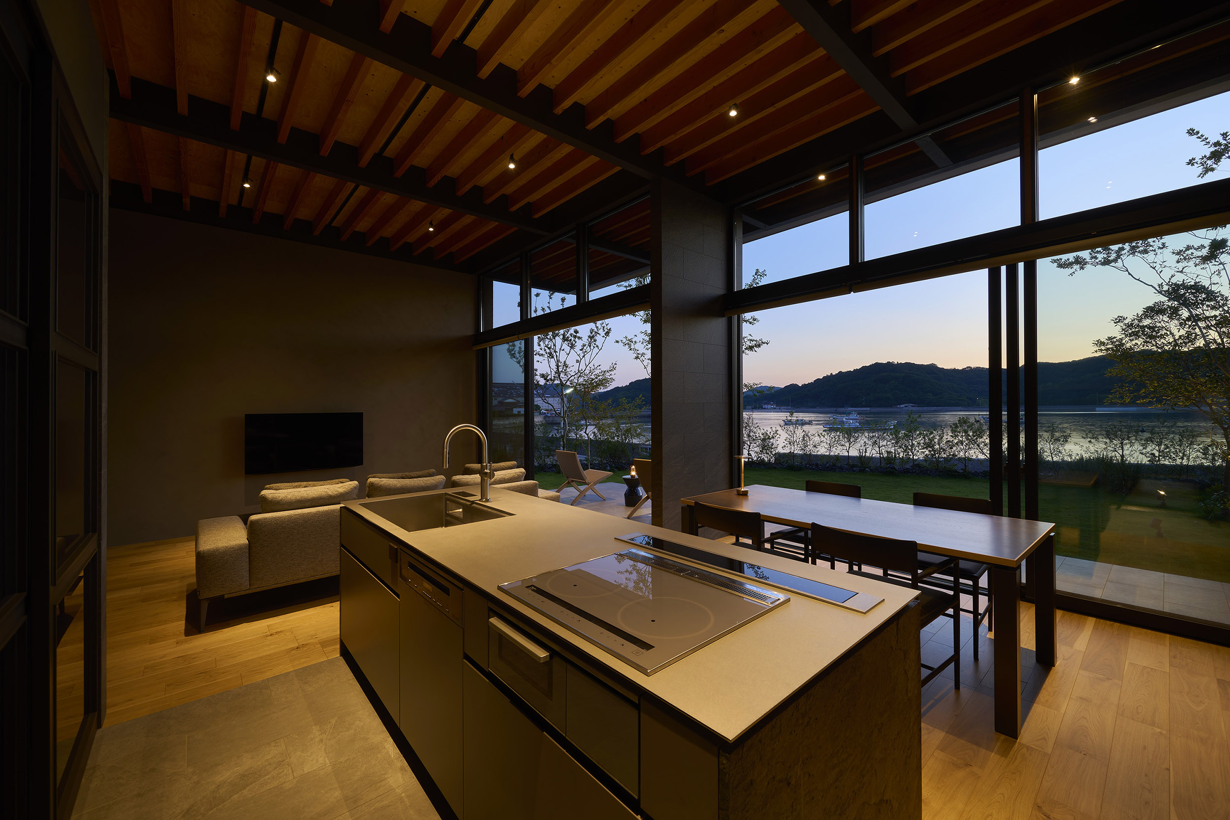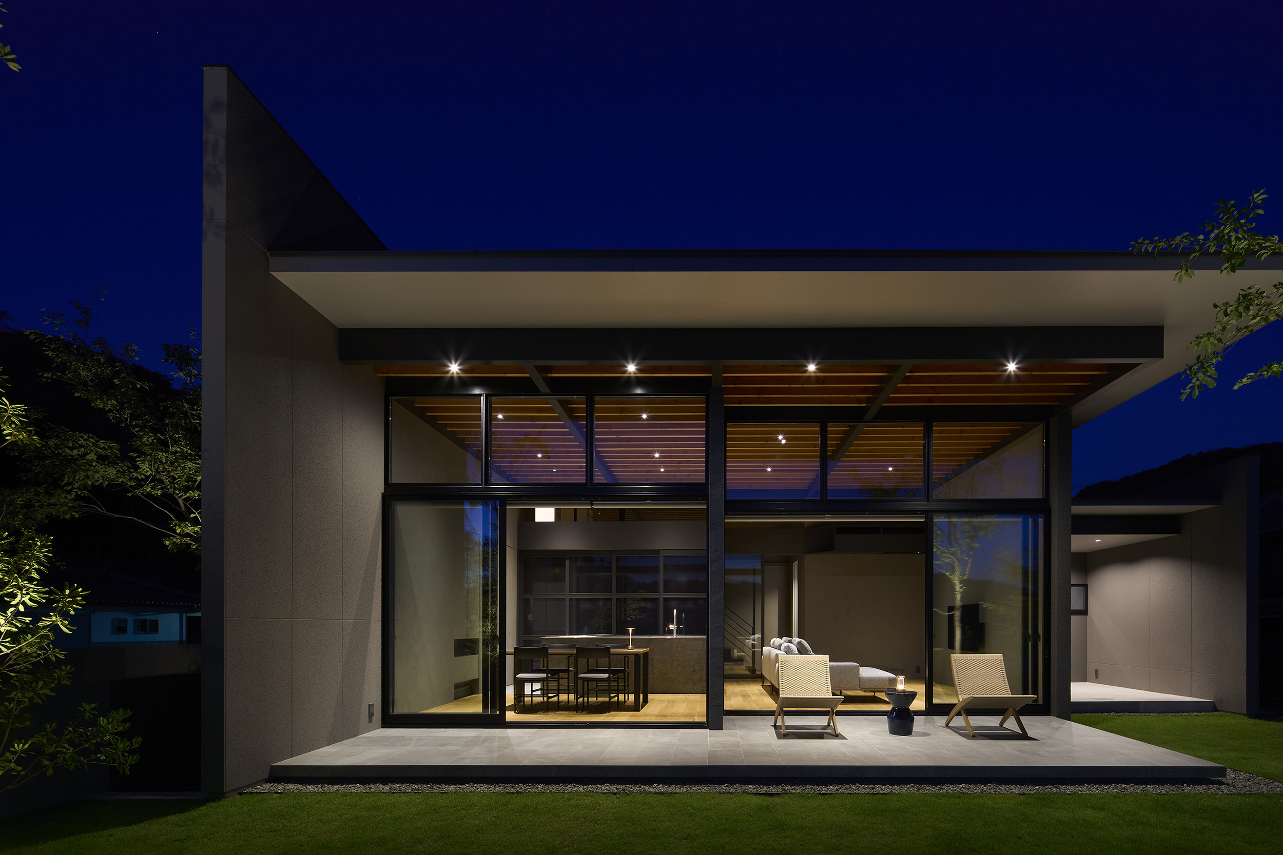 前面道路の喧噪をやわらげるように、敷地には大きな庭を設け、植栽の層を重ねることで視線を和らげつつ、海を望む開放感を確保している。リビングに面したテラスには三メートルを超える深い軒を伸ばし、内と外をつなぐもう一つの居間=アウターリビングとして計画した。軒裏の可動簾は、西日を調えながら、季節ごとの光を繊細に演出する。