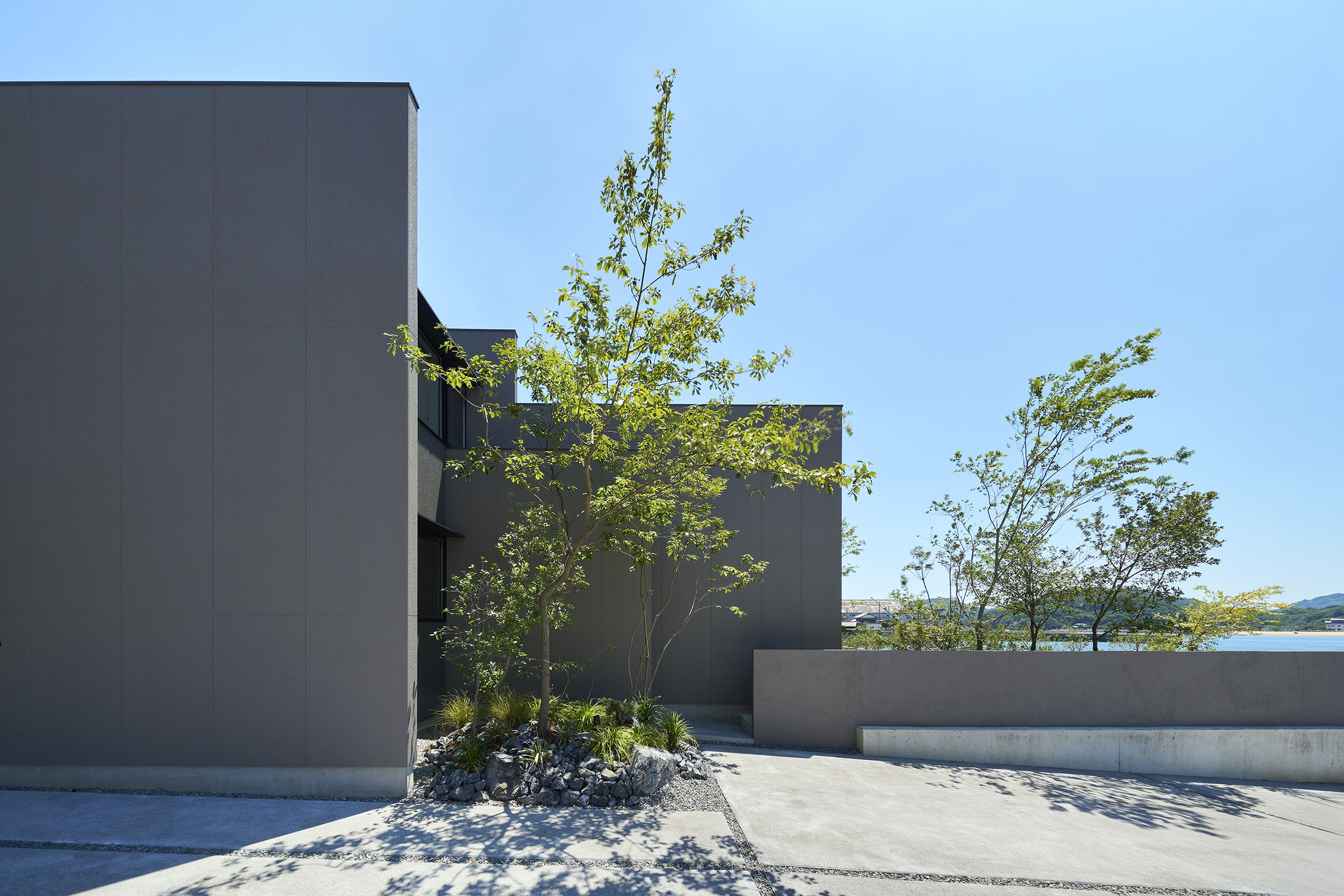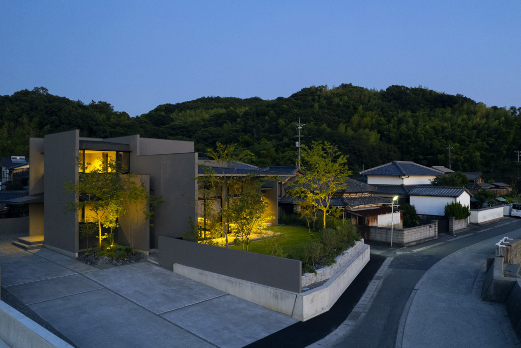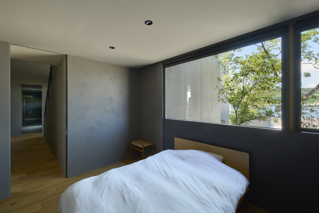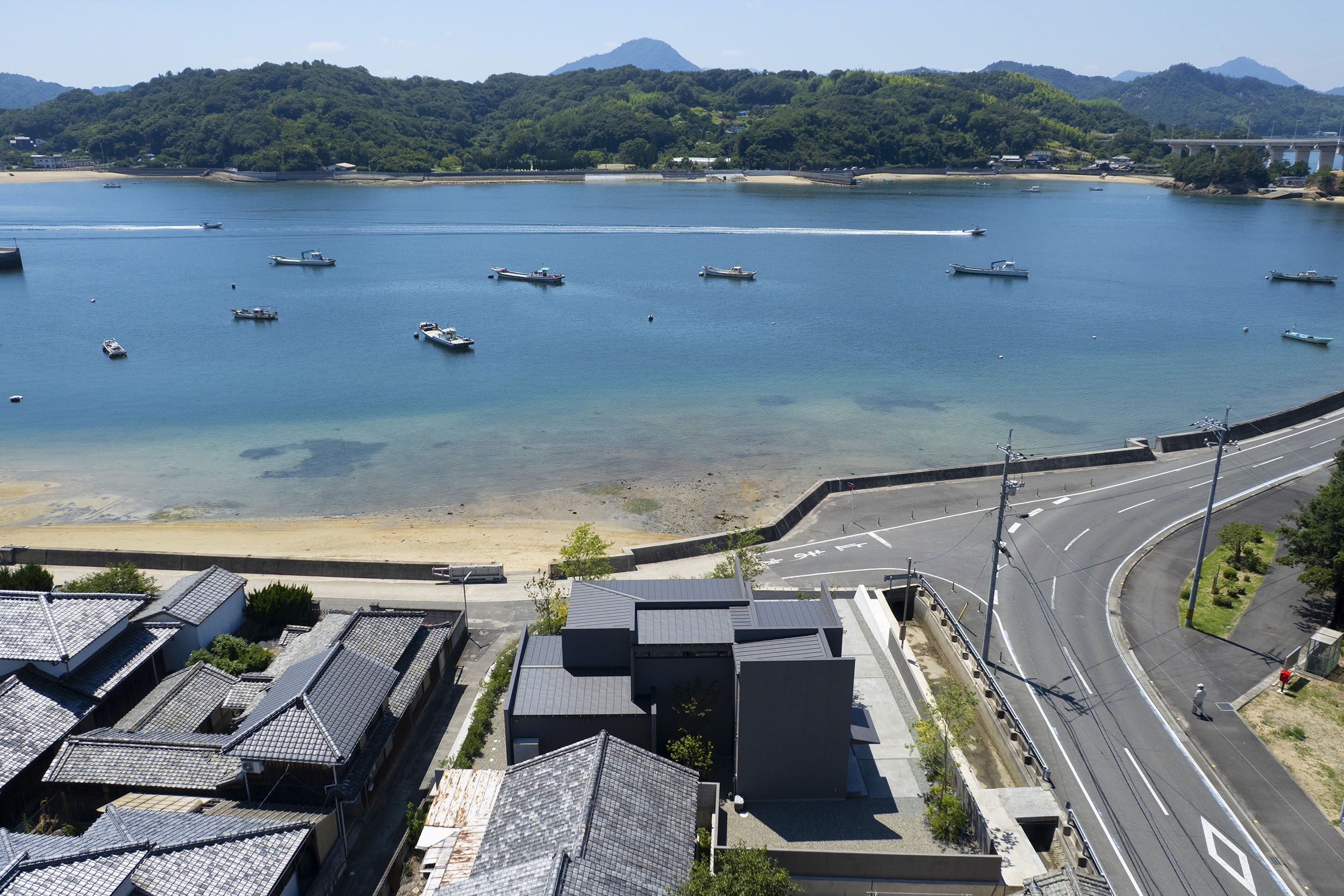 広島と愛媛を結ぶしまなみ海道のほとり、県境に寄り添う上島町に建つ住宅である。穏やかな瀬戸内の多島美が眼前に広がり、振り返れば緑濃い山並みが暮らしを包む。温暖で雨の少ないこの地の風土を受け止めながら、西から北へと移ろう光や風景を住まいに招き入れることを意図した。