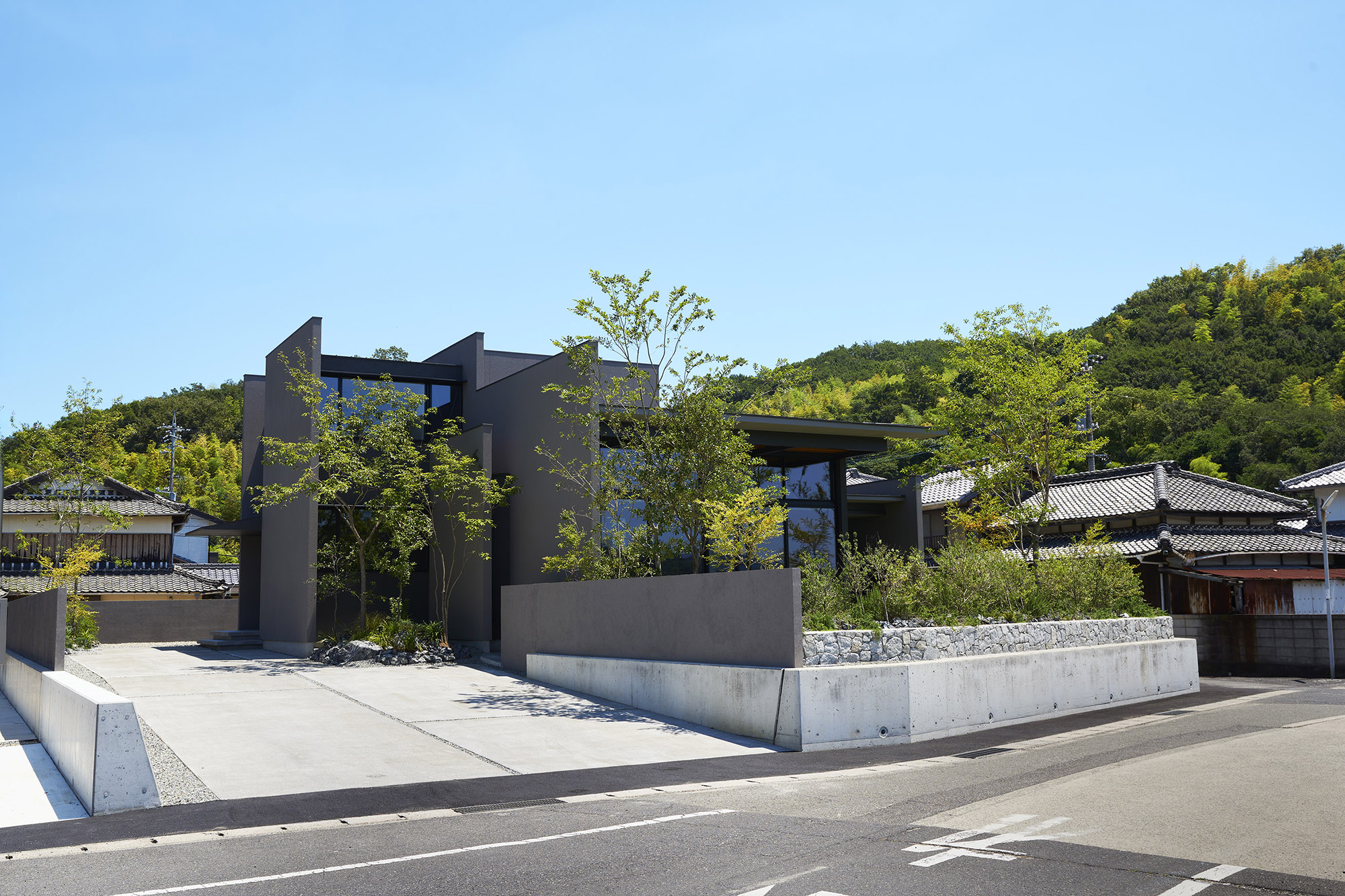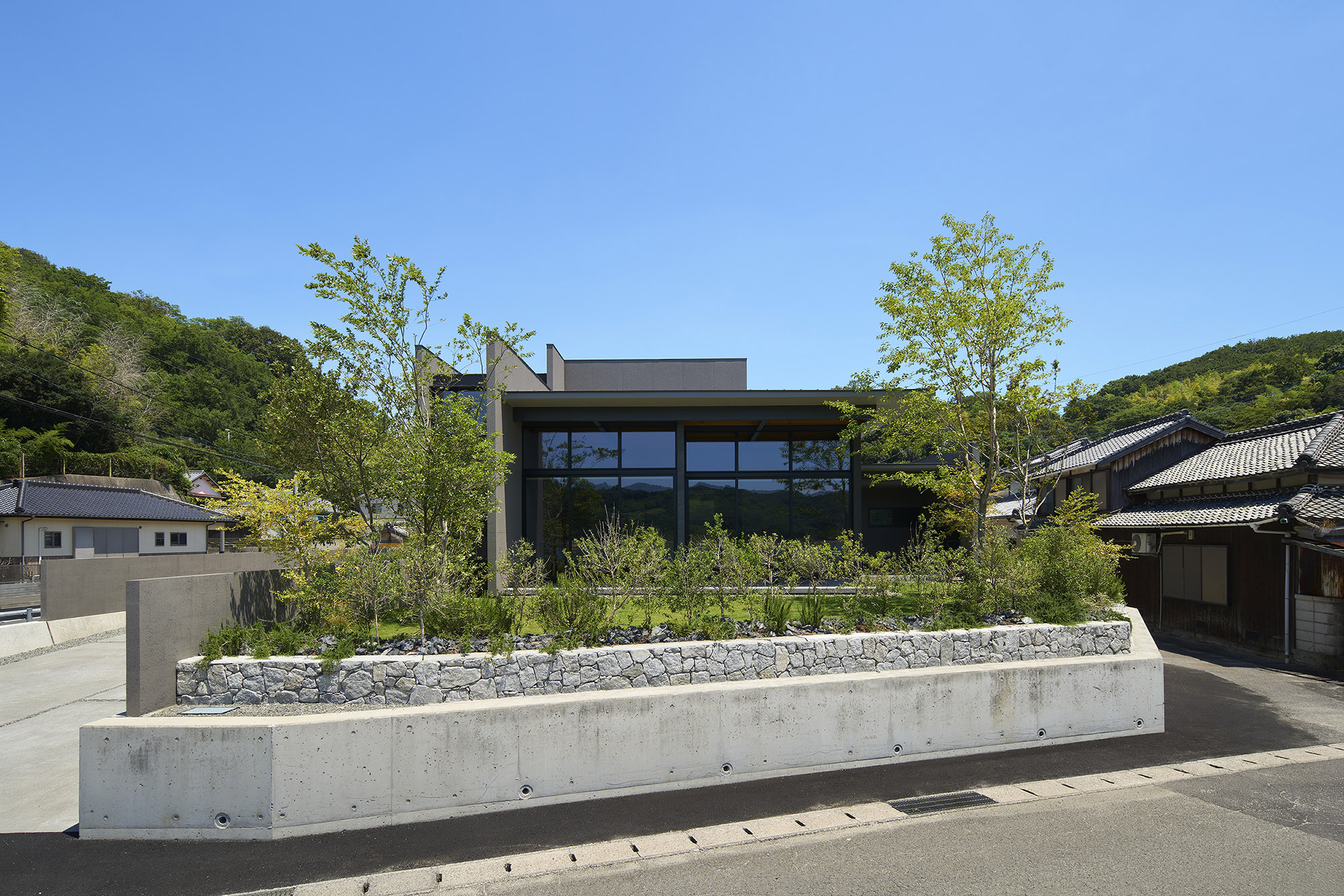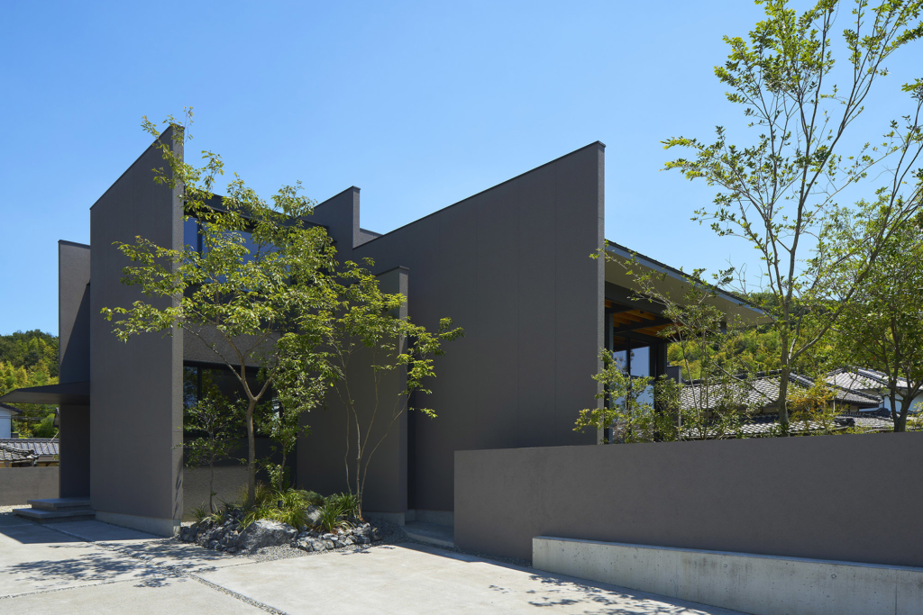広島と愛媛を結ぶしまなみ海道のほとり、県境に寄り添う上島町に建つ住宅である。穏やかな瀬戸内の多島美が眼前に広がり、振り返れば緑濃い山並みが暮らしを包む。温暖で雨の少ないこの地の風土を受け止めながら、西から北へと移ろう光や風景を住まいに招き入れることを意図した。