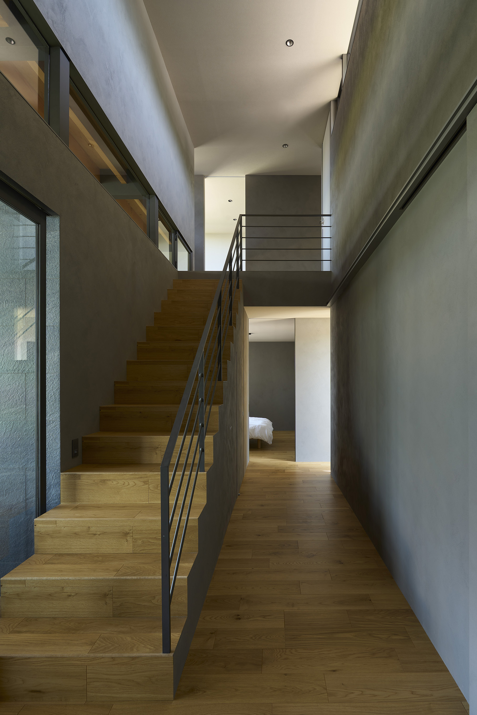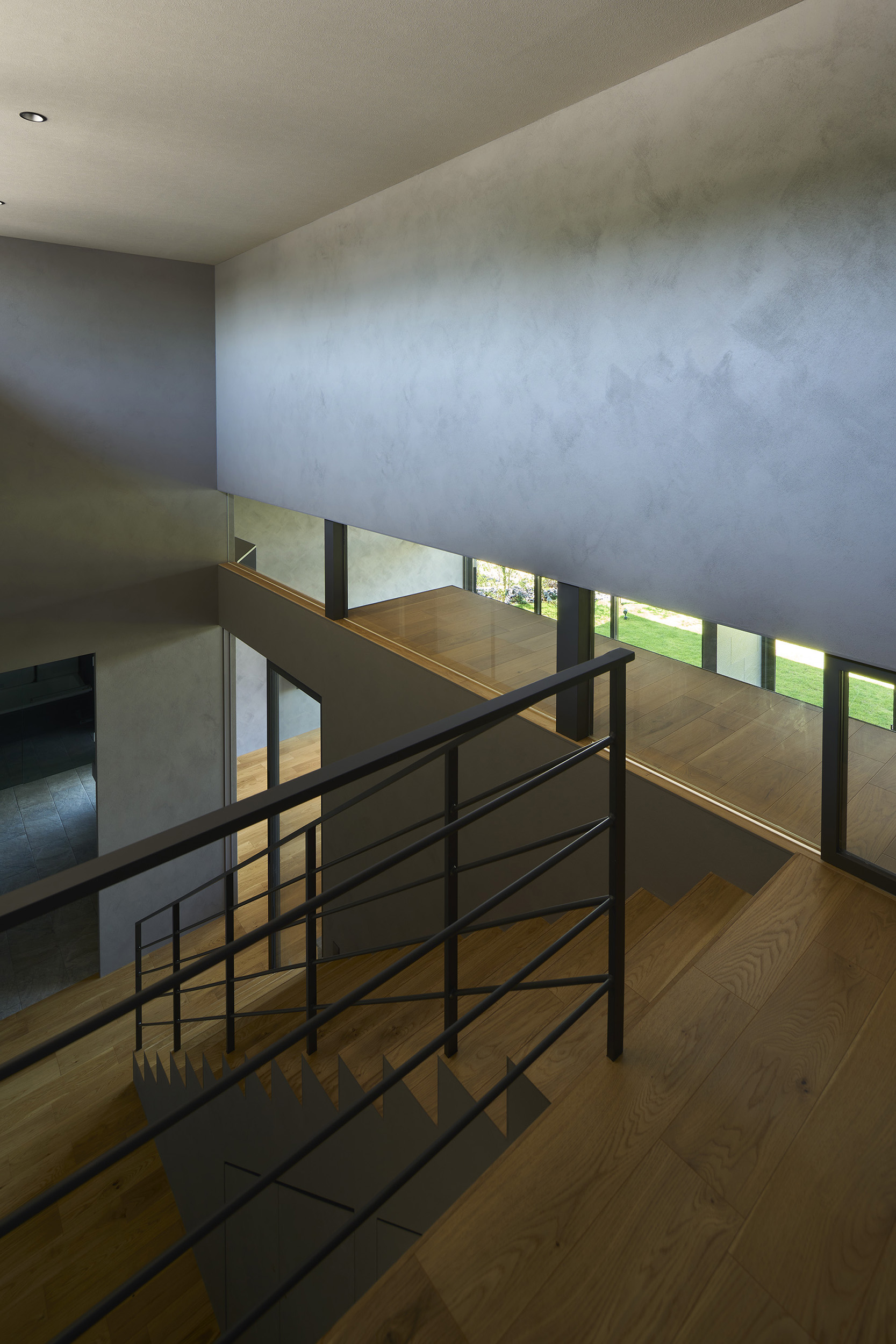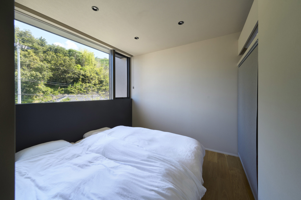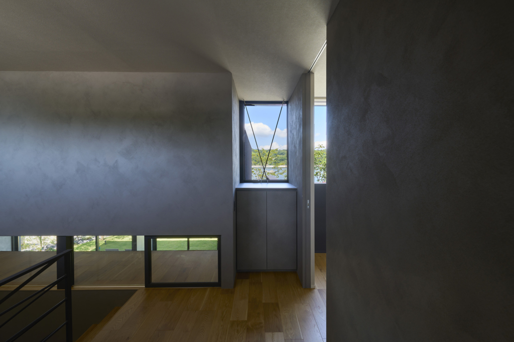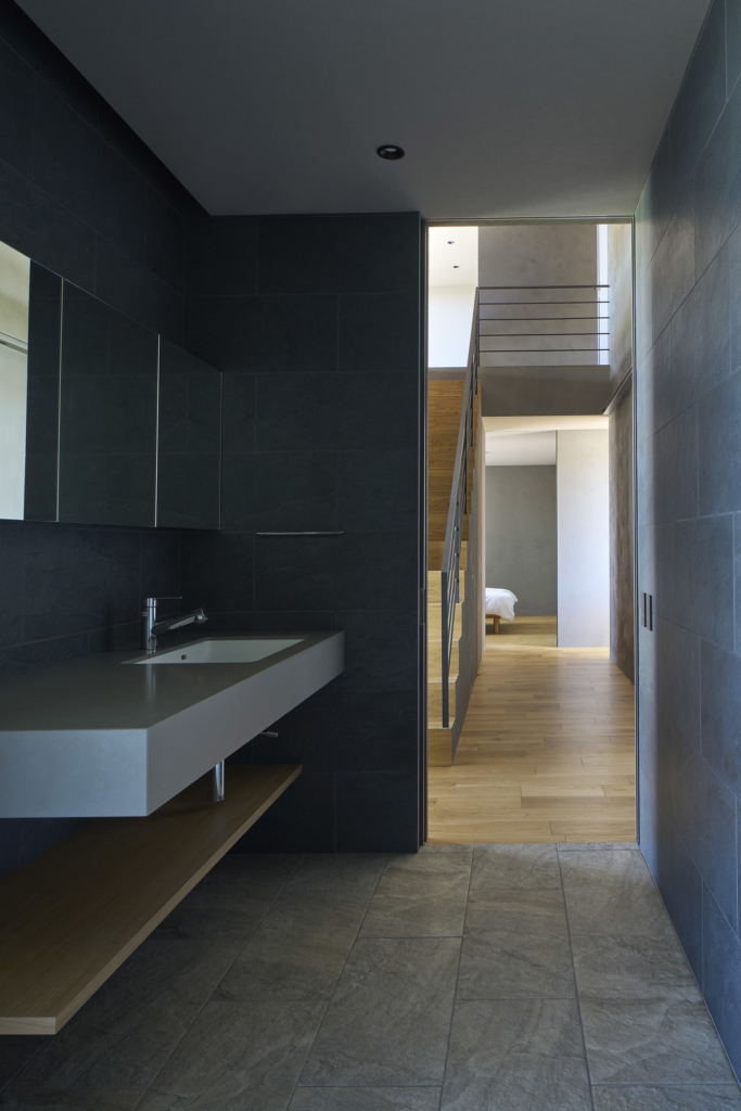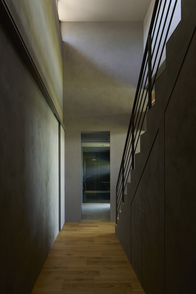 洗面室から連なるテラスは、子どもの遊び場としても、将来的なサウナの場としても応える多目的な外の間である。風の道もまた、暮らしを豊かにする装置とした。リビングを抜けた風は、キッチン上部の欄間窓を通り、階段室の高窓へと抜けてゆく。他の居室もこの窓を介して呼吸し、家全体に穏やかな通風が巡るように計画した。