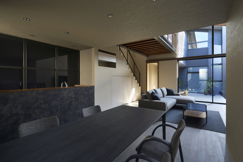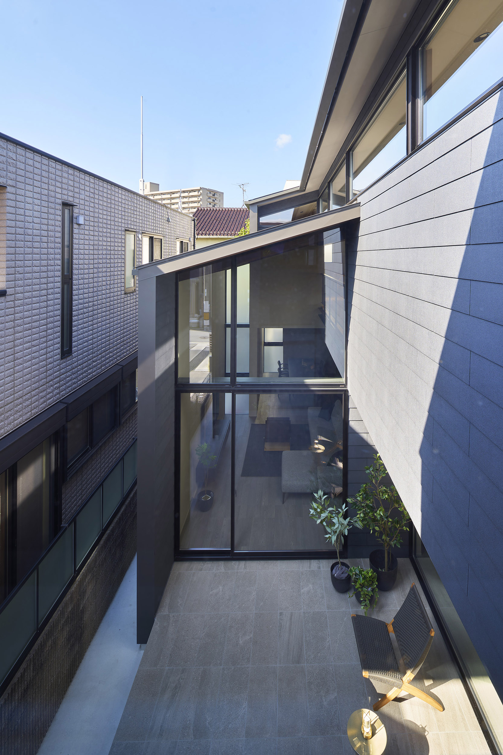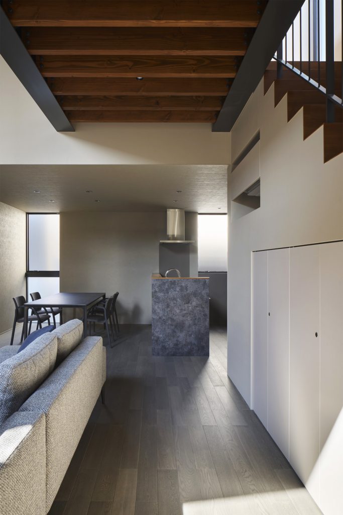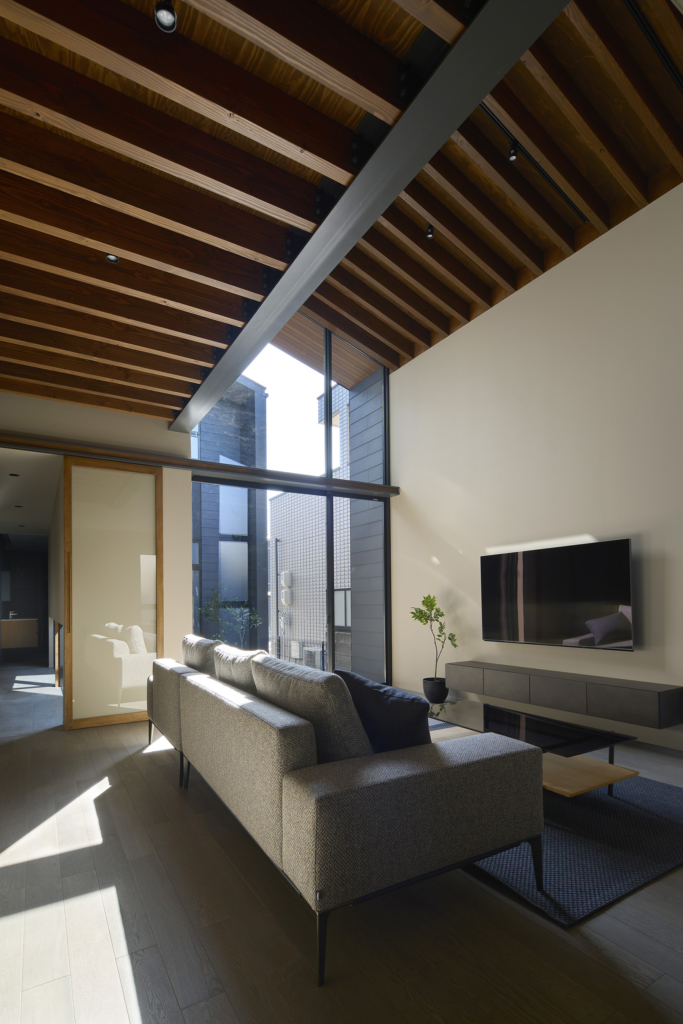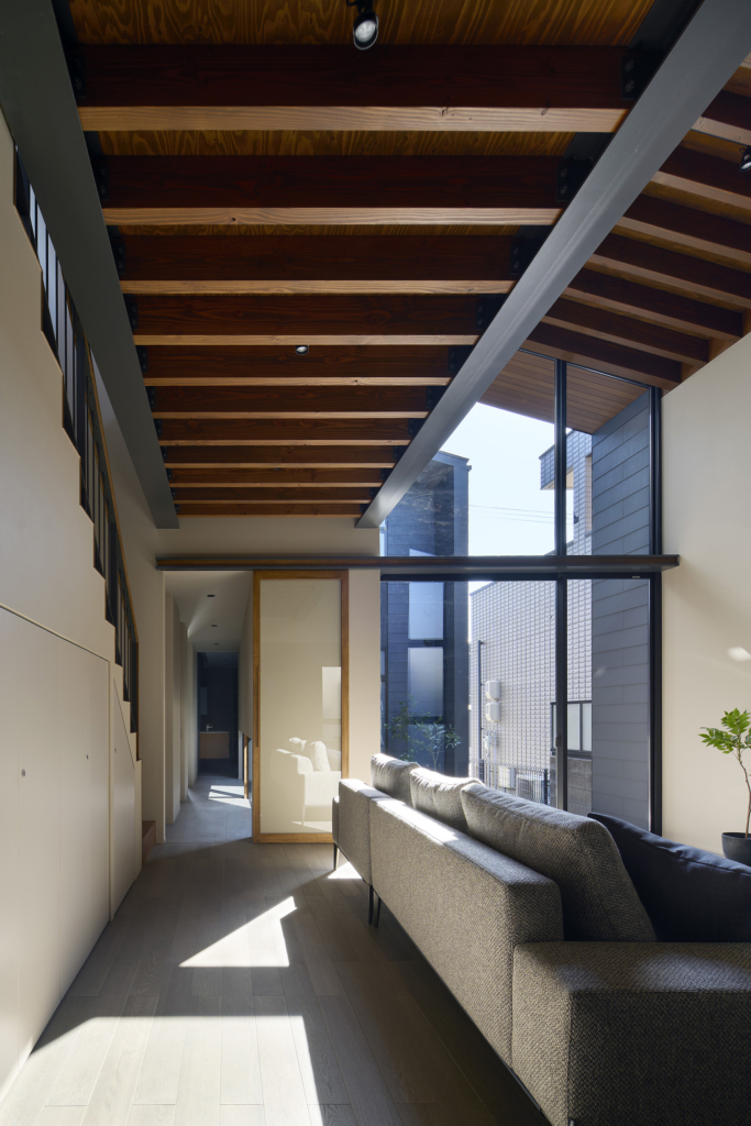 都市の住宅は、ともすれば外部に対して閉じてしまいがちである。しかしこの住まいでは、建築をずらし、重ね、隙間をつくることで、都市の中にいながらも、光や風、そして時間の存在を静かに感じられる場を目指している。