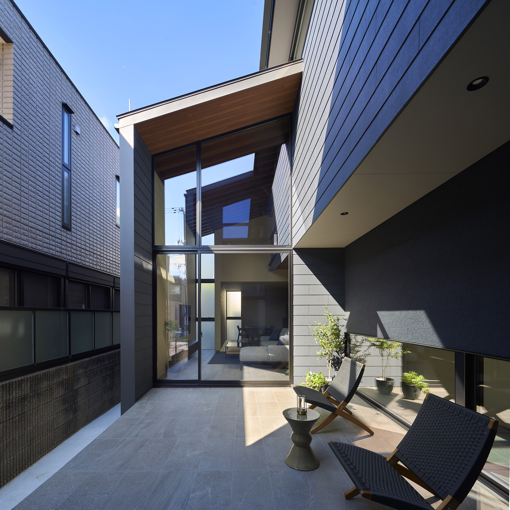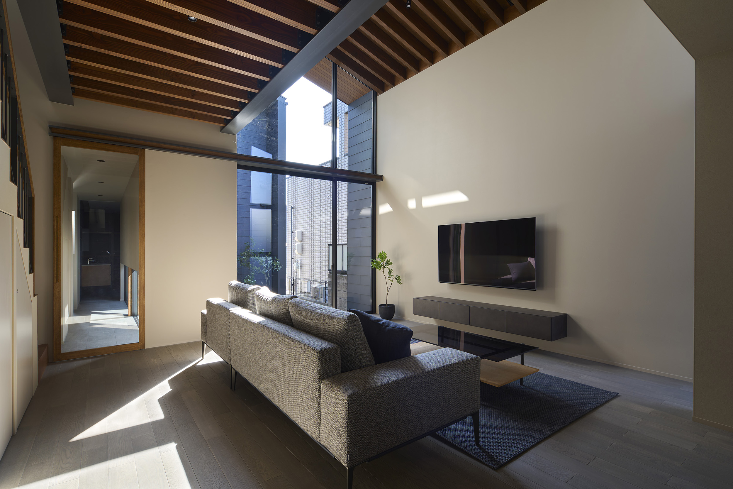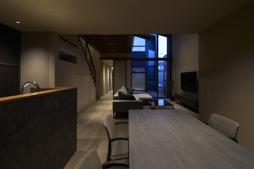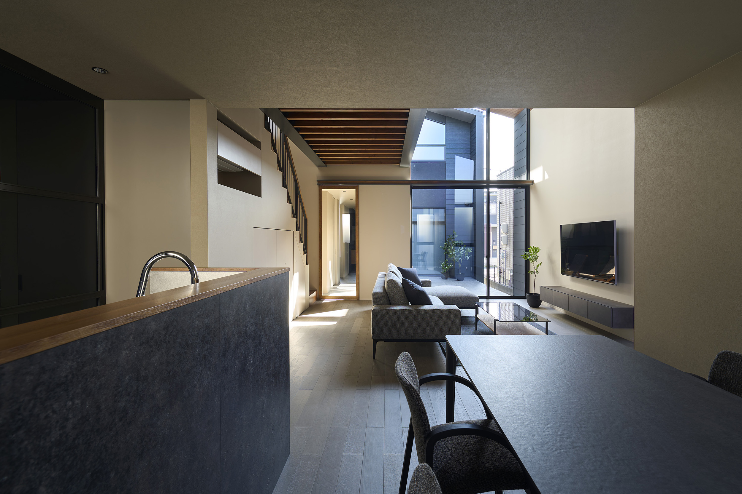 都市の住宅は、ともすれば外部に対して閉じてしまいがちである。しかしこの住まいでは、建築をずらし、重ね、隙間をつくることで、都市の中にいながらも、光や風、そして時間の存在を静かに感じられる場を目指している。