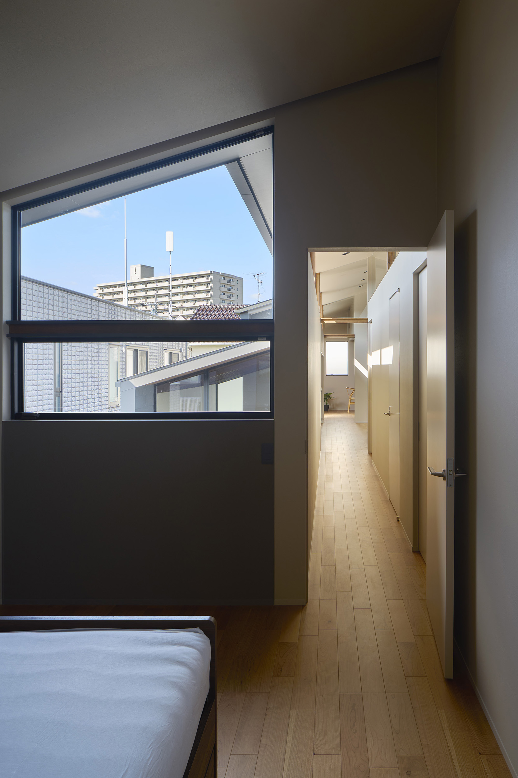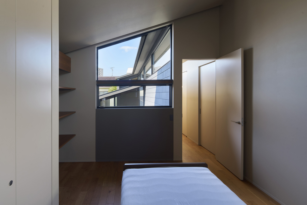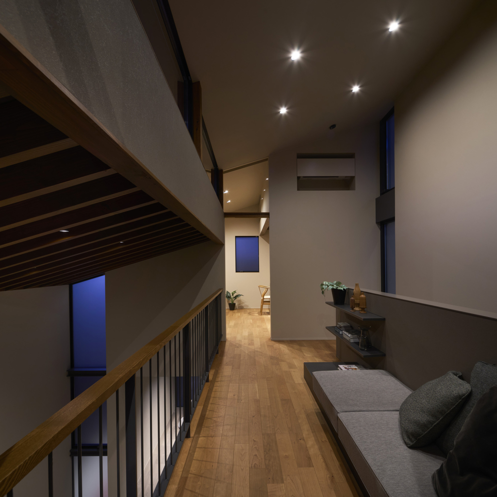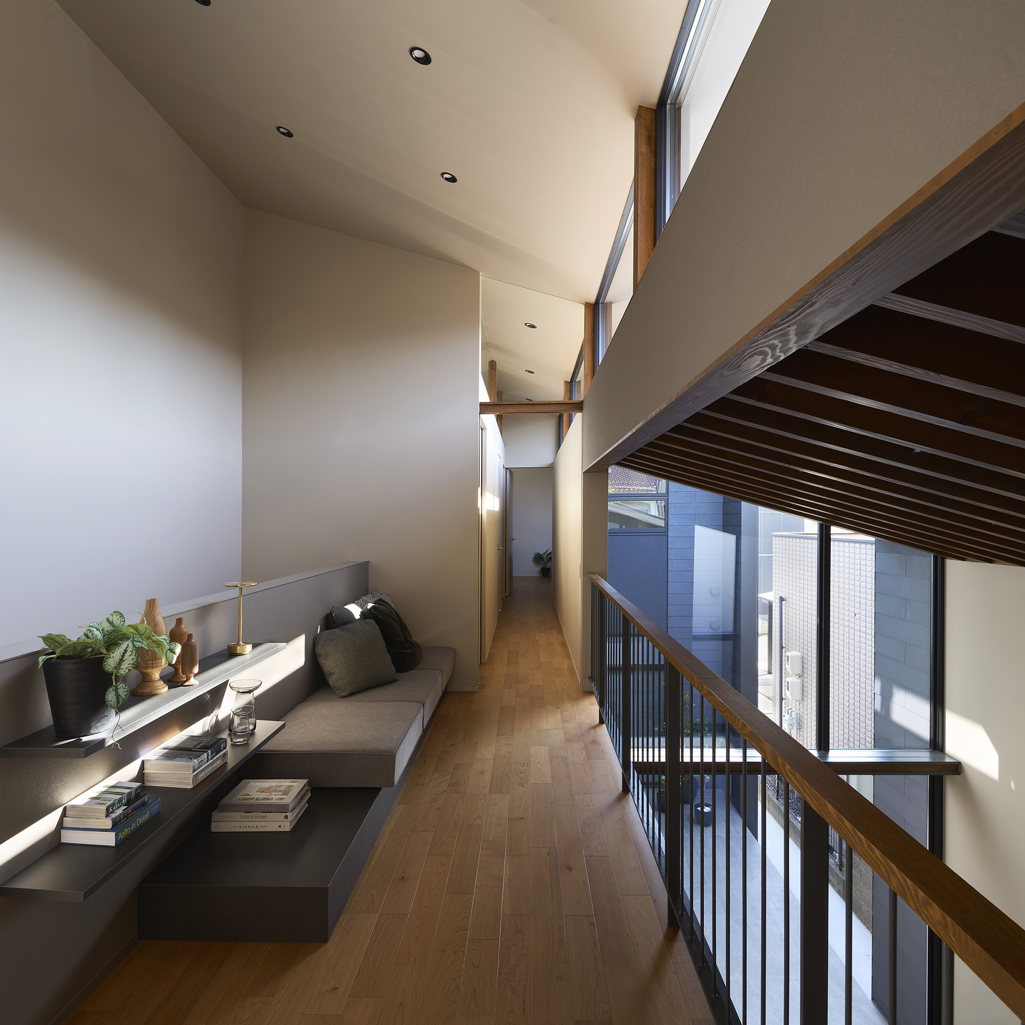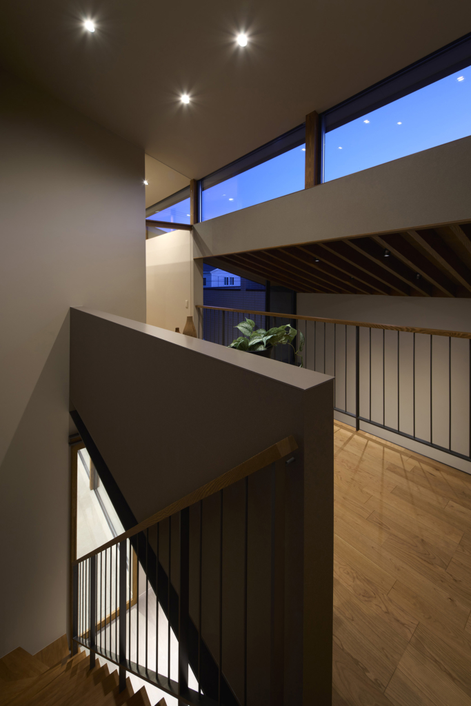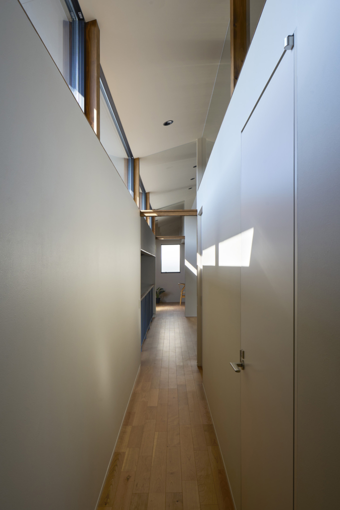 4つの棟を横断する廊下は、この住宅の特徴的な空間である。1階では地窓を設け、足元からやわらかな光を感じられると同時に、リビングとの明暗のコントラストをつくり出し、空間に静かな奥行きを与える。2階の廊下は幅にゆとりを持たせ、ささやかなセカンドリビングとして計画した。水平に連続する高窓からは、時間帯や天候によって変化する空の表情が感じられる。さらに各居室には室内窓を設け、高窓を通してやわらかな光を室内へと導いている。