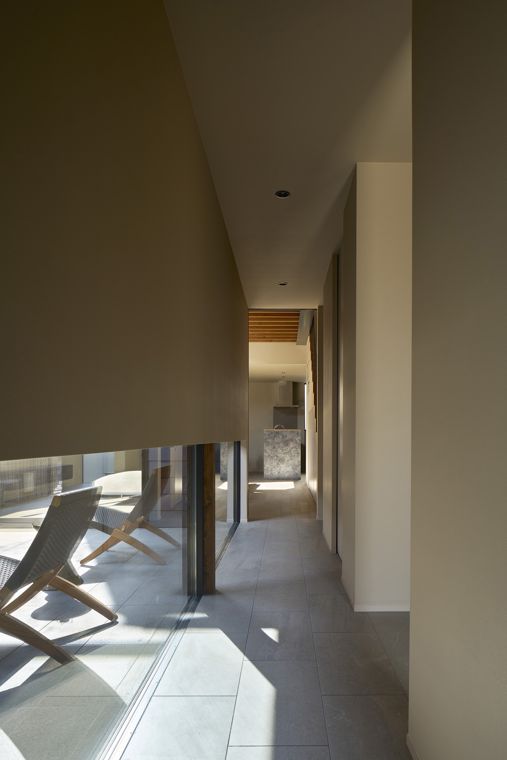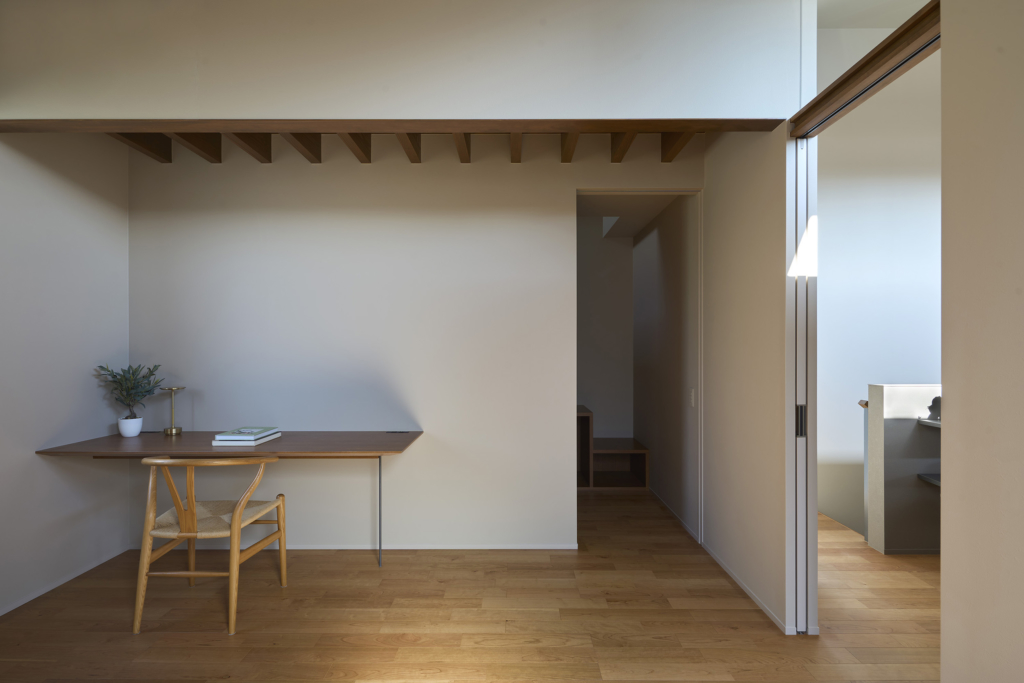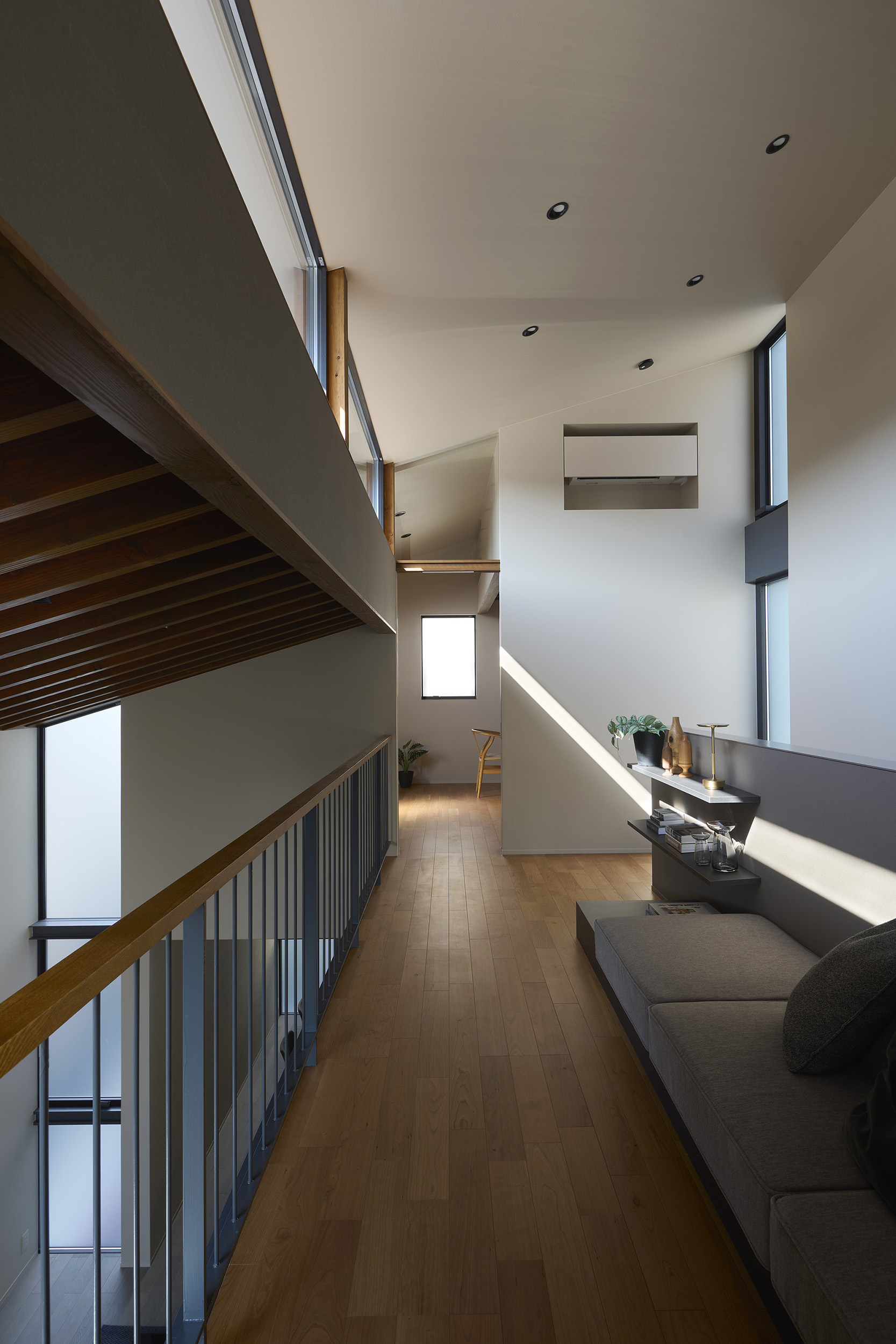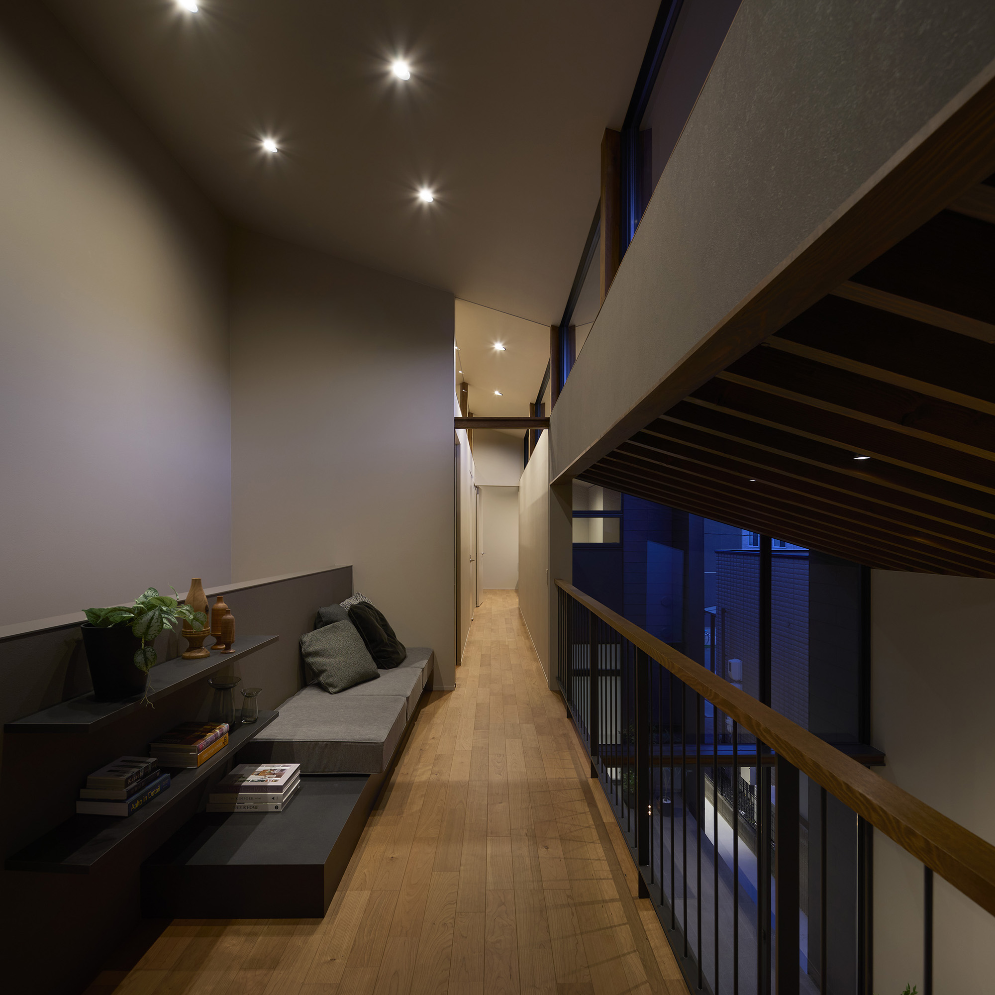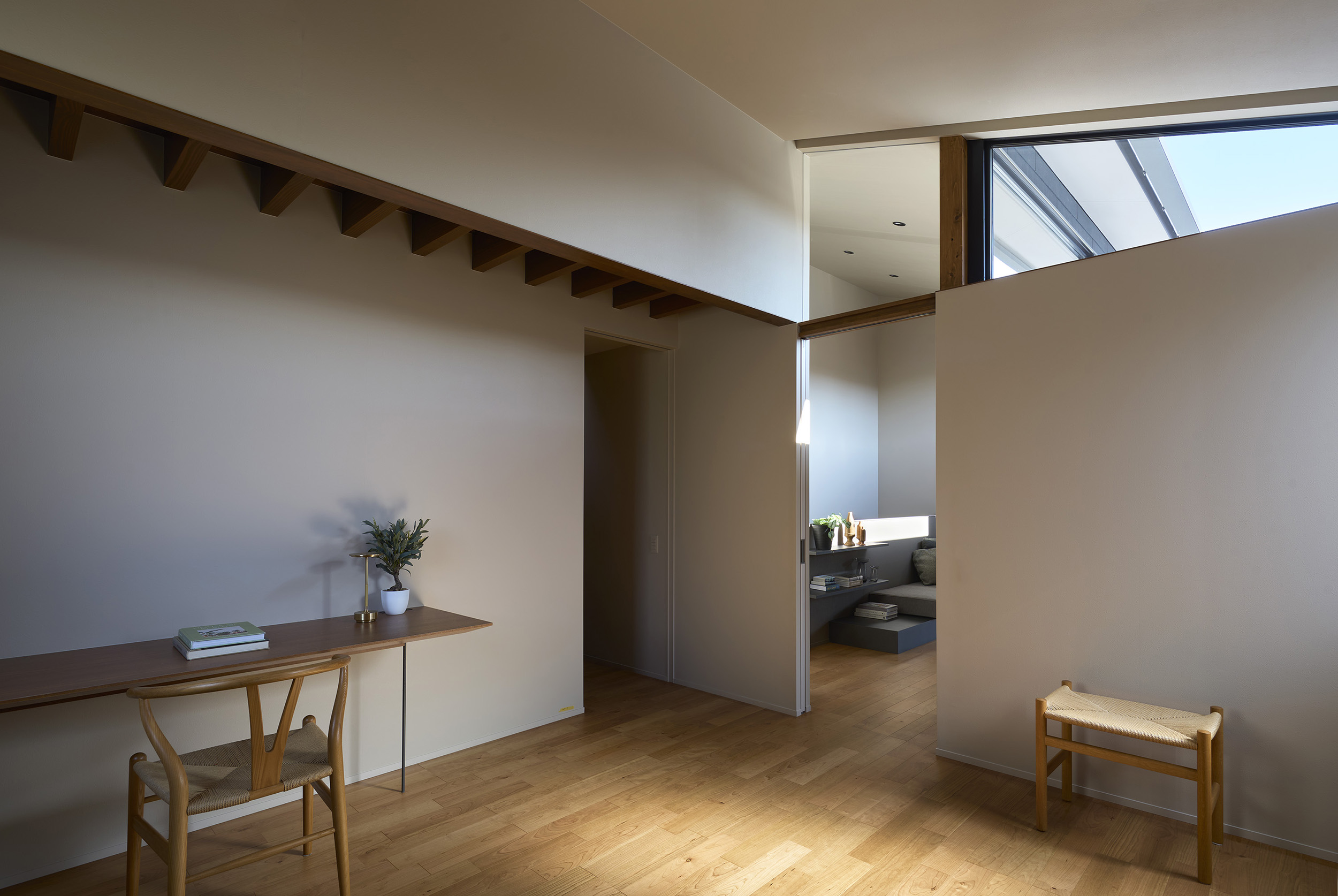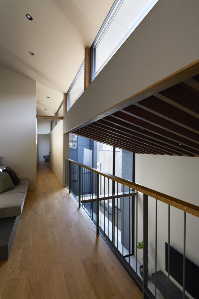 4つの棟を横断する廊下は、この住宅の特徴的な空間である。1階では地窓を設け、足元からやわらかな光を感じられると同時に、リビングとの明暗のコントラストをつくり出し、空間に静かな奥行きを与える。2階の廊下は幅にゆとりを持たせ、ささやかなセカンドリビングとして計画した。水平に連続する高窓からは、時間帯や天候によって変化する空の表情が感じられる。さらに各居室には室内窓を設け、高窓を通してやわらかな光を室内へと導いている。