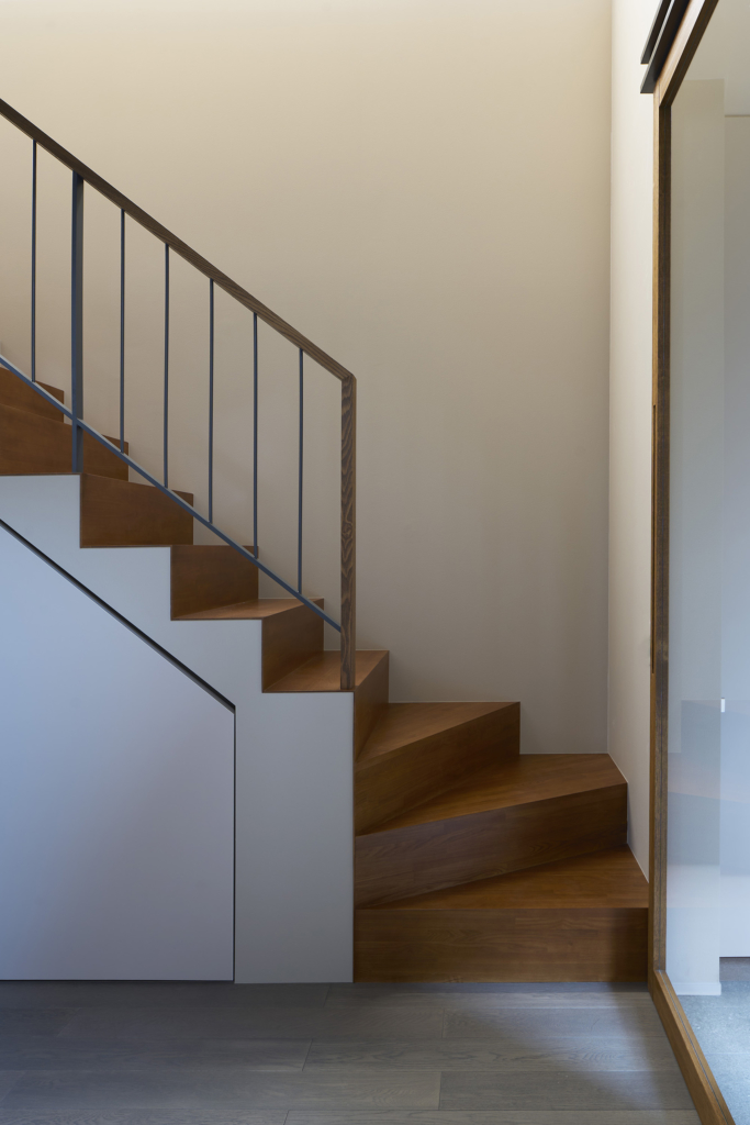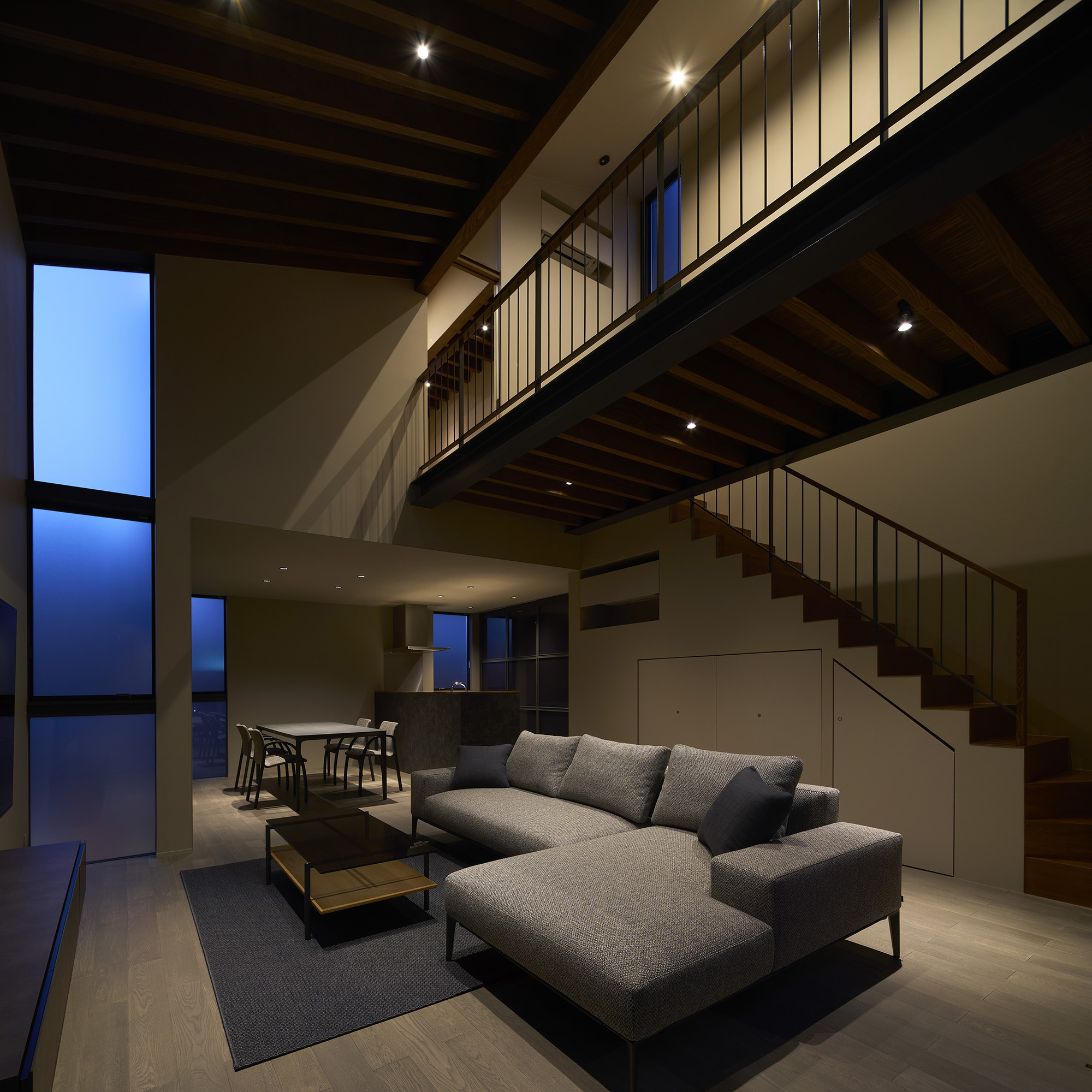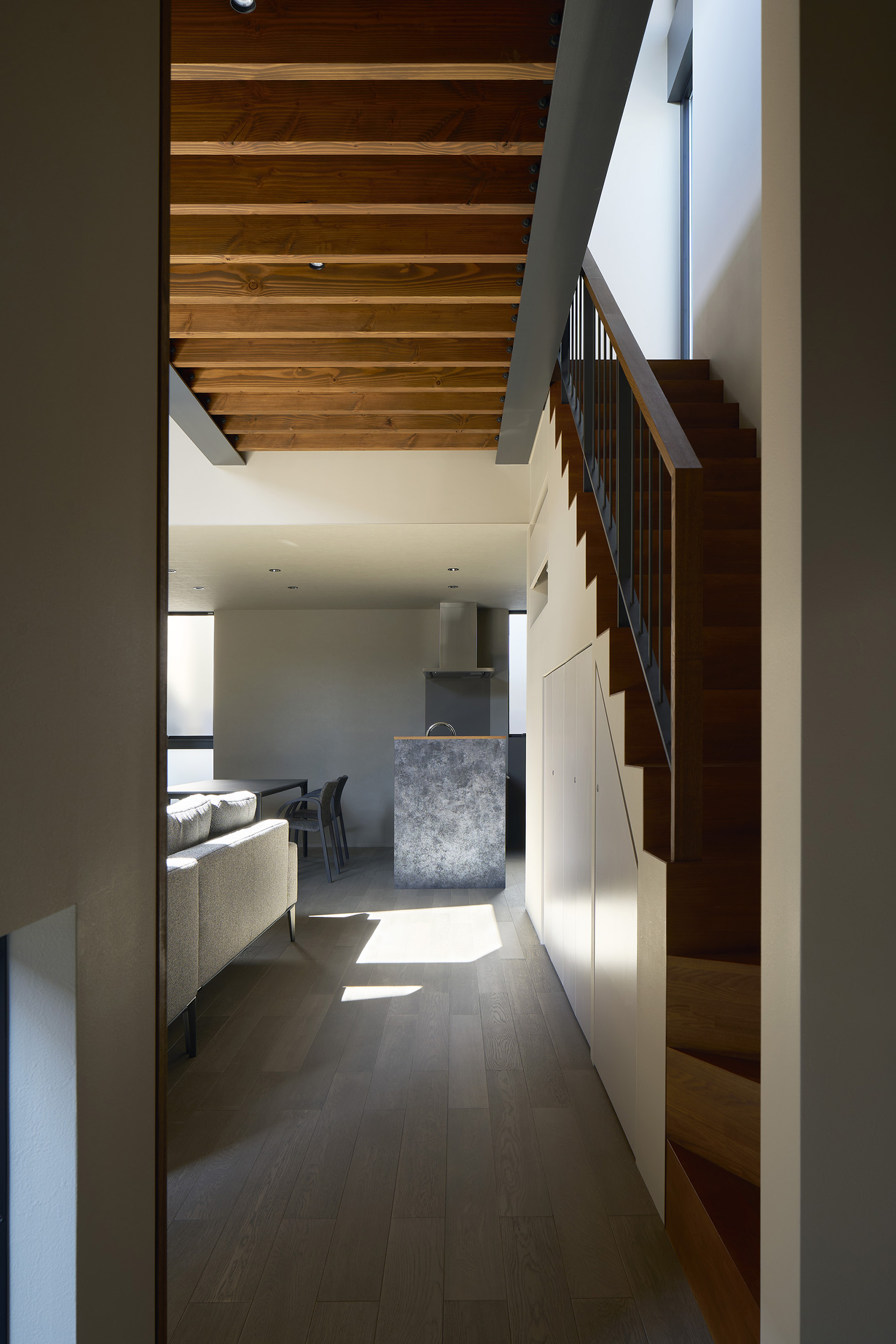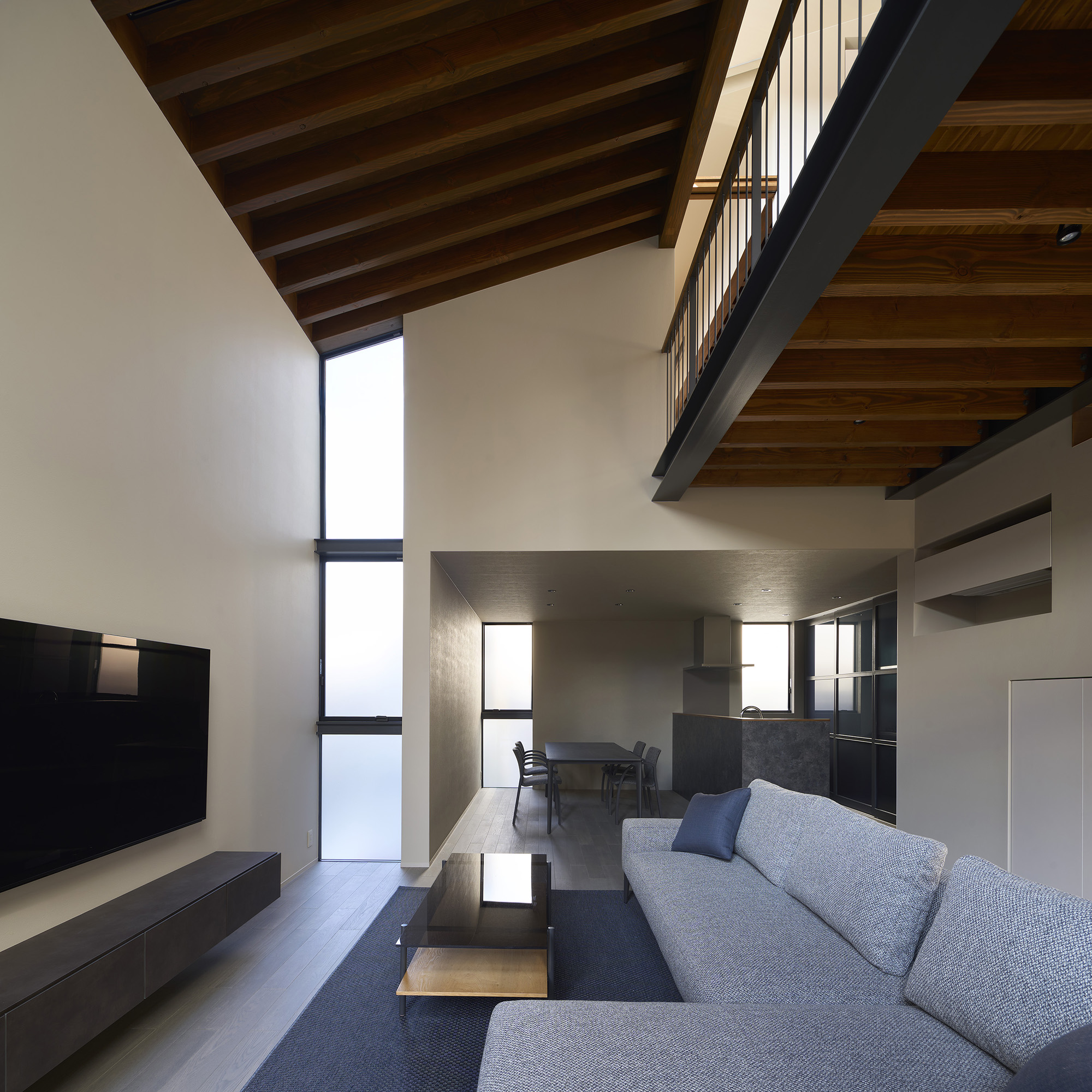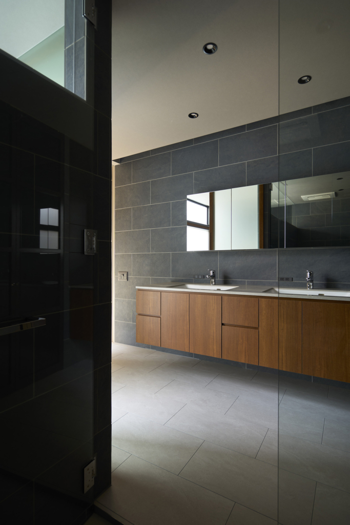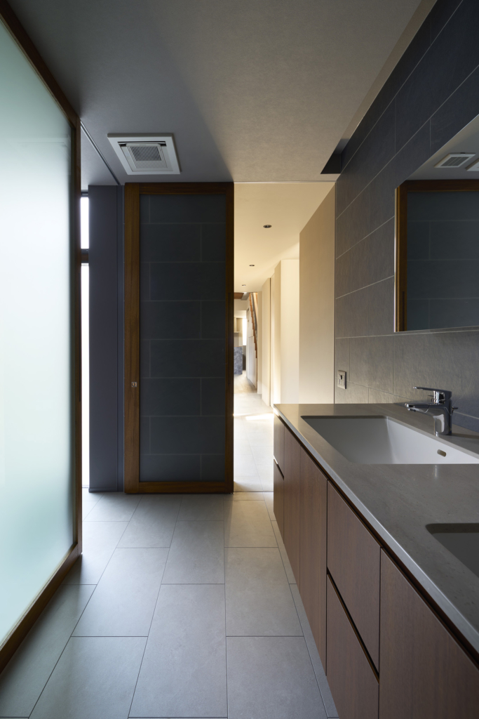 4つの棟を横断する廊下は、この住宅の特徴的な空間である。1階では地窓を設け、足元からやわらかな光を感じられると同時に、リビングとの明暗のコントラストをつくり出し、空間に静かな奥行きを与える。2階の廊下は幅にゆとりを持たせ、ささやかなセカンドリビングとして計画した。水平に連続する高窓からは、時間帯や天候によって変化する空の表情が感じられる。さらに各居室には室内窓を設け、高窓を通してやわらかな光を室内へと導いている。