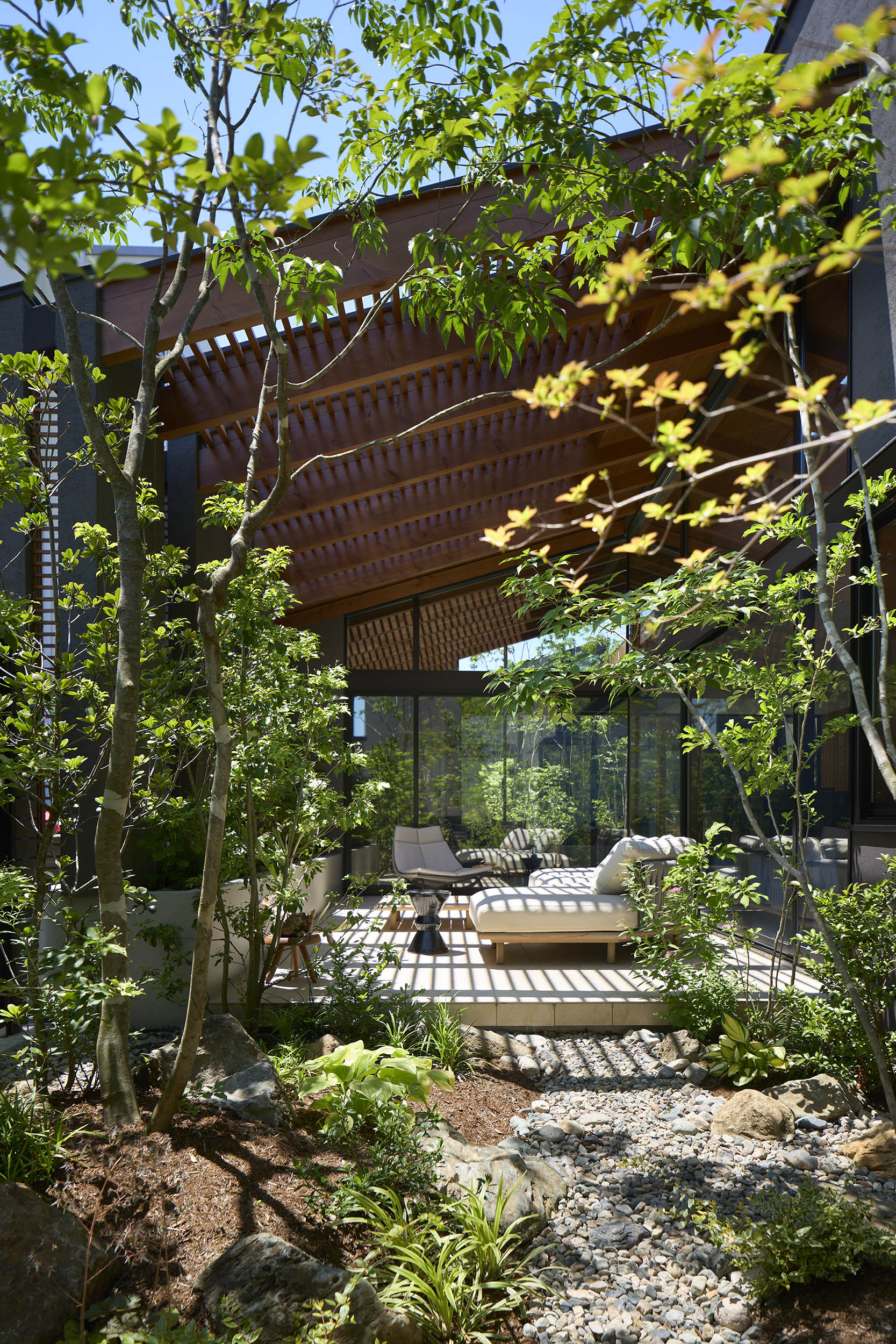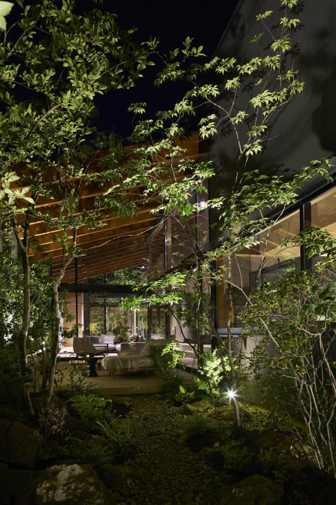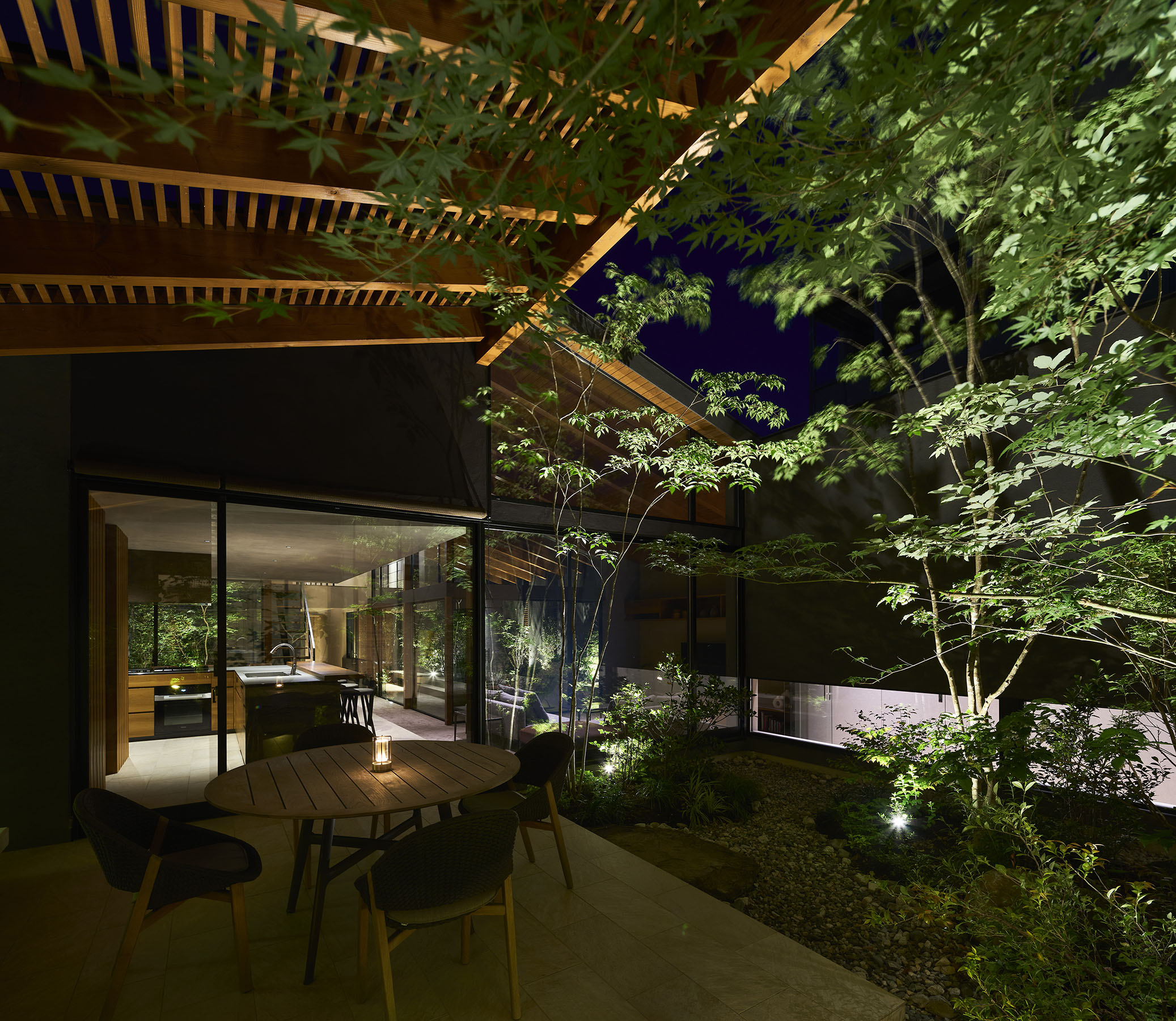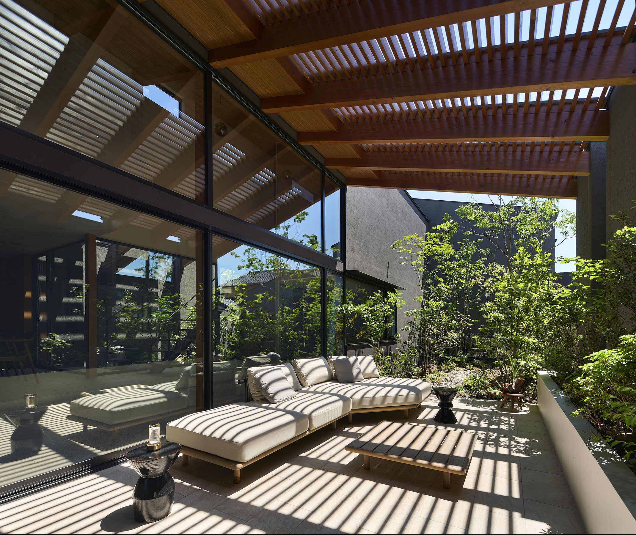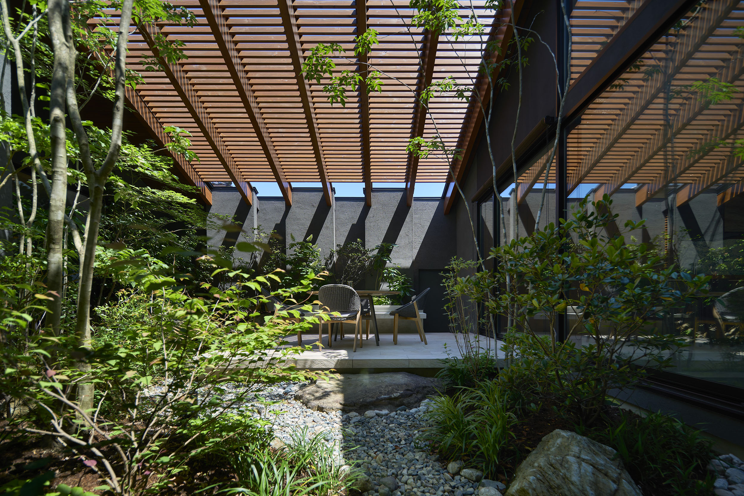 7つの庭はそれぞれ近接する室内空間と関係づけられ、場所ごとに異なる役割を果たす。面積の広い中庭と南庭にはアウターダイニングとアウターリビングを配置し、内部、中間、外部というグラデーショナルな連続性が空間全体に奥行きをつくりだしている。またルーバーによって周囲からの視線や直射日光をやわらかく遮ることで快適な外部環境を実現している。
