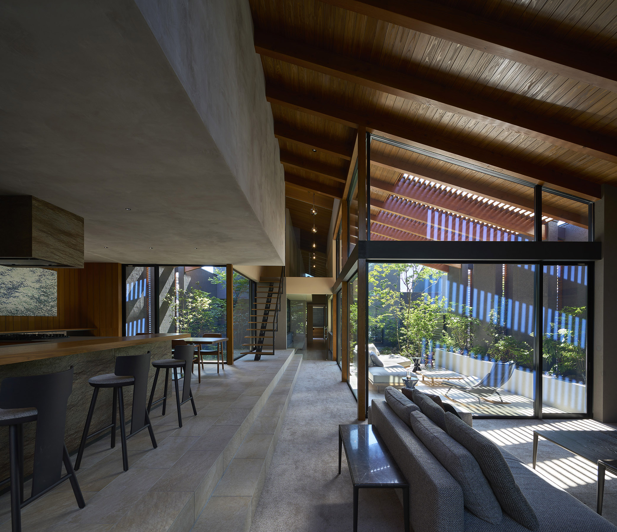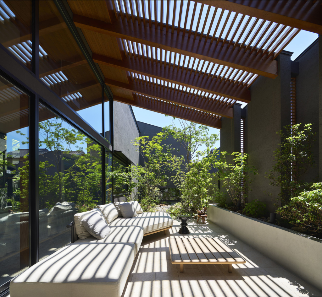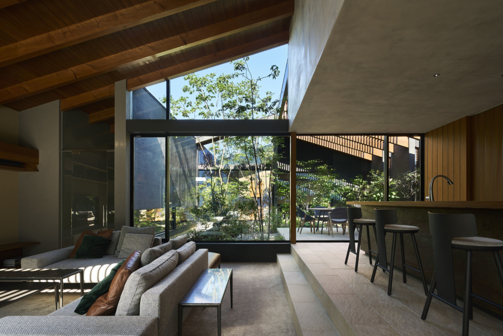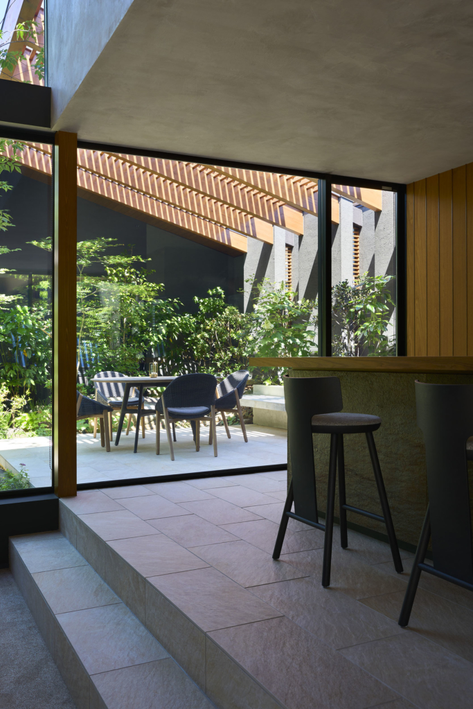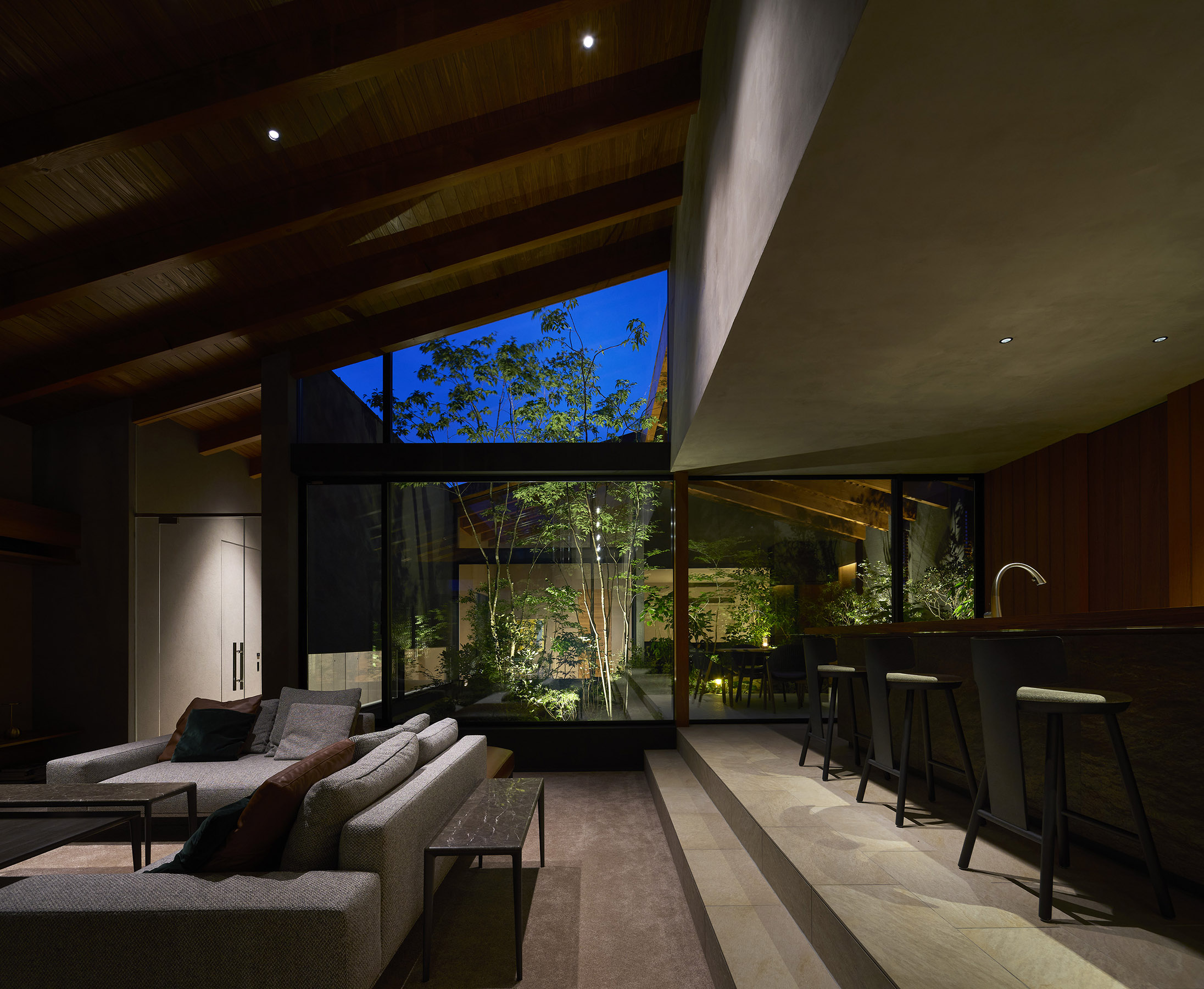 7つの庭はそれぞれ近接する室内空間と関係づけられ、場所ごとに異なる役割を果たす。面積の広い中庭と南庭にはアウターダイニングとアウターリビングを配置し、内部、中間、外部というグラデーショナルな連続性が空間全体に奥行きをつくりだしている。またルーバーによって周囲からの視線や直射日光をやわらかく遮ることで快適な外部環境を実現している。
