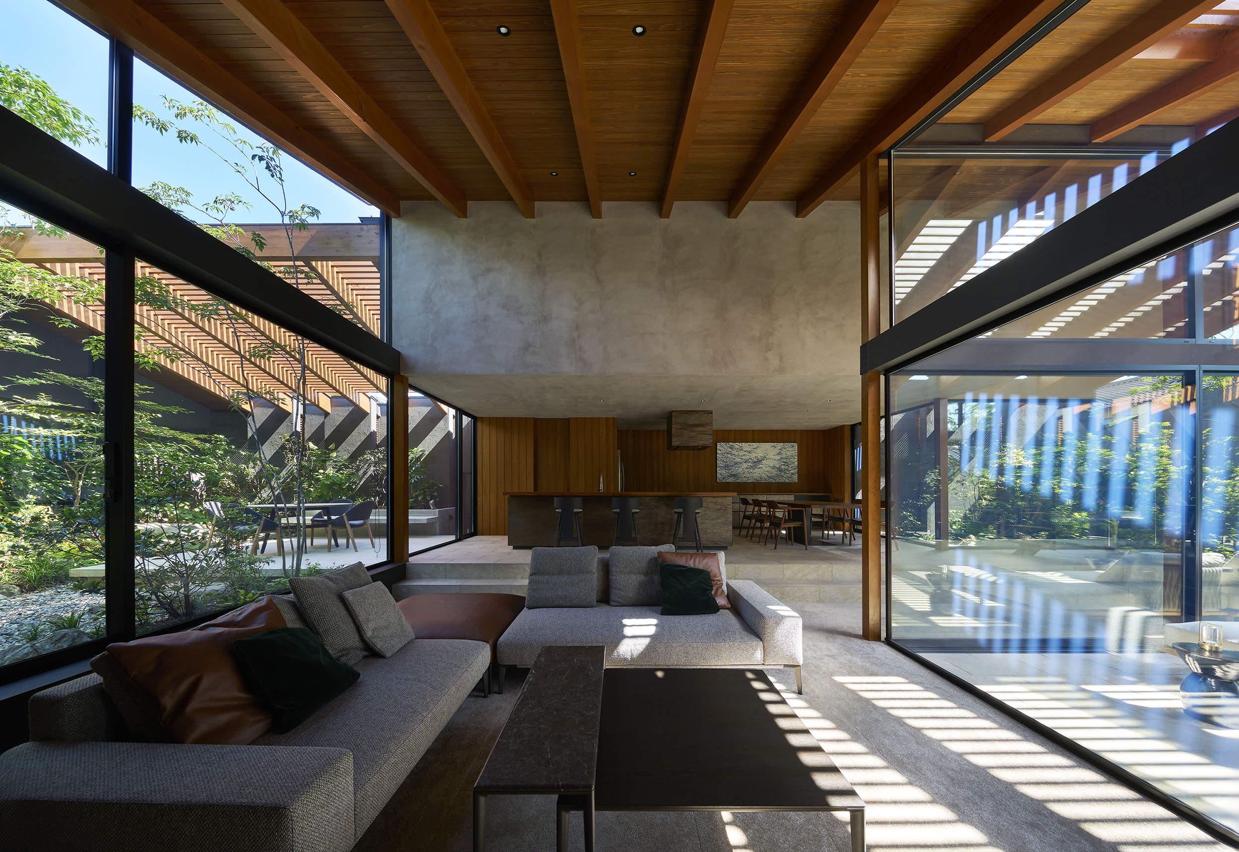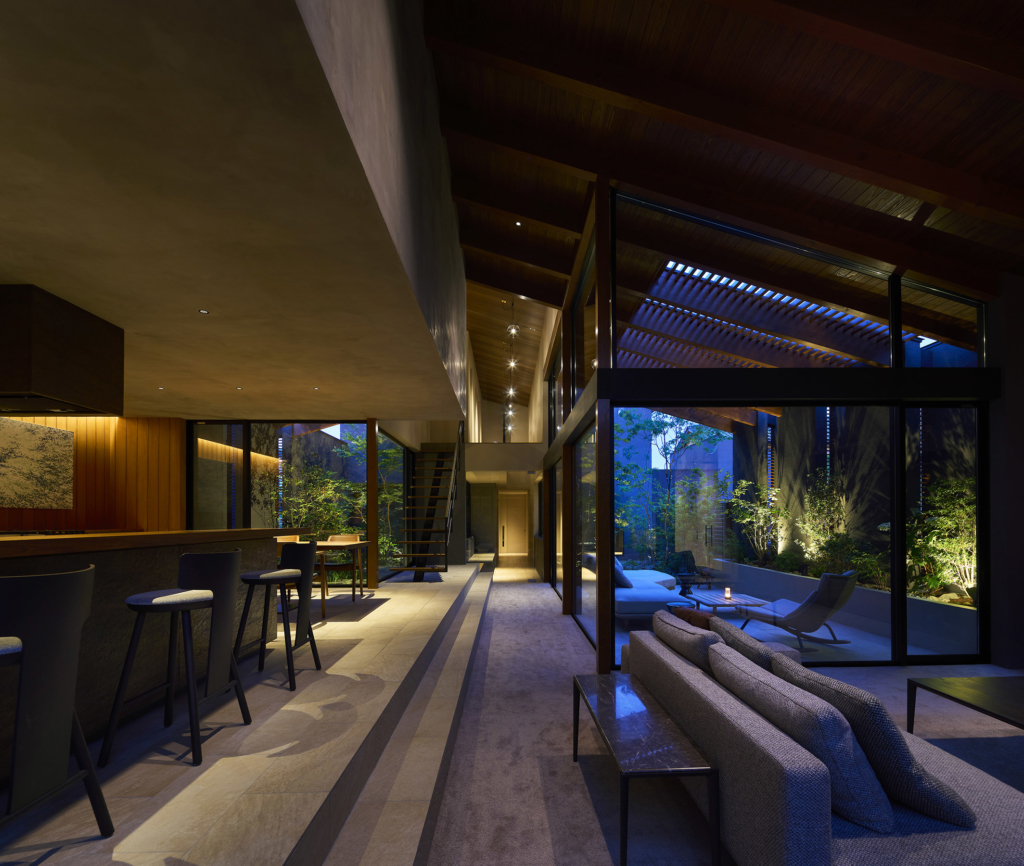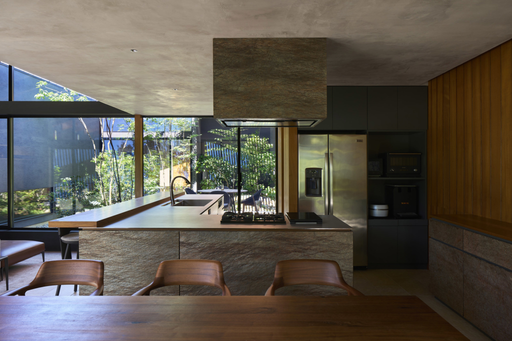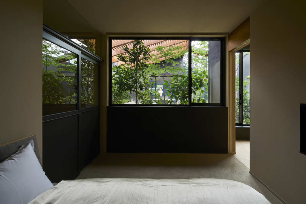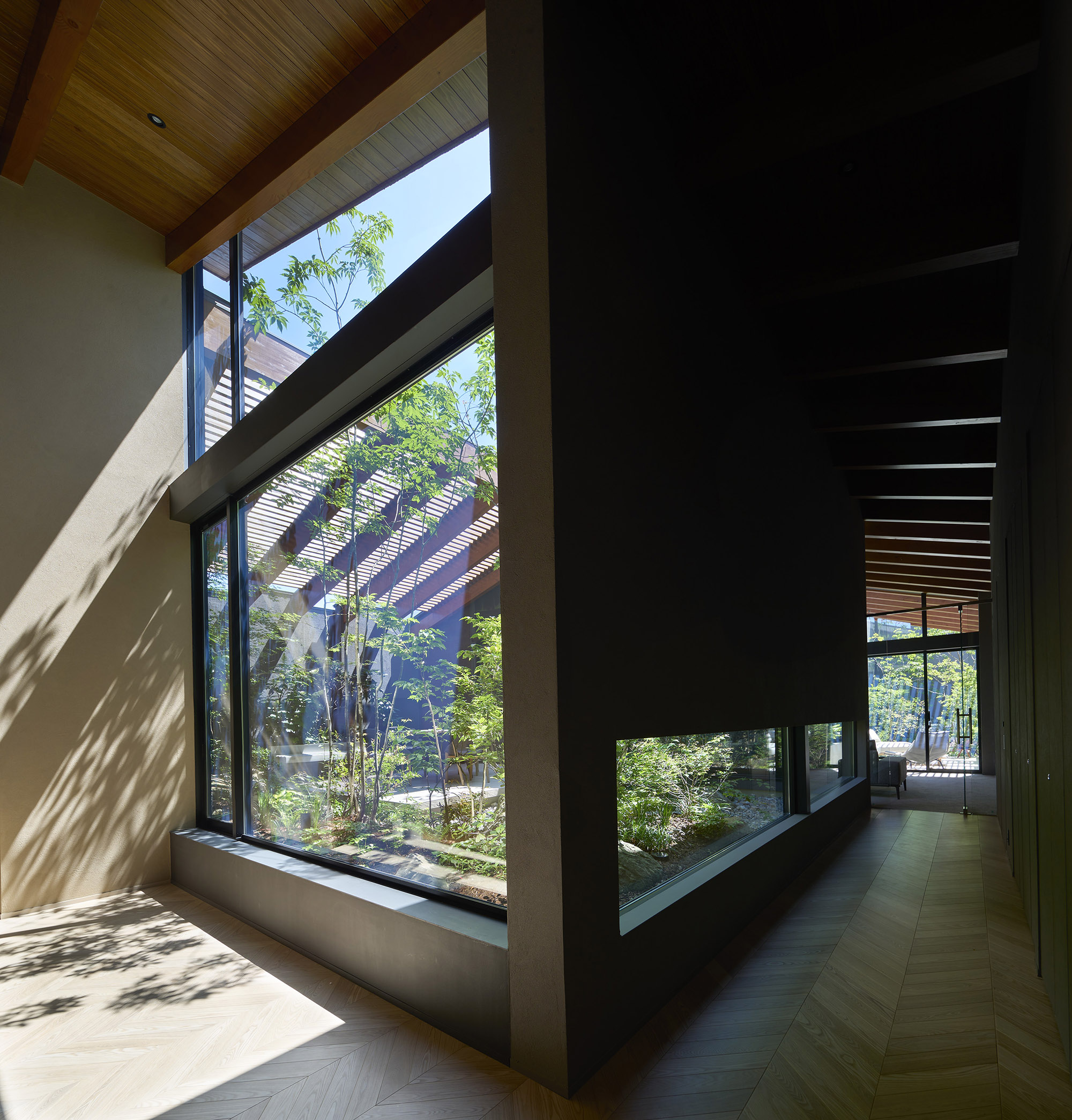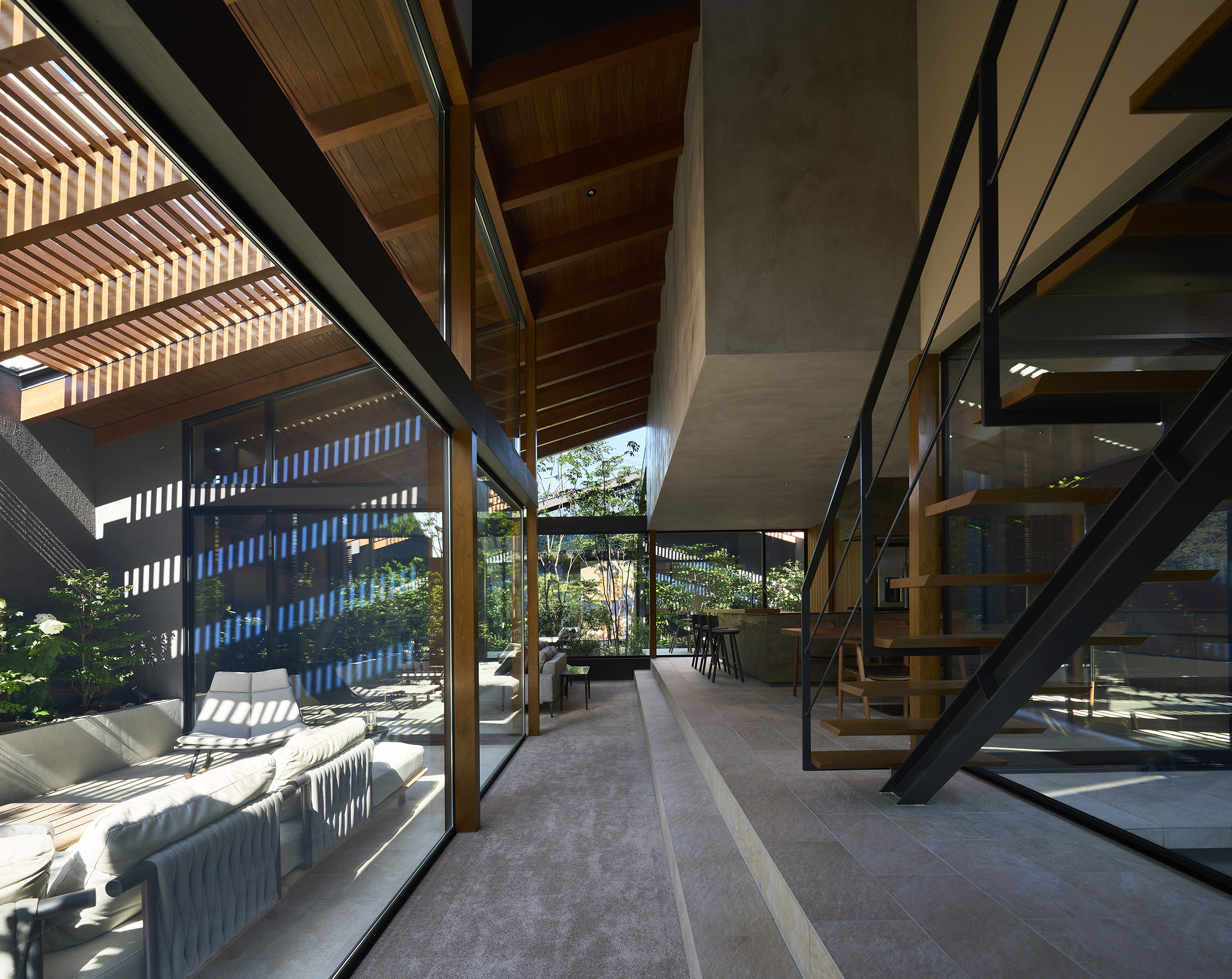 7つの庭はそれぞれ近接する室内空間と関係づけられ、場所ごとに異なる役割を果たす。面積の広い中庭と南庭にはアウターダイニングとアウターリビングを配置し、内部、中間、外部というグラデーショナルな連続性が空間全体に奥行きをつくりだしている。またルーバーによって周囲からの視線や直射日光をやわらかく遮ることで快適な外部環境を実現している。