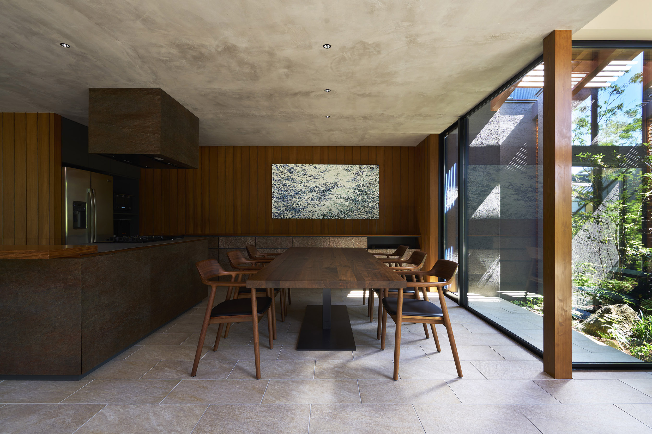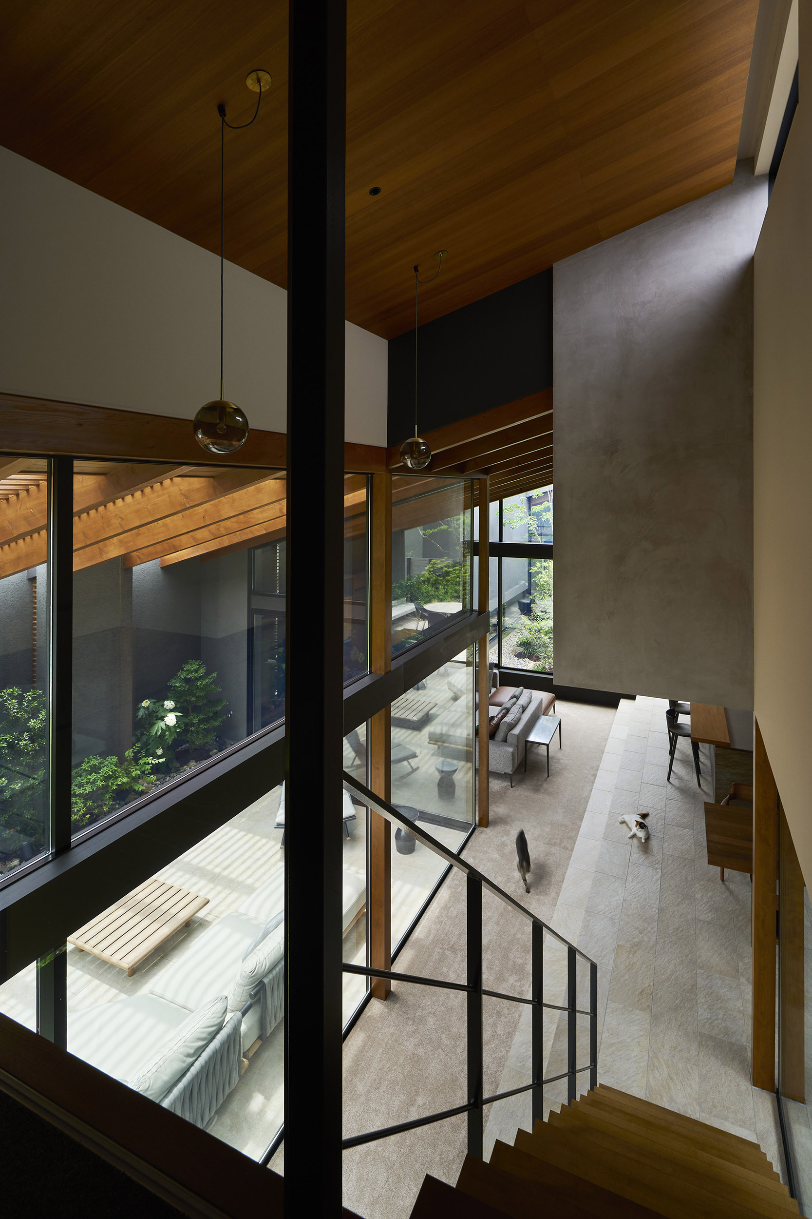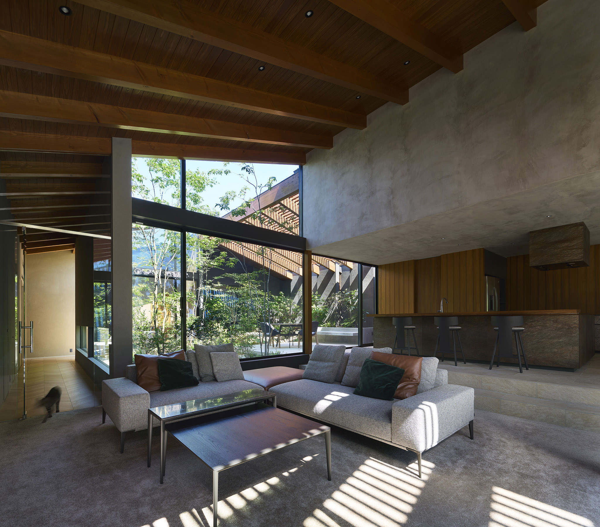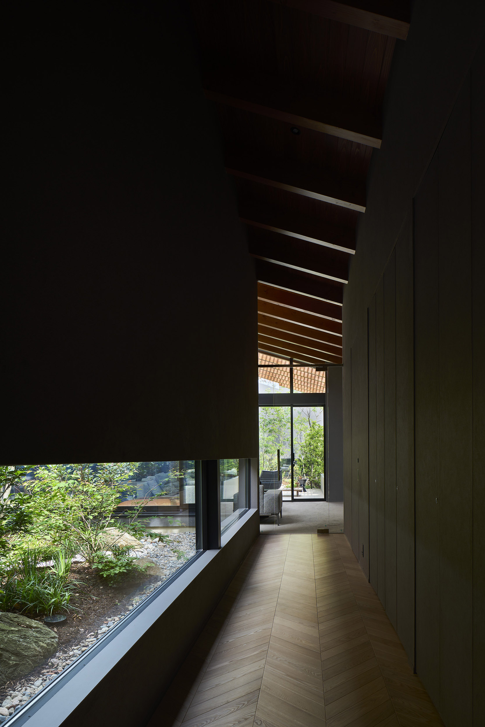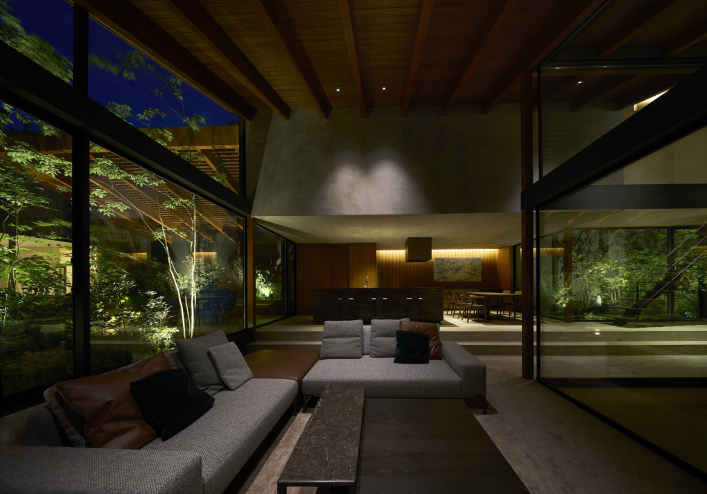 7つの庭はそれぞれ近接する室内空間と関係づけられ、場所ごとに異なる役割を果たす。面積の広い中庭と南庭にはアウターダイニングとアウターリビングを配置し、内部、中間、外部というグラデーショナルな連続性が空間全体に奥行きをつくりだしている。またルーバーによって周囲からの視線や直射日光をやわらかく遮ることで快適な外部環境を実現している。