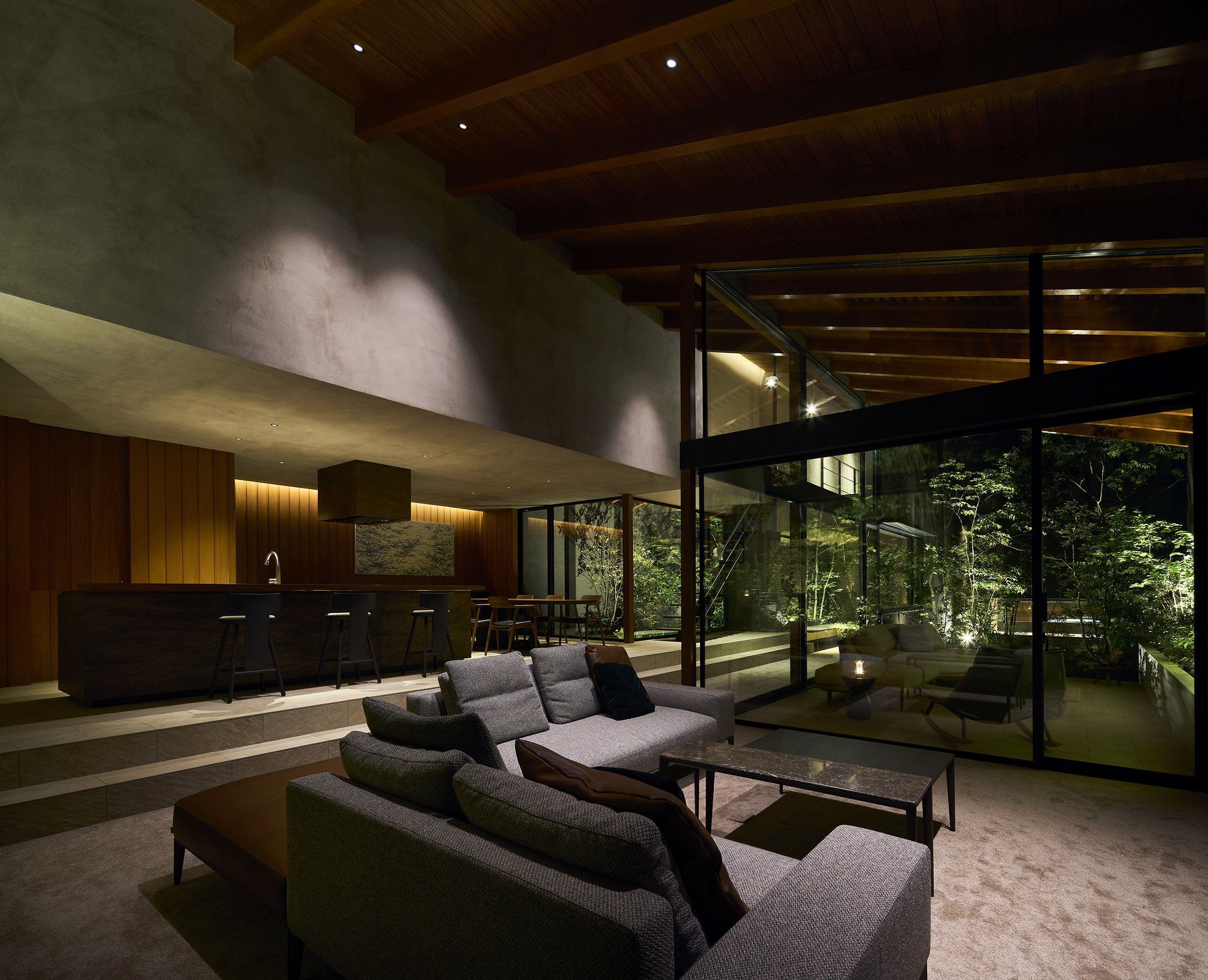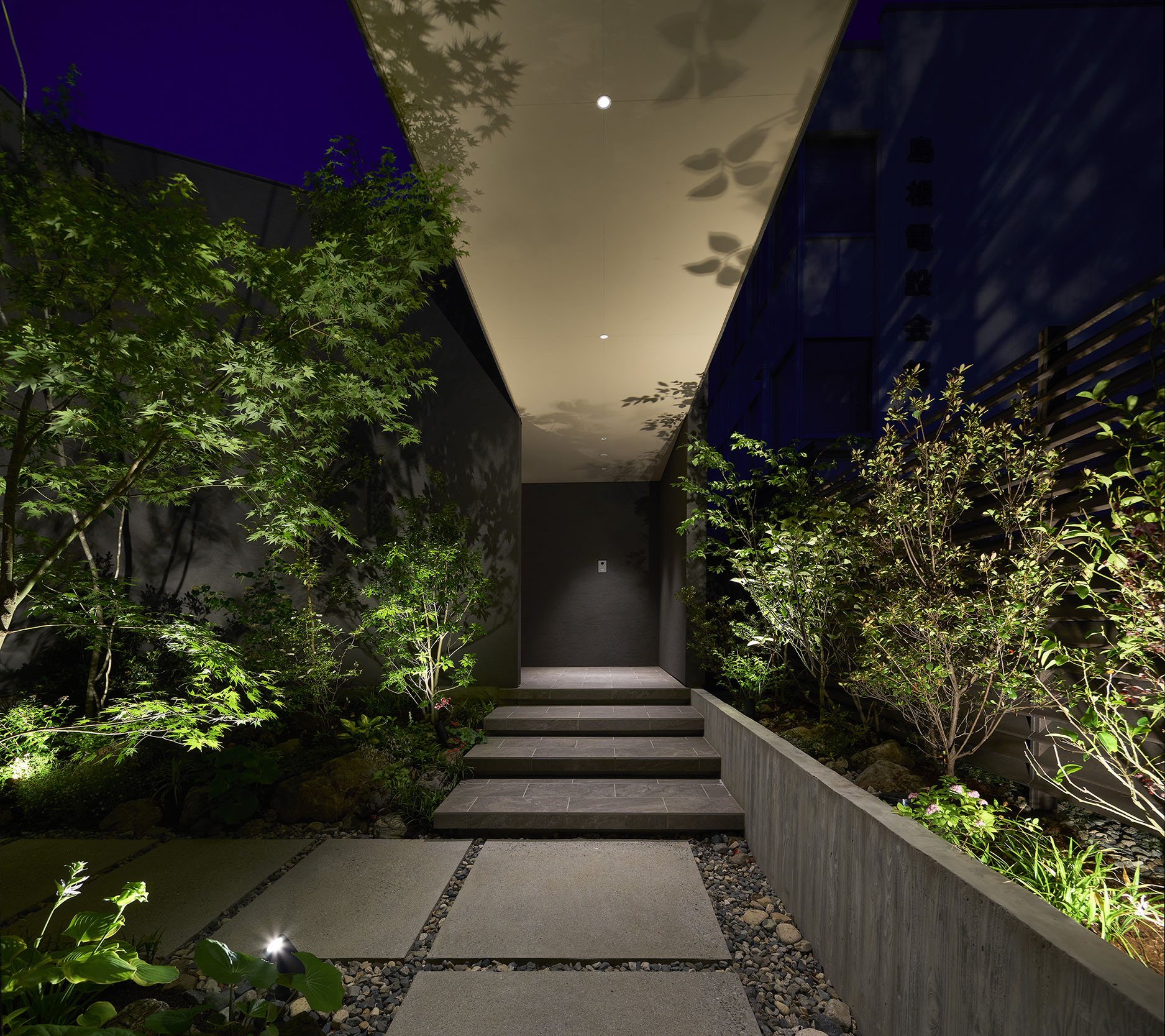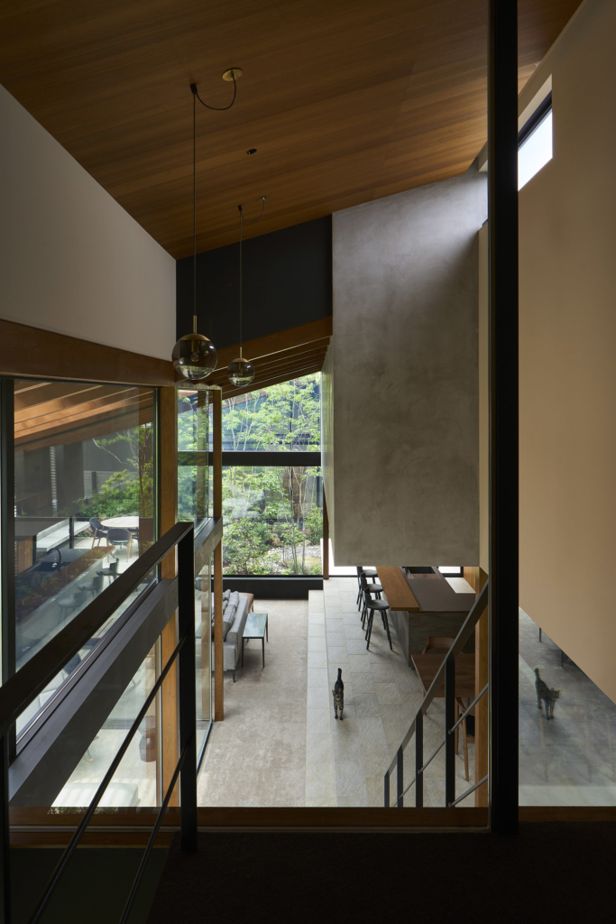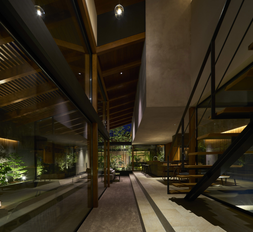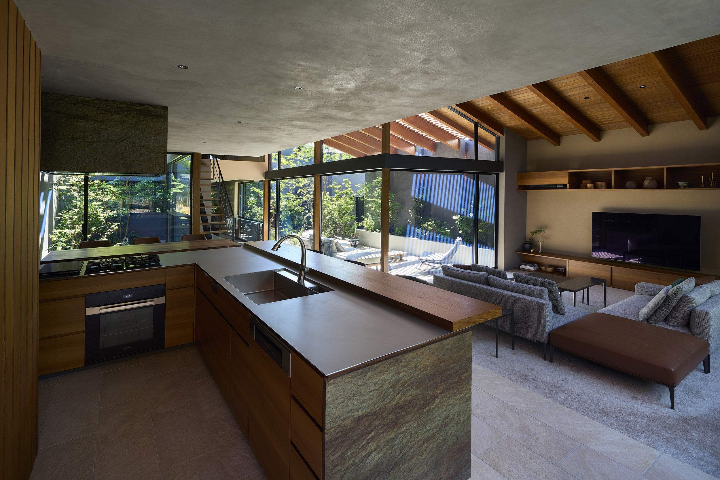 7つの庭はそれぞれ近接する室内空間と関係づけられ、場所ごとに異なる役割を果たす。面積の広い中庭と南庭にはアウターダイニングとアウターリビングを配置し、内部、中間、外部というグラデーショナルな連続性が空間全体に奥行きをつくりだしている。またルーバーによって周囲からの視線や直射日光をやわらかく遮ることで快適な外部環境を実現している。
