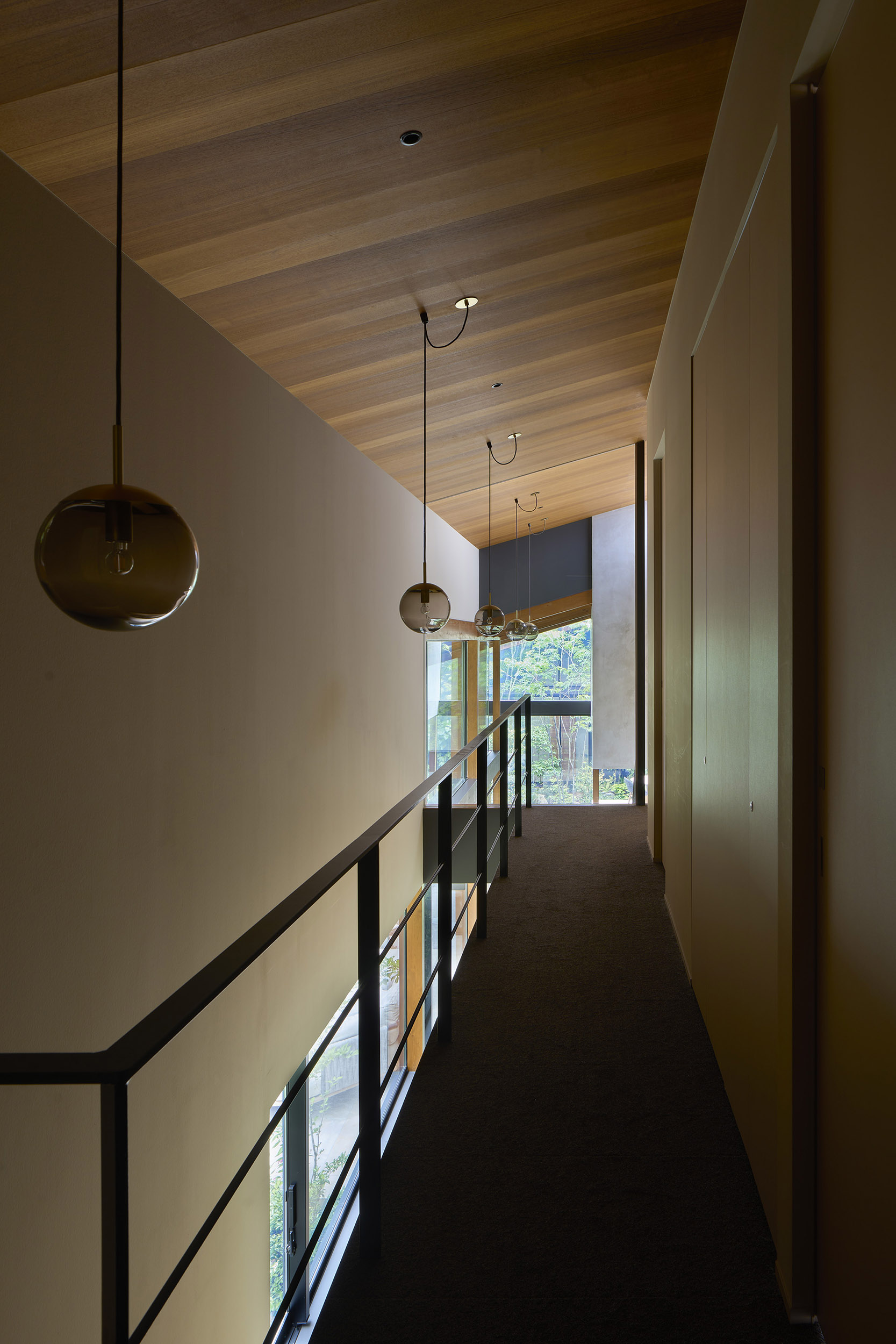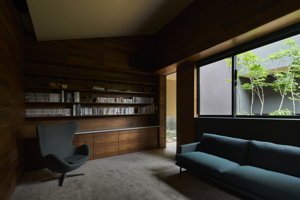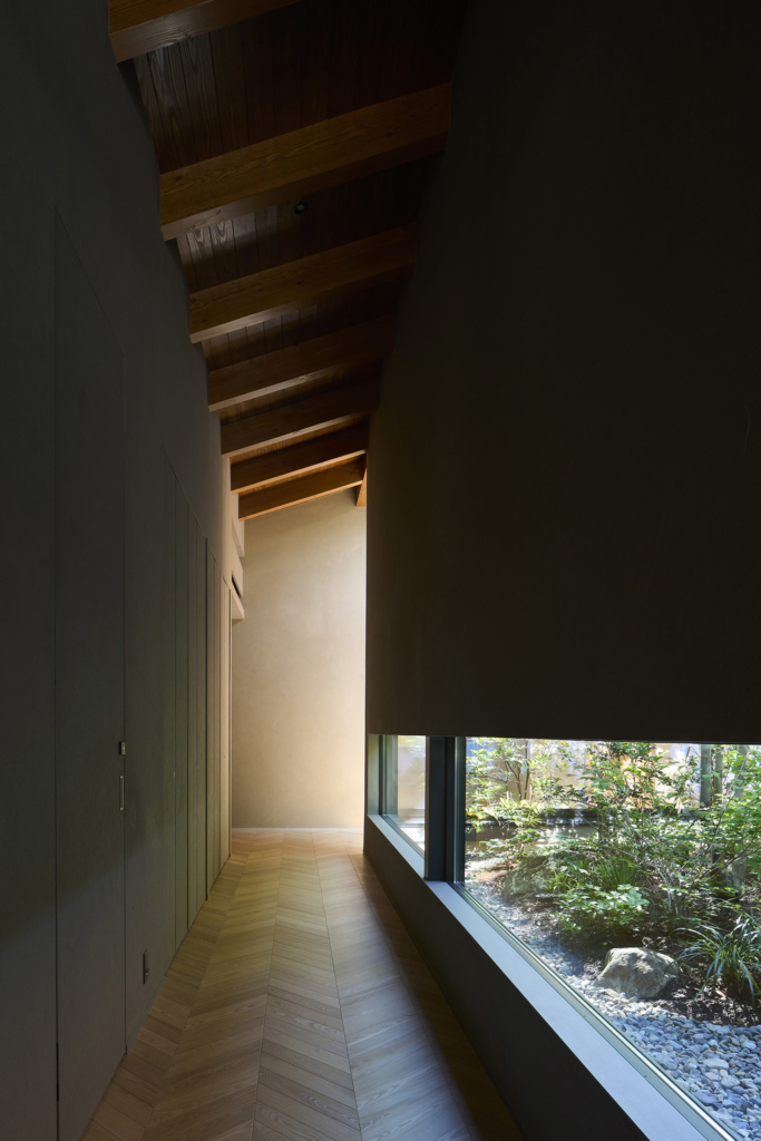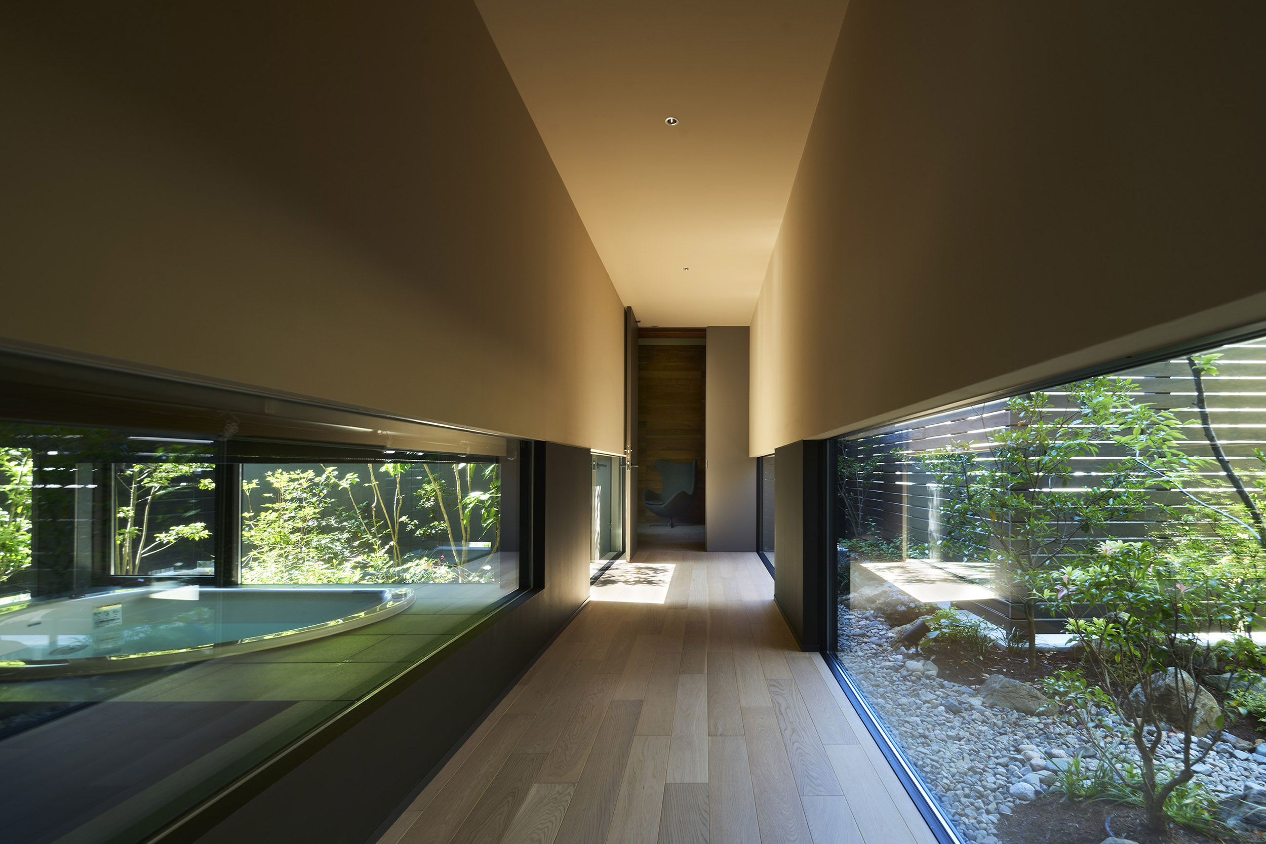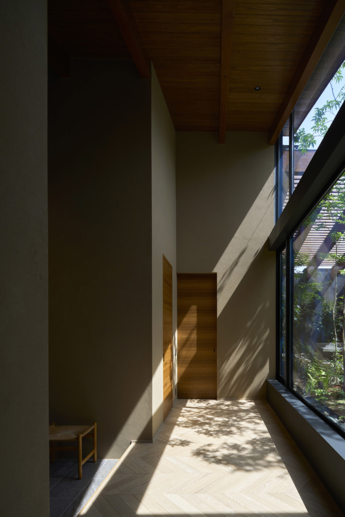 居室間の移動は明度を意図的に抑えることで、庭との対比を生み出すよう計画した。玄関ホールからリビングへと続く廊下は、地窓のみの明度を抑えた空間を通ることで、視線の先にある庭の光が一層印象的に感じられるようにした。書斎へ向かう廊下も同様に地窓とし、暗がりのなかに自然光が差し込むような静かな回廊空間を目指した。
