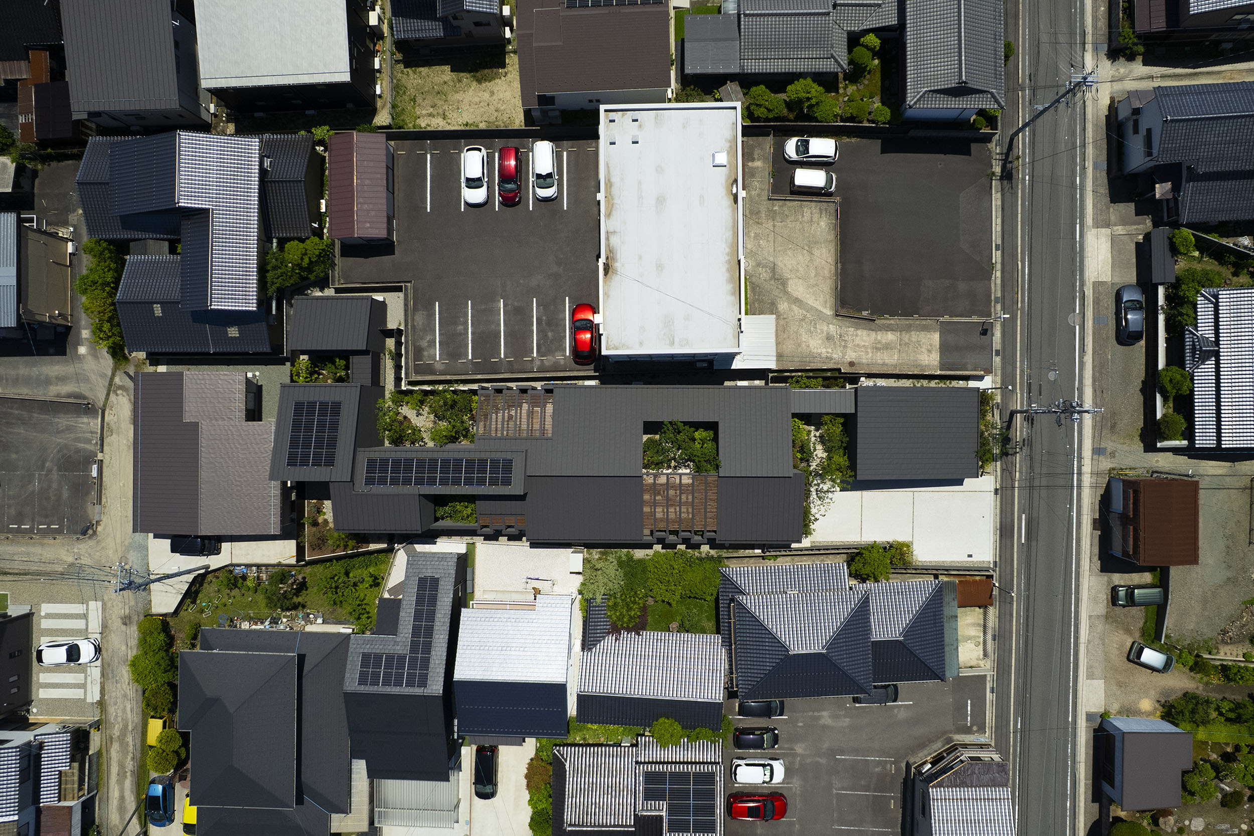 松江市は松江城を中心に発展した城下町であり、現在もその歴史的な風情が街並みに色濃く残る。また宍道湖・中海・堀川など多様な水辺に囲まれており、水郷都市としての特性も併せ持つ。敷地はかつての松江城下町の外堀に近いエリアに位置し、城下町の歴史的な区画割の影響が色濃く残る場所である。東西に長く、奥行約60メートル、間口約15メートルという形状は、京町家によく見られる間口3間のスケールと比べるとおよそ3倍の間口を持つ、いわば“巨大なうなぎの寝床”とも言える。松江市中心部は、もともとゆとりのある区画で構成されていたが、近年では土地の細分化が進み、住宅の密集化が進行している。今回の敷地も、周囲を住宅や事務所に囲まれており、周辺環境との関係を丁寧に読み解く必要があった。