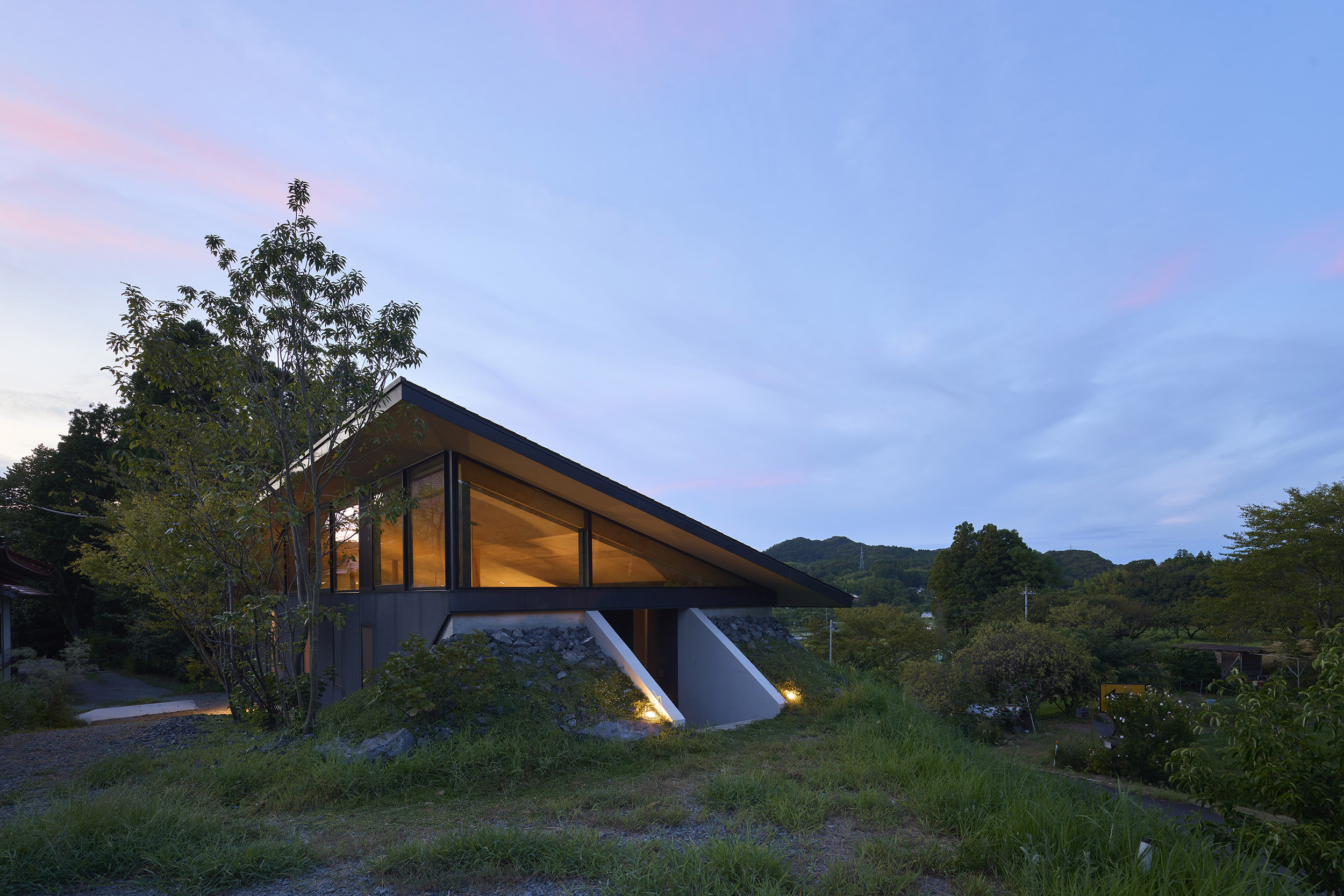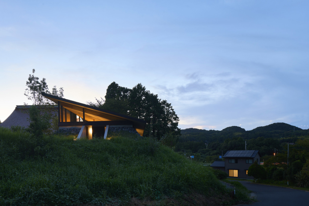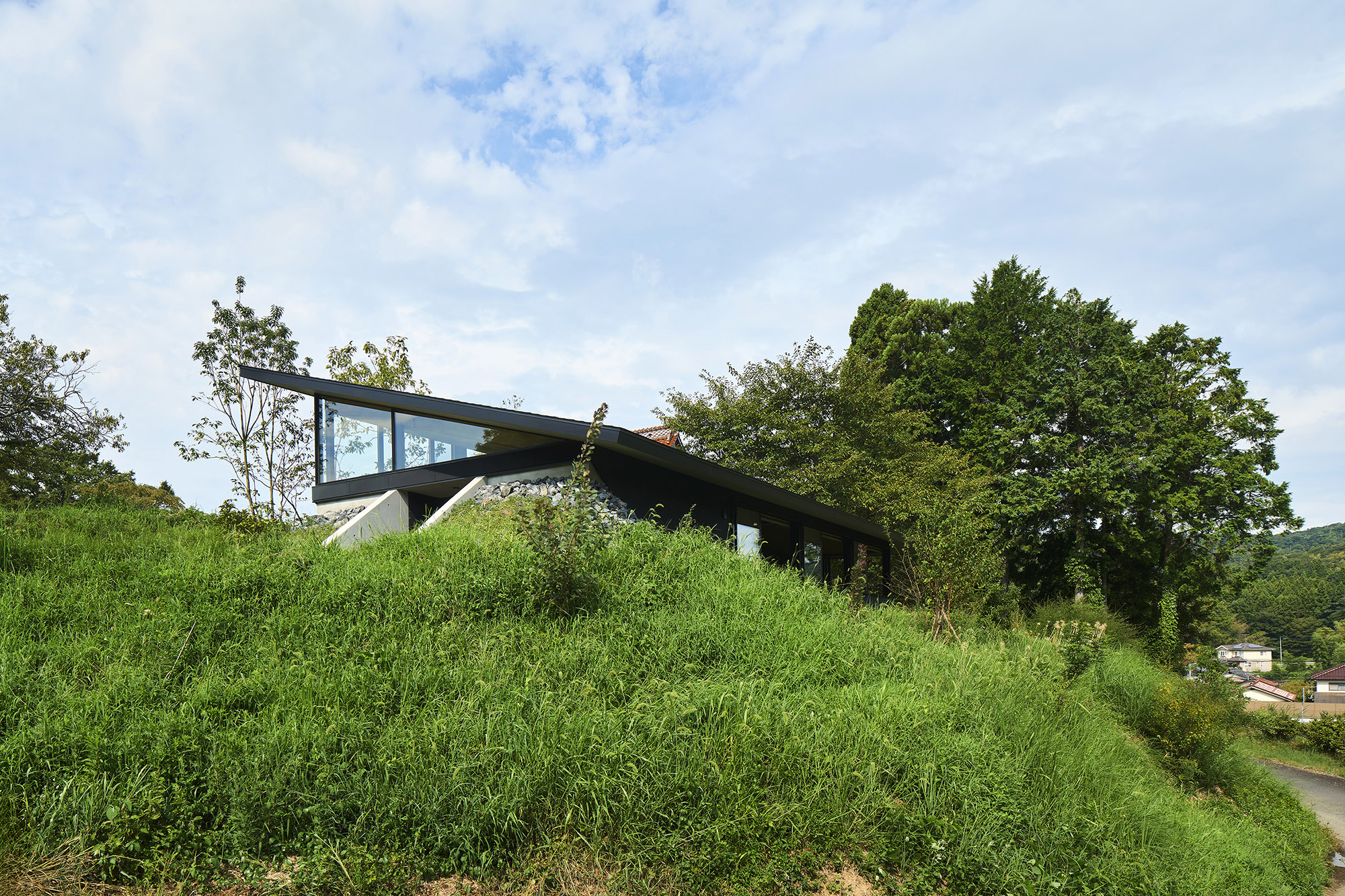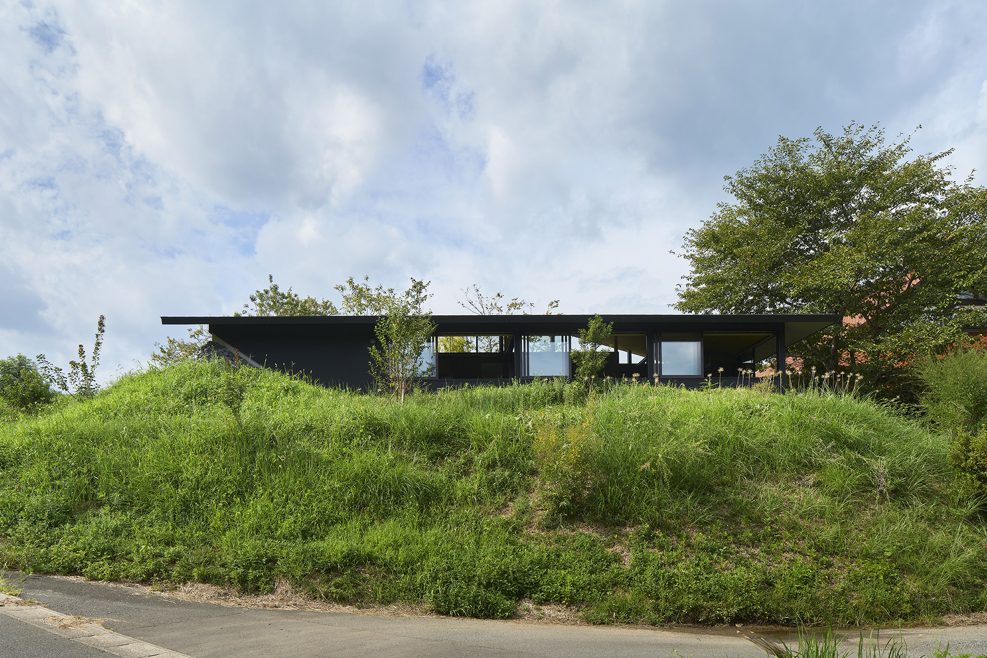 島根県大田市で計画した住宅。石見銀山にほど近く、田園風景のなかにゆるやかな丘陵が連なる穏やかな環境に位置する。敷地は小さな丘のように盛り上がった地形で、その頂上部が上段と下段の二つのレベルに分かれている。この特徴的な高低差を造成によって均すのではなく、丘の起伏に寄り添いながらひとつの大きな屋根を架け渡すように計画した。