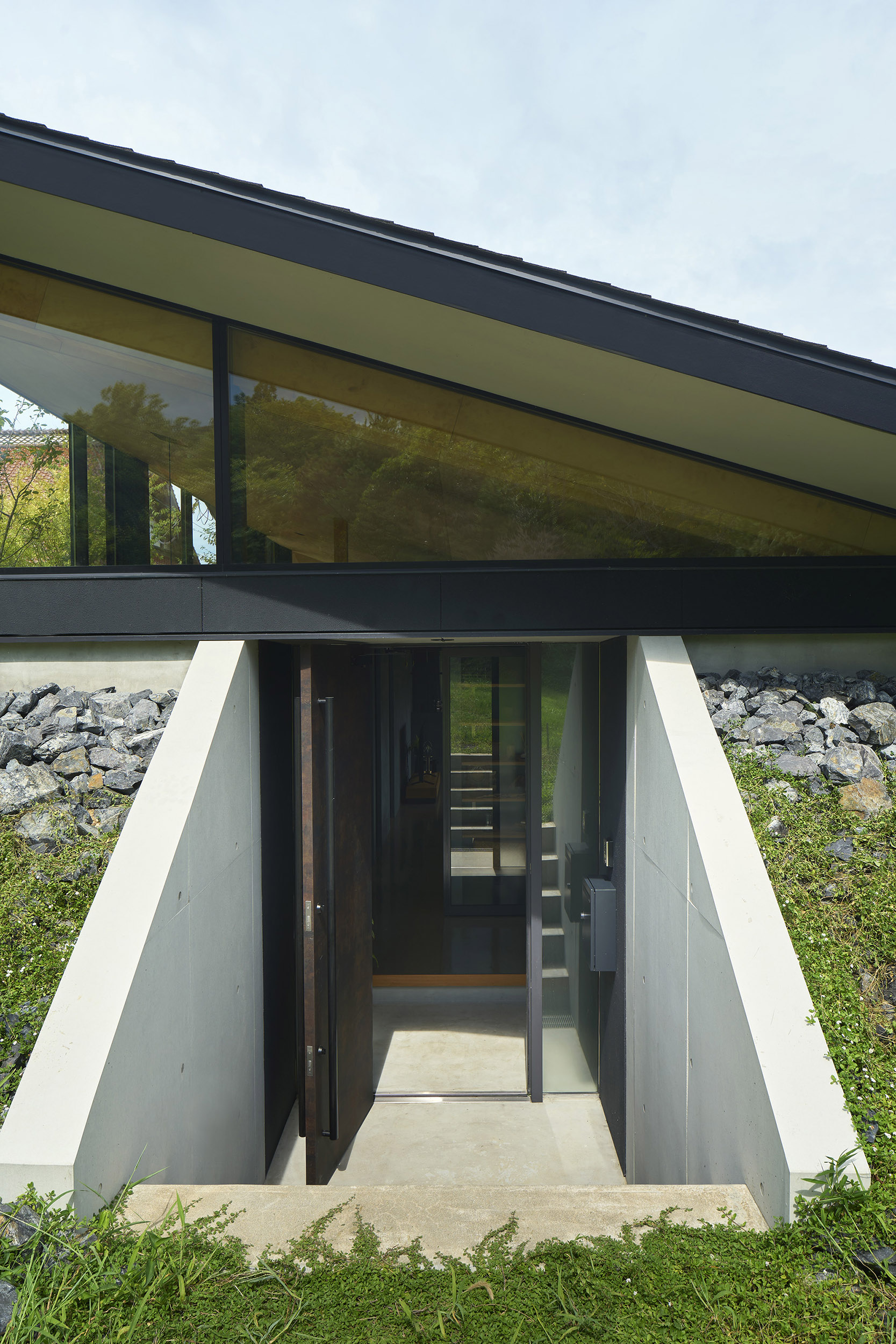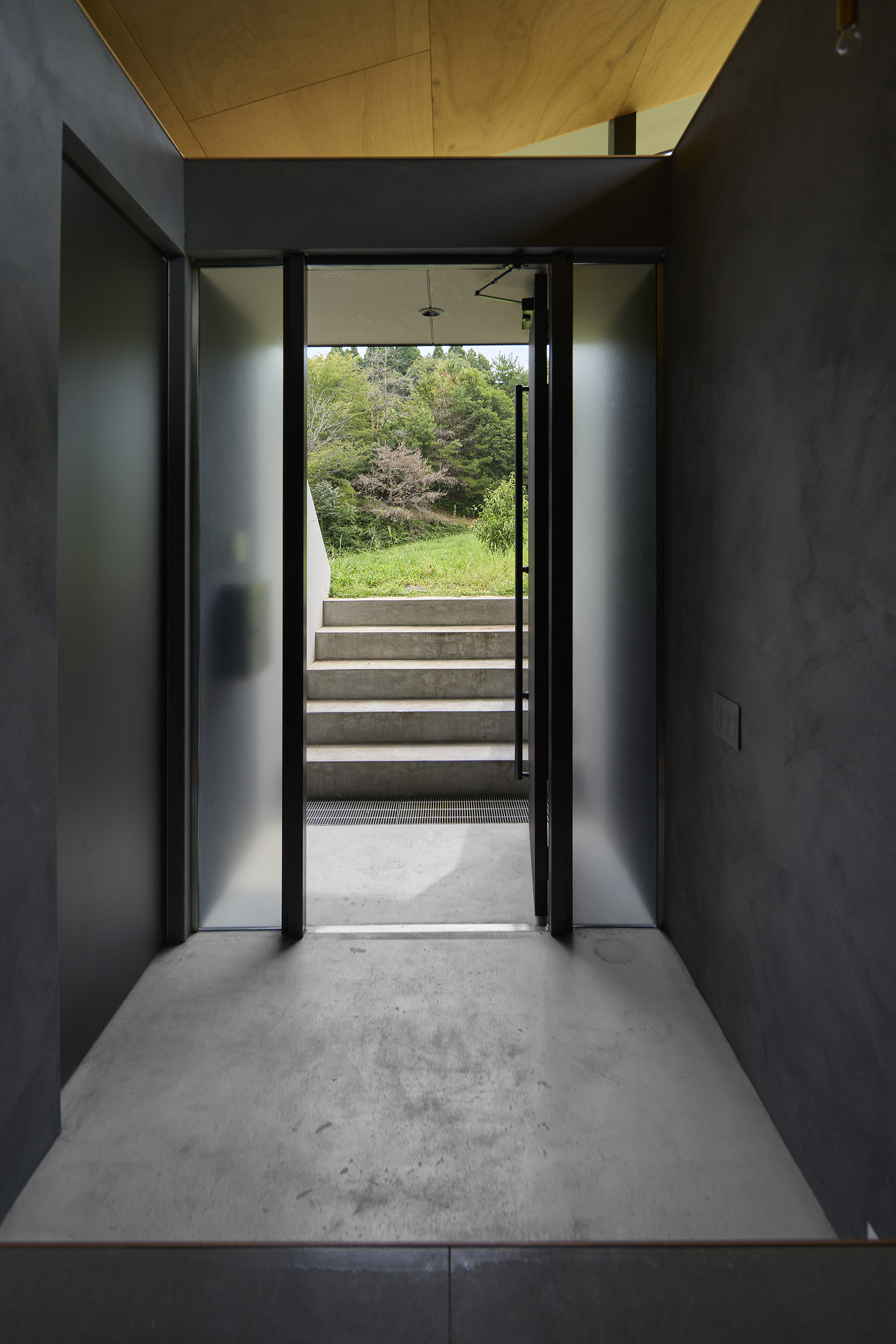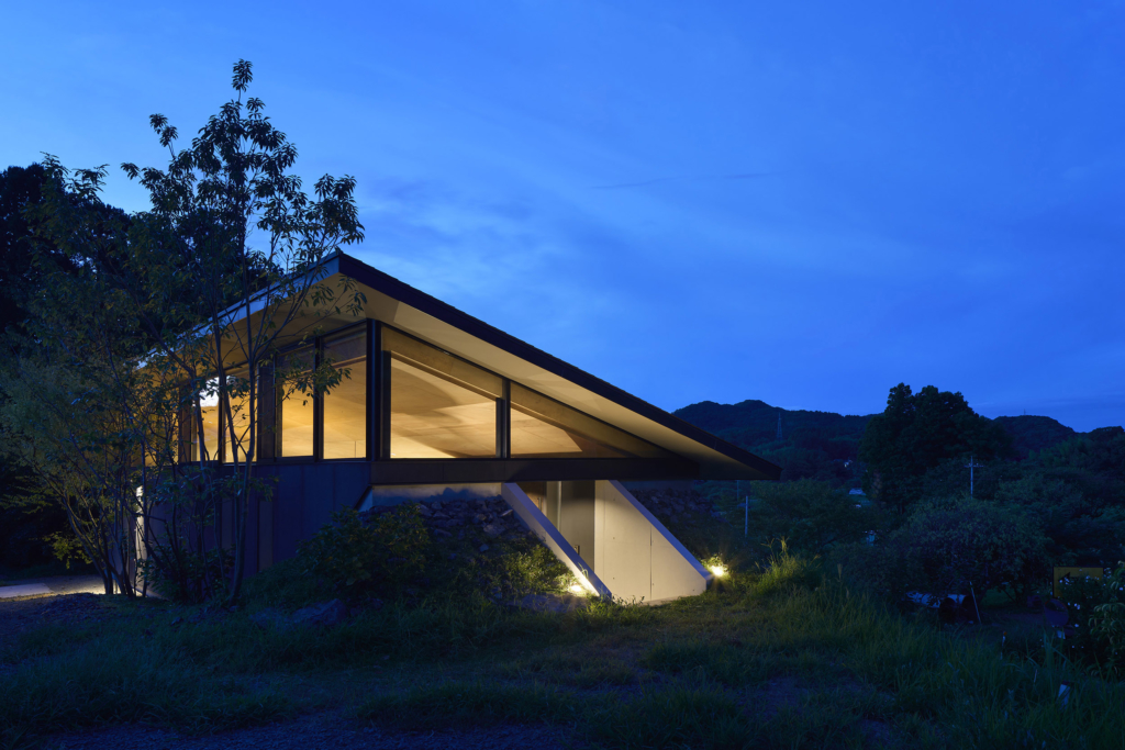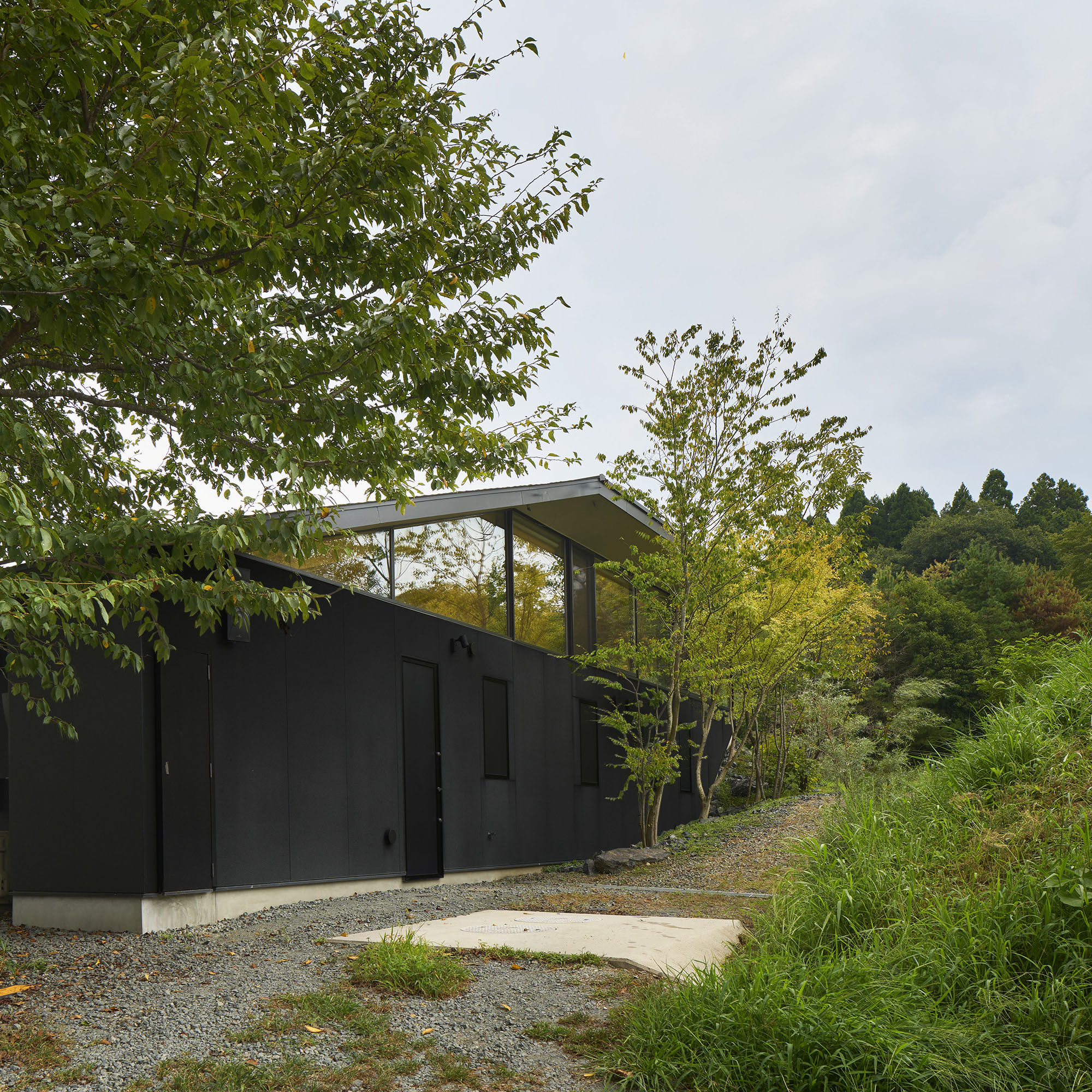 島根県大田市で計画した住宅。石見銀山にほど近く、田園風景のなかにゆるやかな丘陵が連なる穏やかな環境に位置する。敷地は小さな丘のように盛り上がった地形で、その頂上部が上段と下段の二つのレベルに分かれている。この特徴的な高低差を造成によって均すのではなく、丘の起伏に寄り添いながらひとつの大きな屋根を架け渡すように計画した。