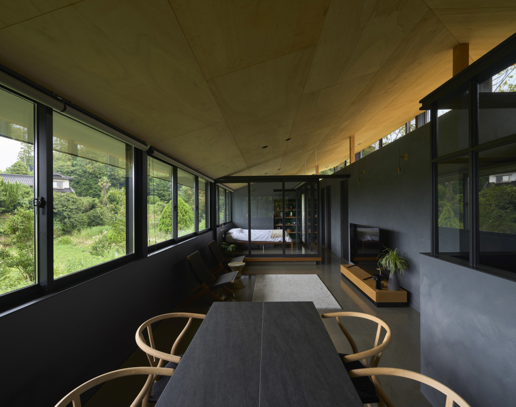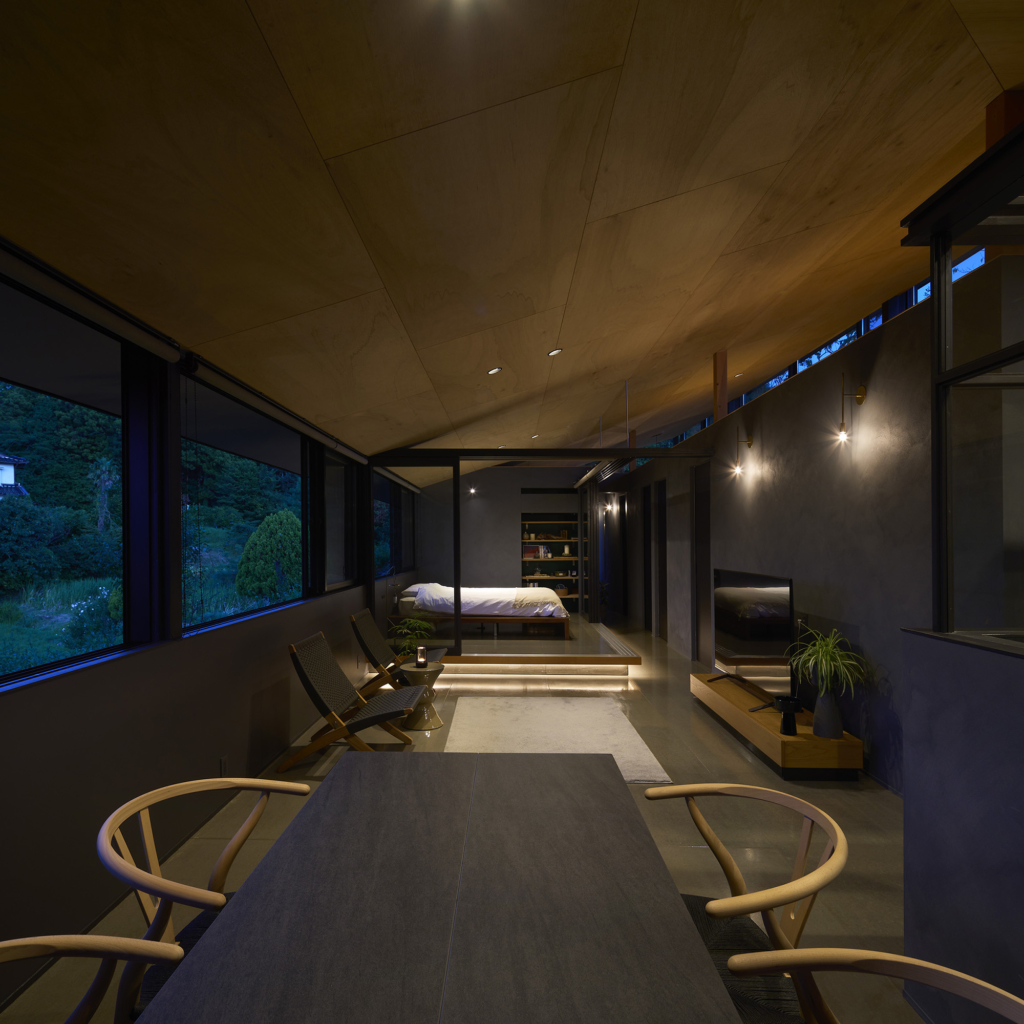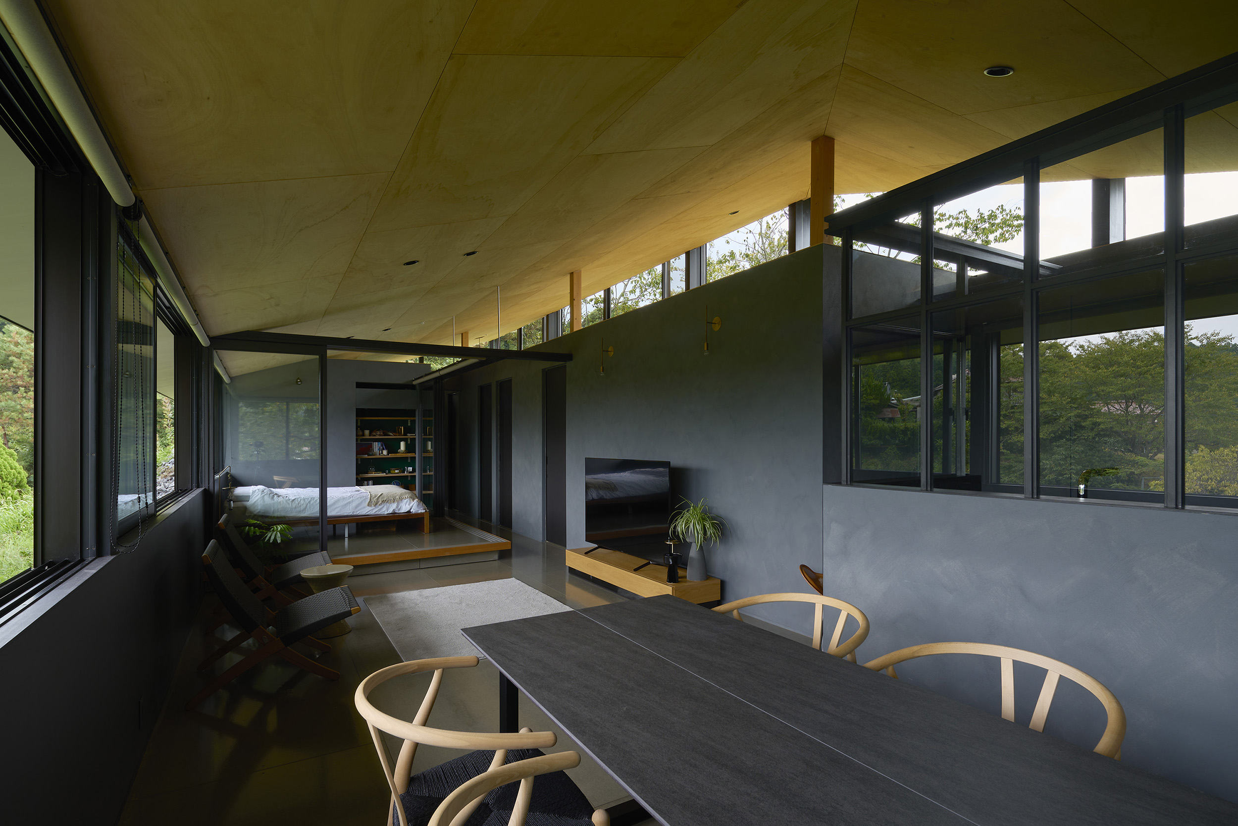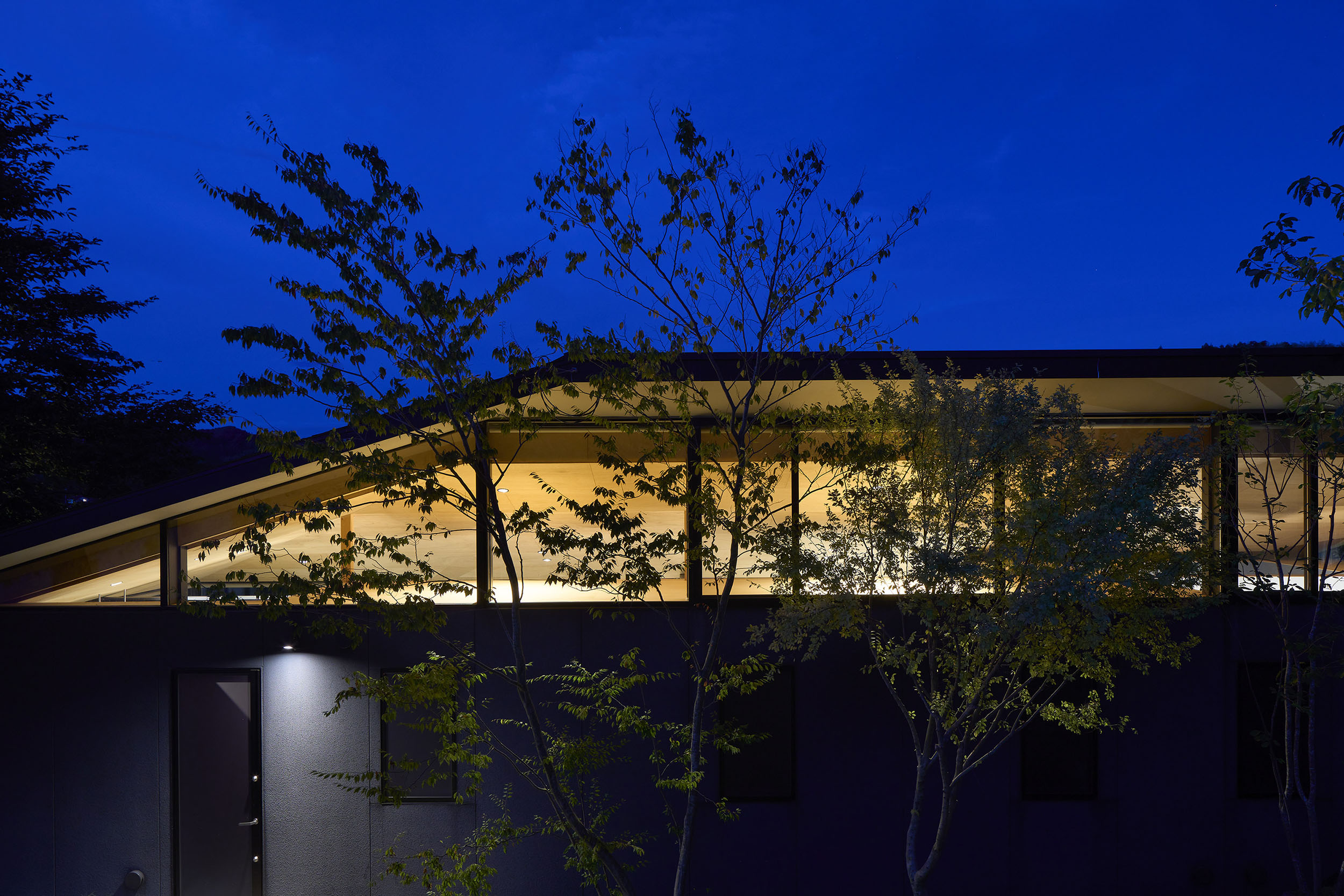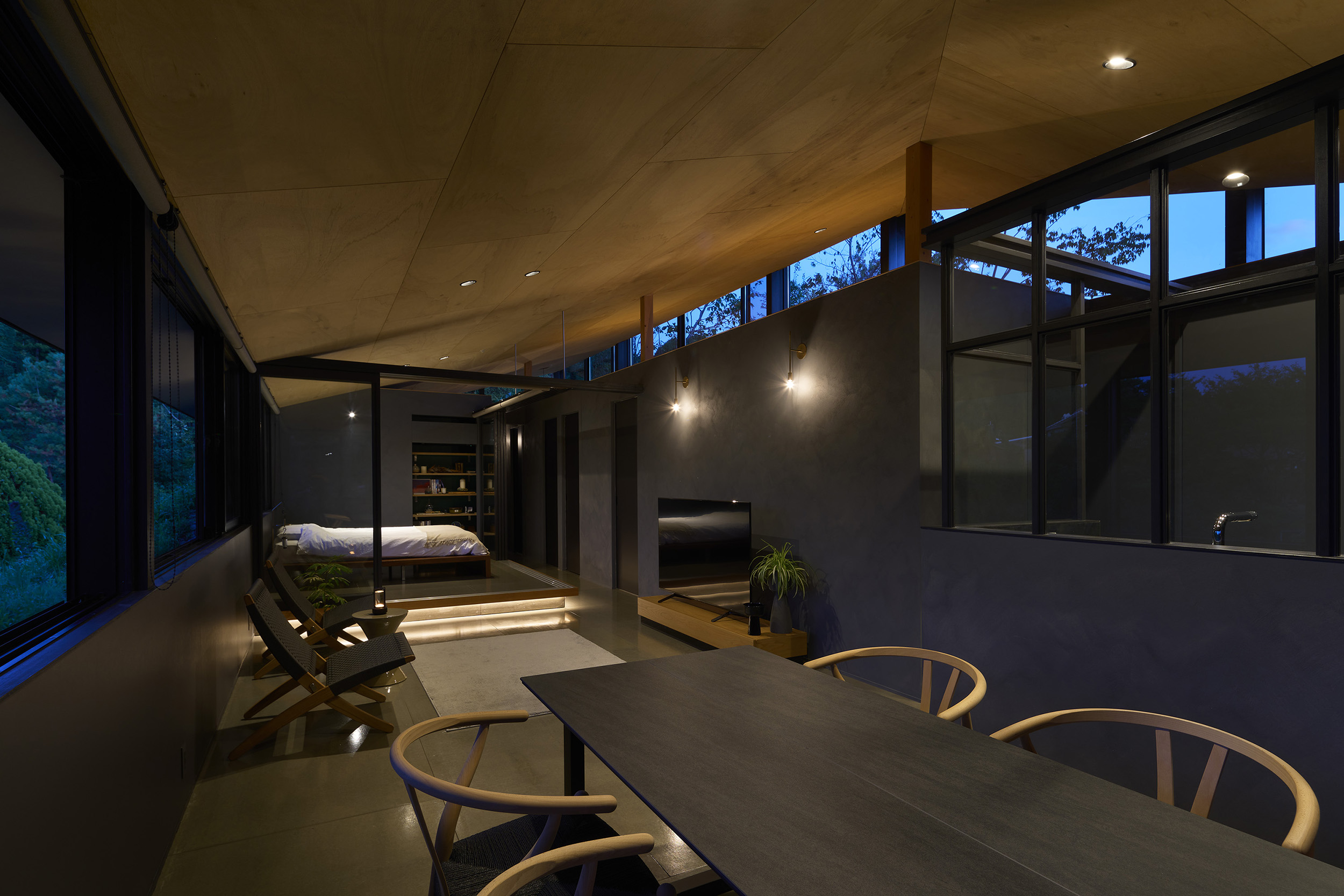 建物は夫婦ふたりのための平屋住宅であり、ひとつながりの空間の中に多様な居場所を望まれた。空間はガラスで仕切りながらも視線と光がゆるやかに交わる構成とし、天井の高さや開口部の位置の違いによって空間の性格を変化させた。