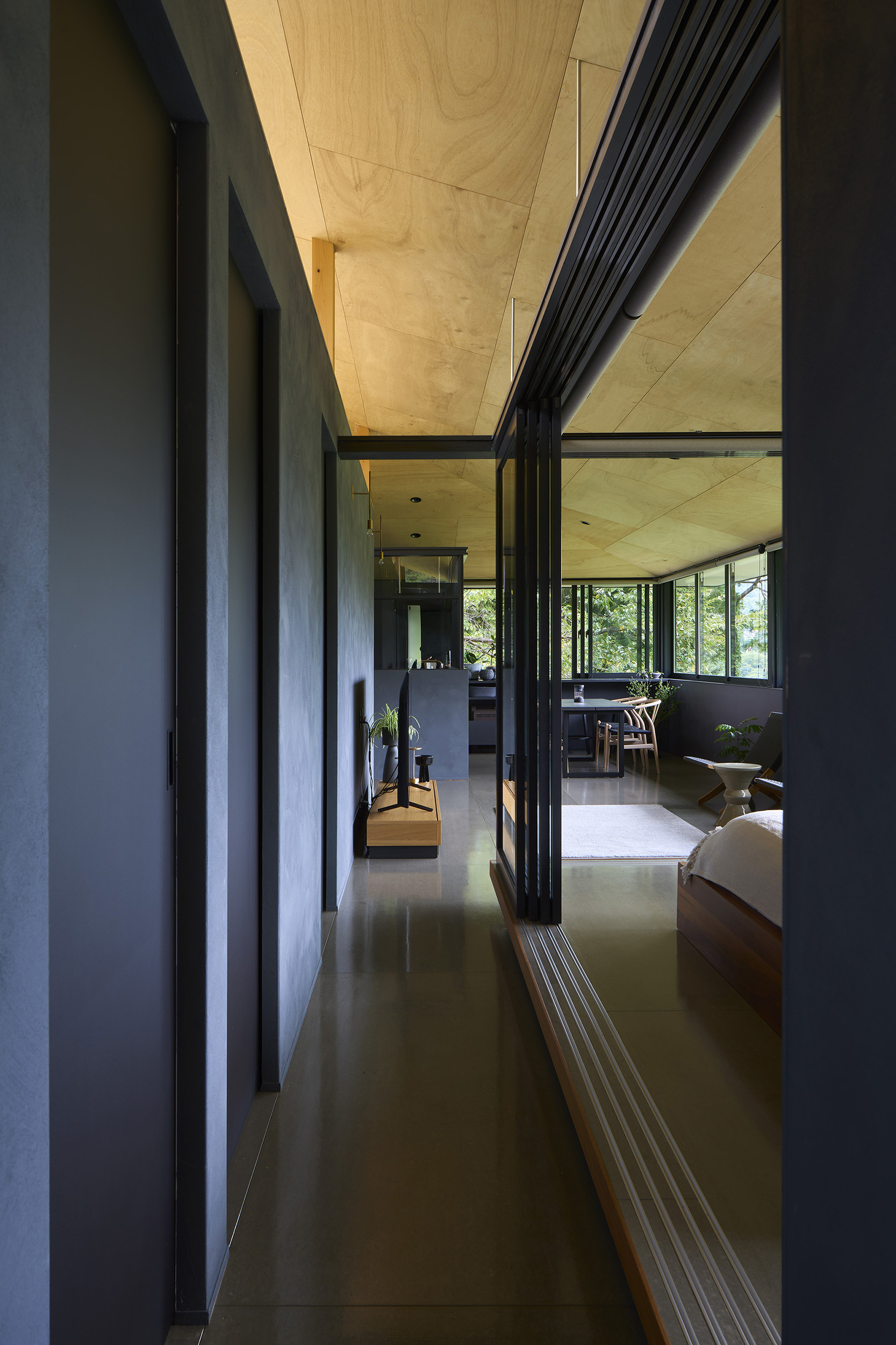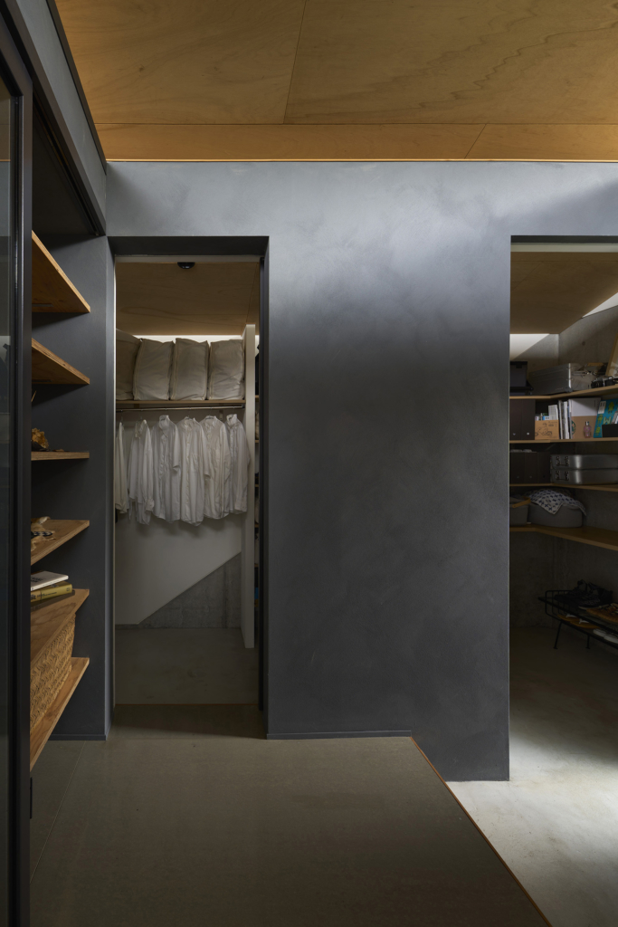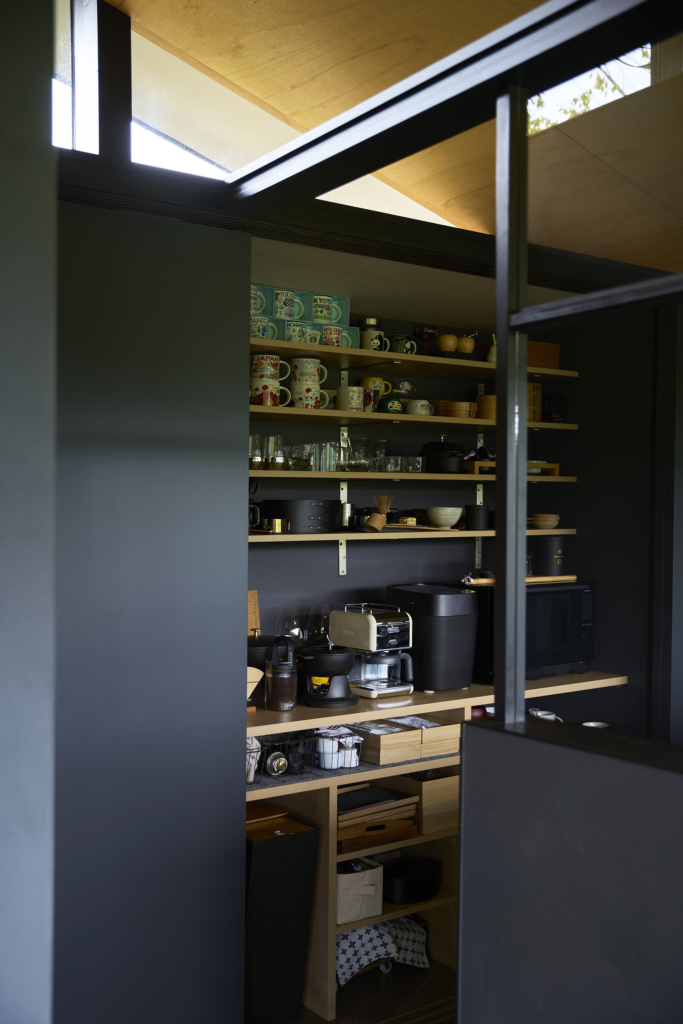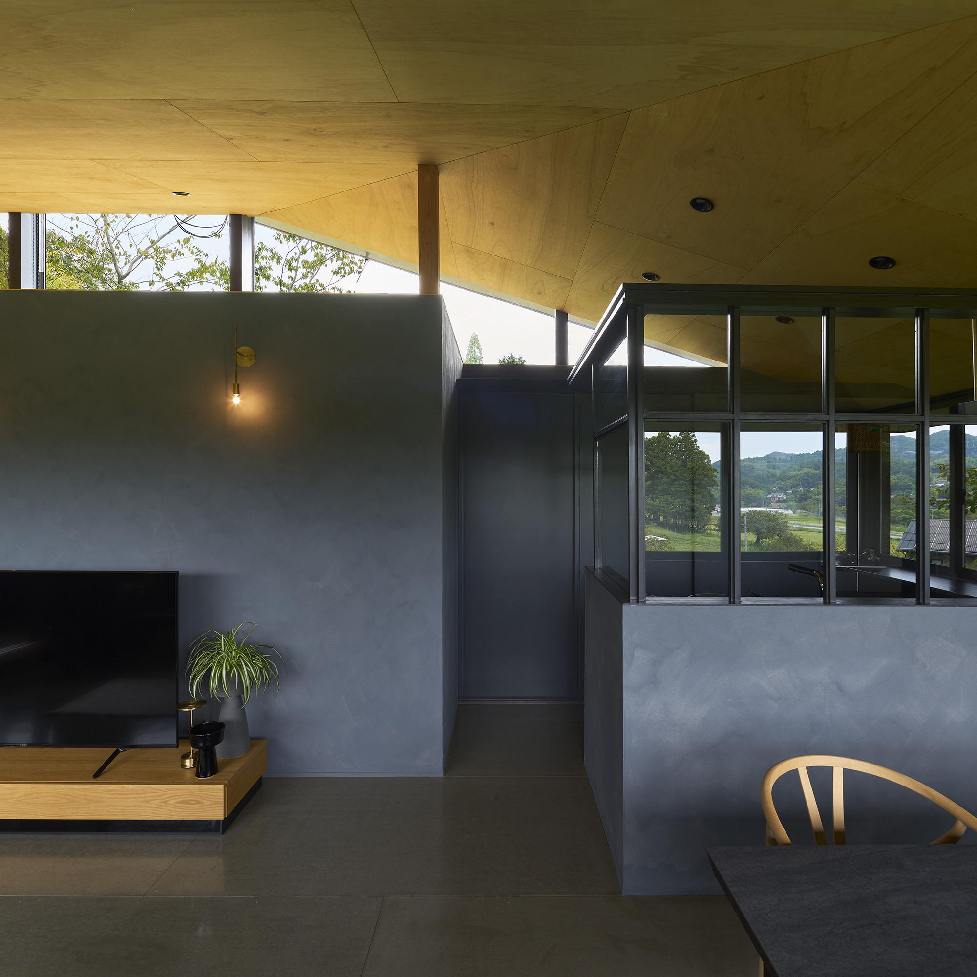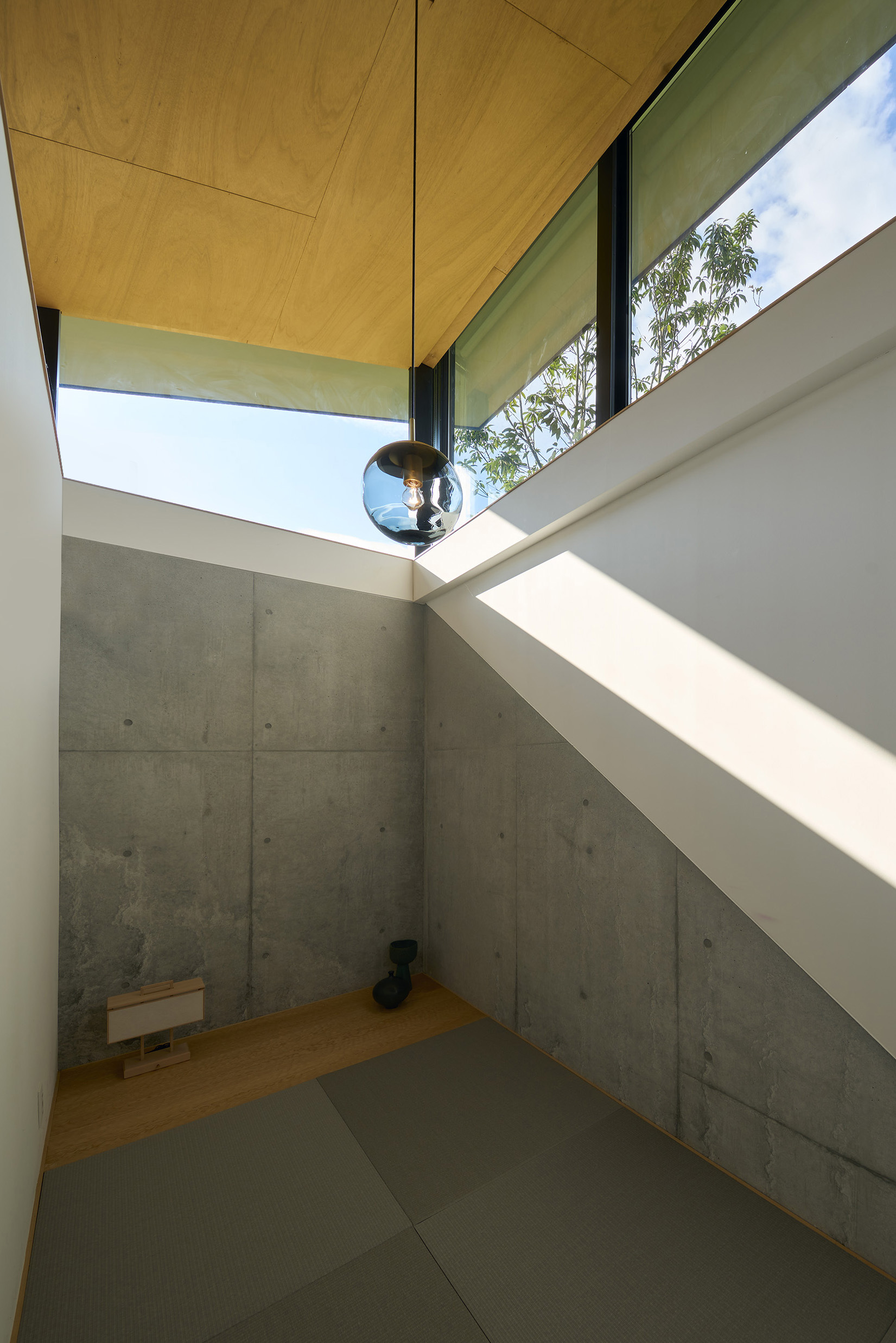建物は夫婦ふたりのための平屋住宅であり、ひとつながりの空間の中に多様な居場所を望まれた。空間はガラスで仕切りながらも視線と光がゆるやかに交わる構成とし、天井の高さや開口部の位置の違いによって空間の性格を変化させた。