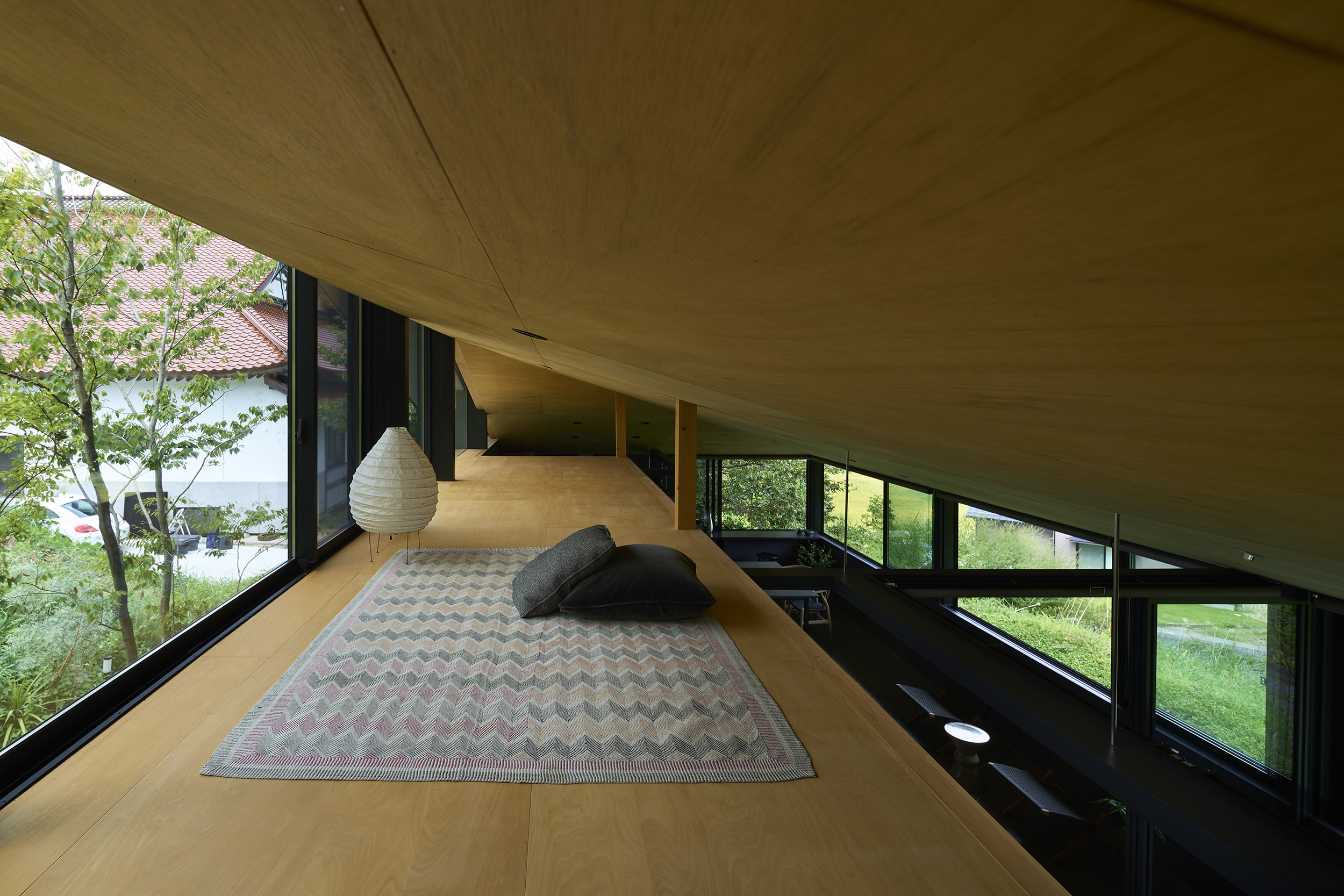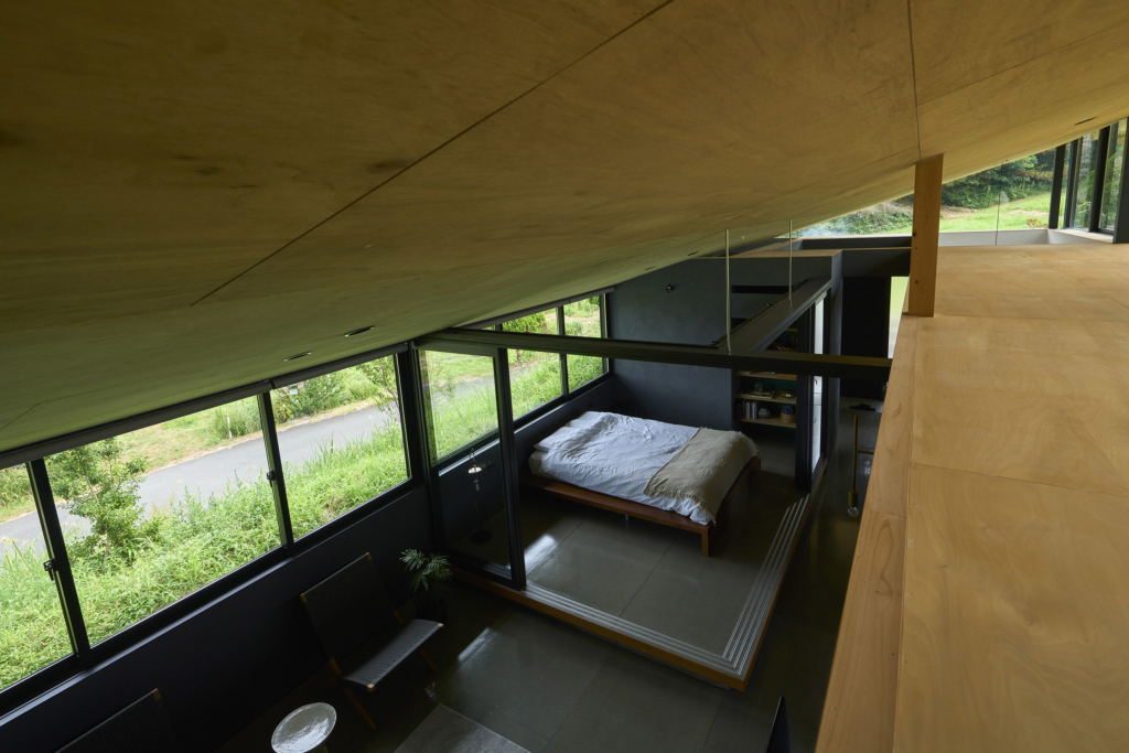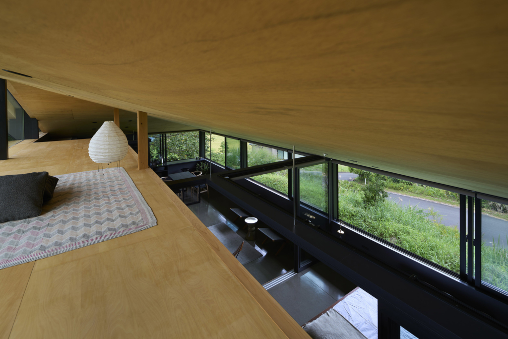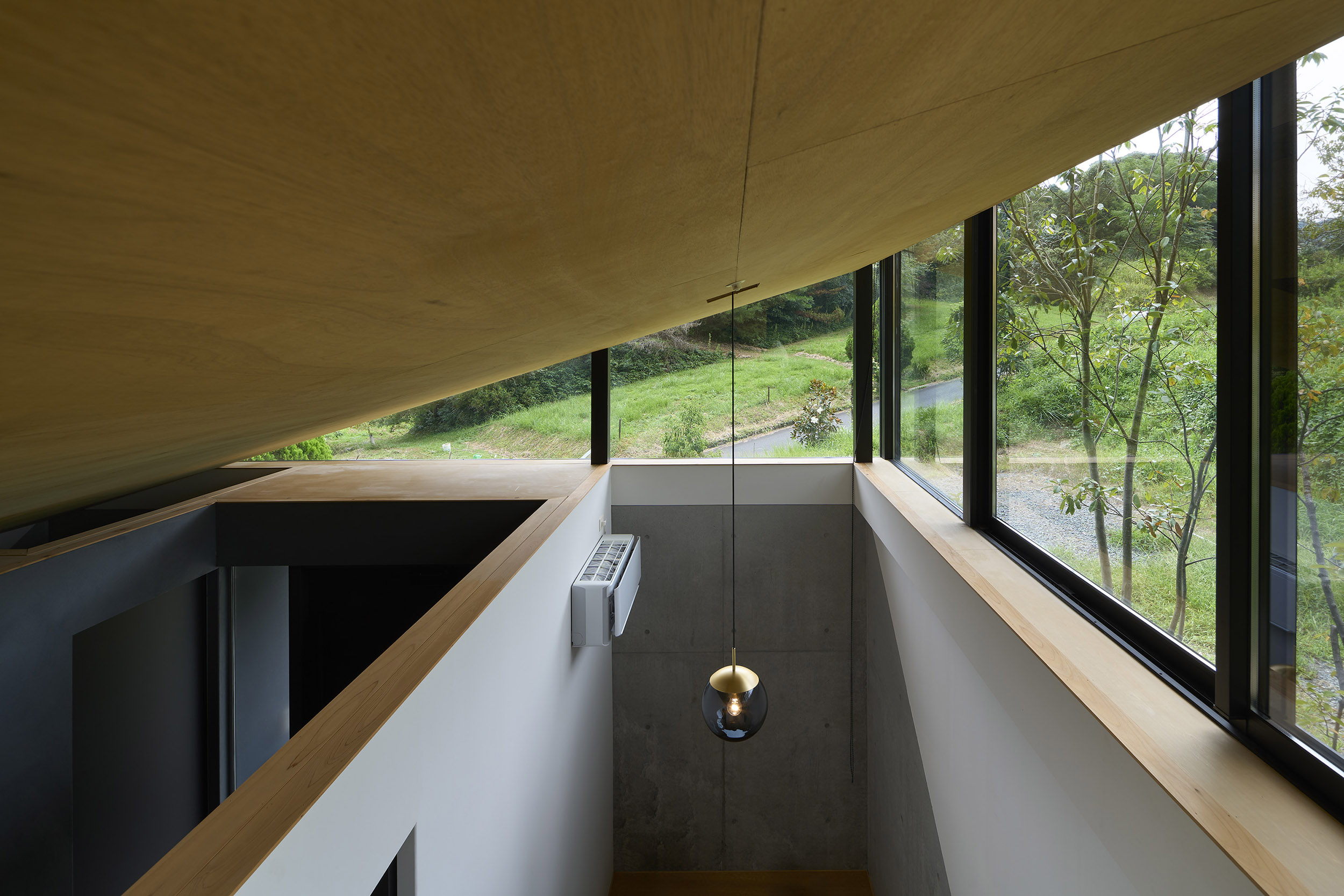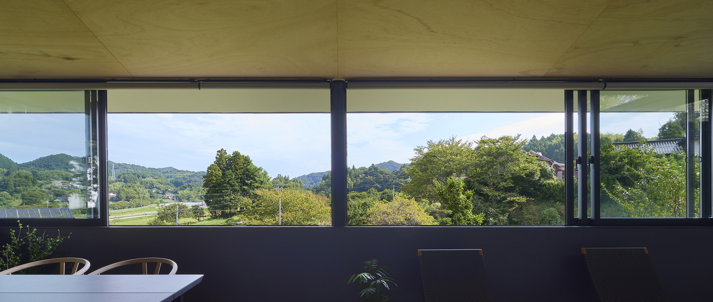 LDKと寝室には、周囲の風景に呼応するように連窓を設けた。腰壁を設けることで、開放的でありながらも落ち着いた内向性を併せ持つ。ロフトには大きな開口を設けることで、景色を切り取るだけでなく山並みや月を眺めながら過ごす場とした。またこれらの窓は採光や眺望だけでなく、風の通り道を生み出し、丘の上を渡る風が建物の中を抜けていく。
