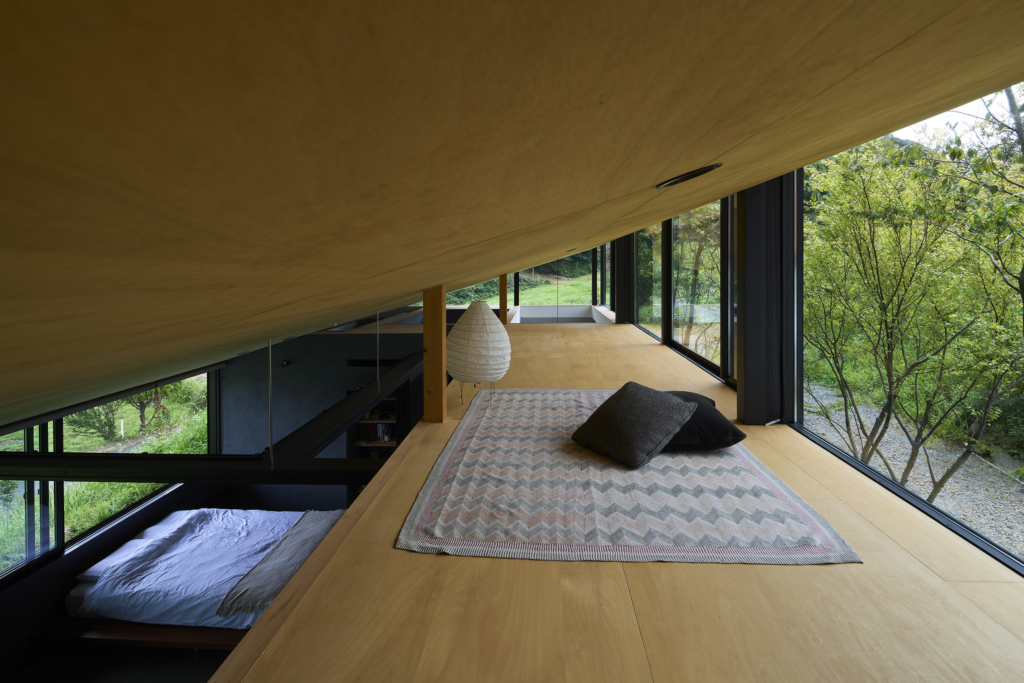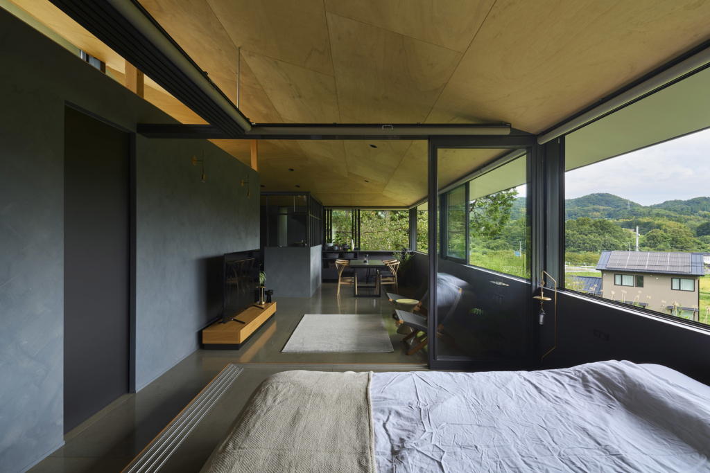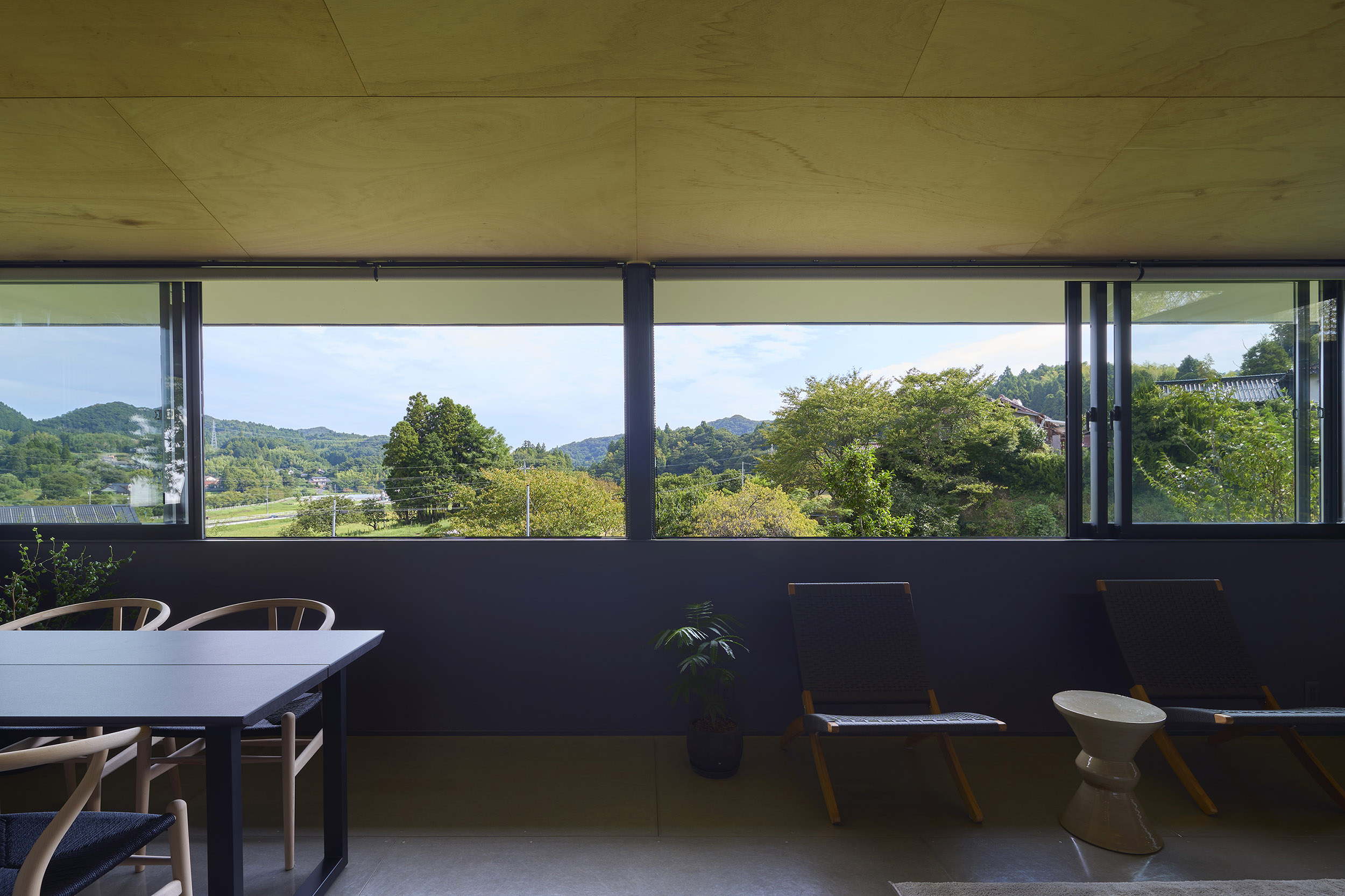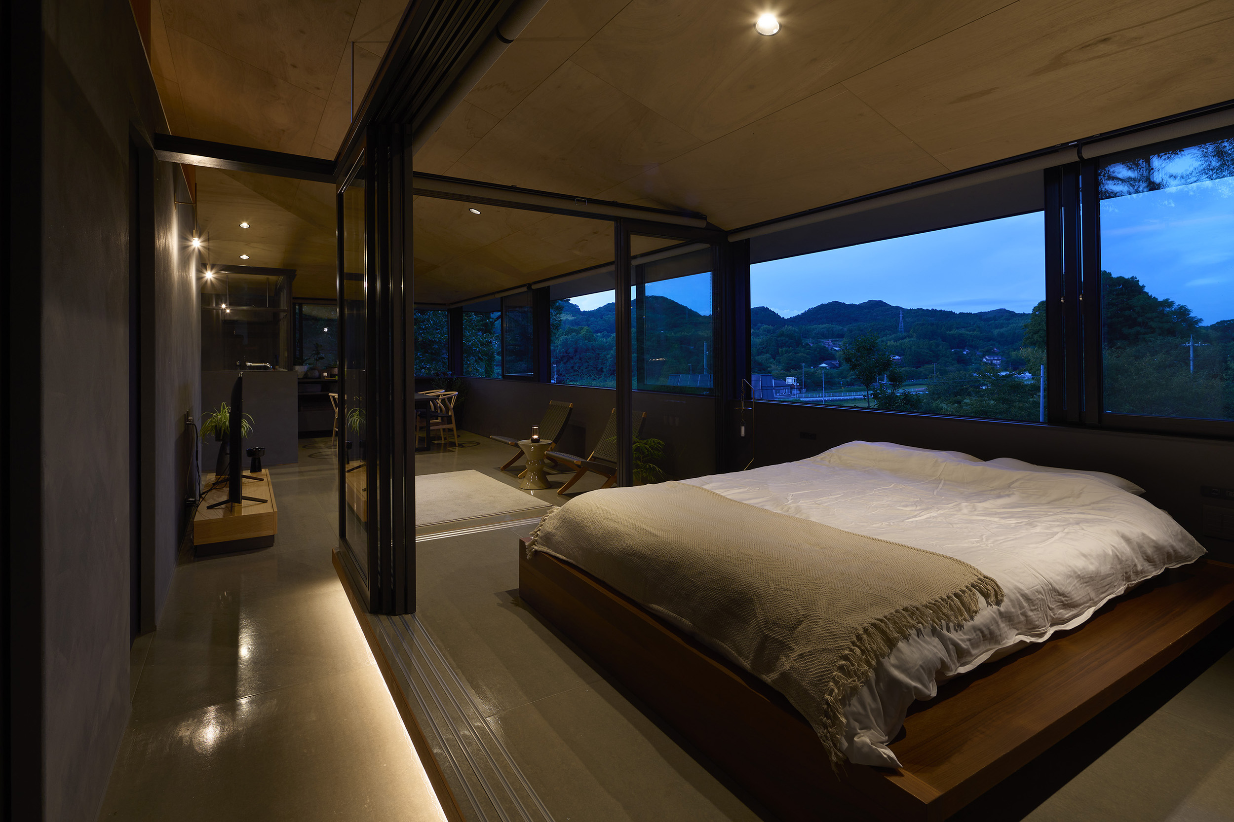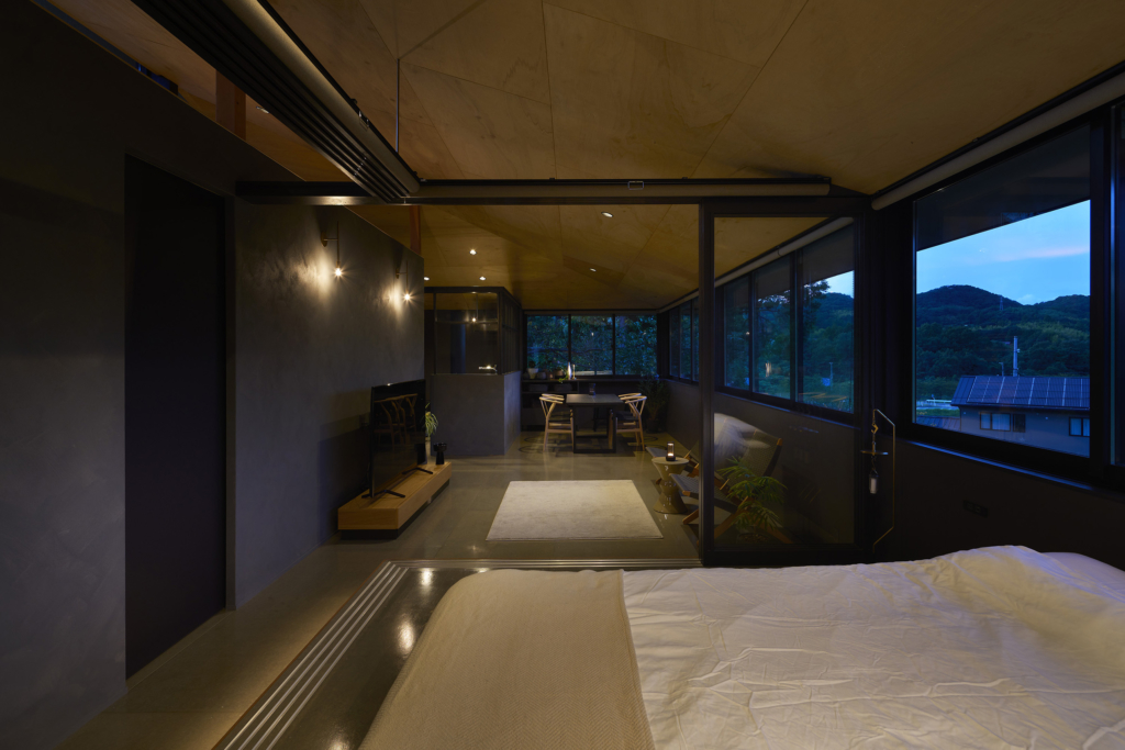 LDKと寝室には、周囲の風景に呼応するように連窓を設けた。腰壁を設けることで、開放的でありながらも落ち着いた内向性を併せ持つ。ロフトには大きな開口を設けることで、景色を切り取るだけでなく山並みや月を眺めながら過ごす場とした。またこれらの窓は採光や眺望だけでなく、風の通り道を生み出し、丘の上を渡る風が建物の中を抜けていく。
