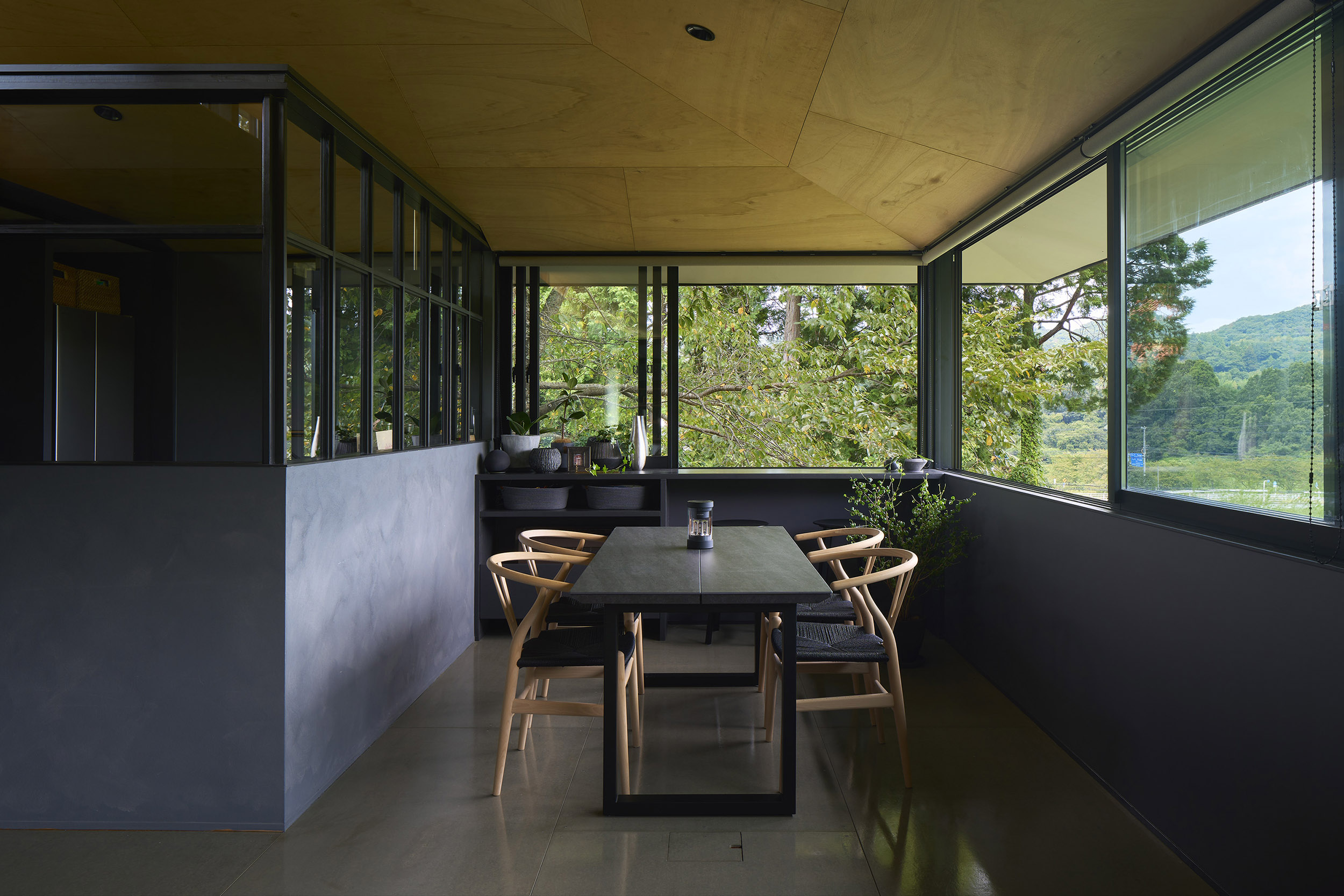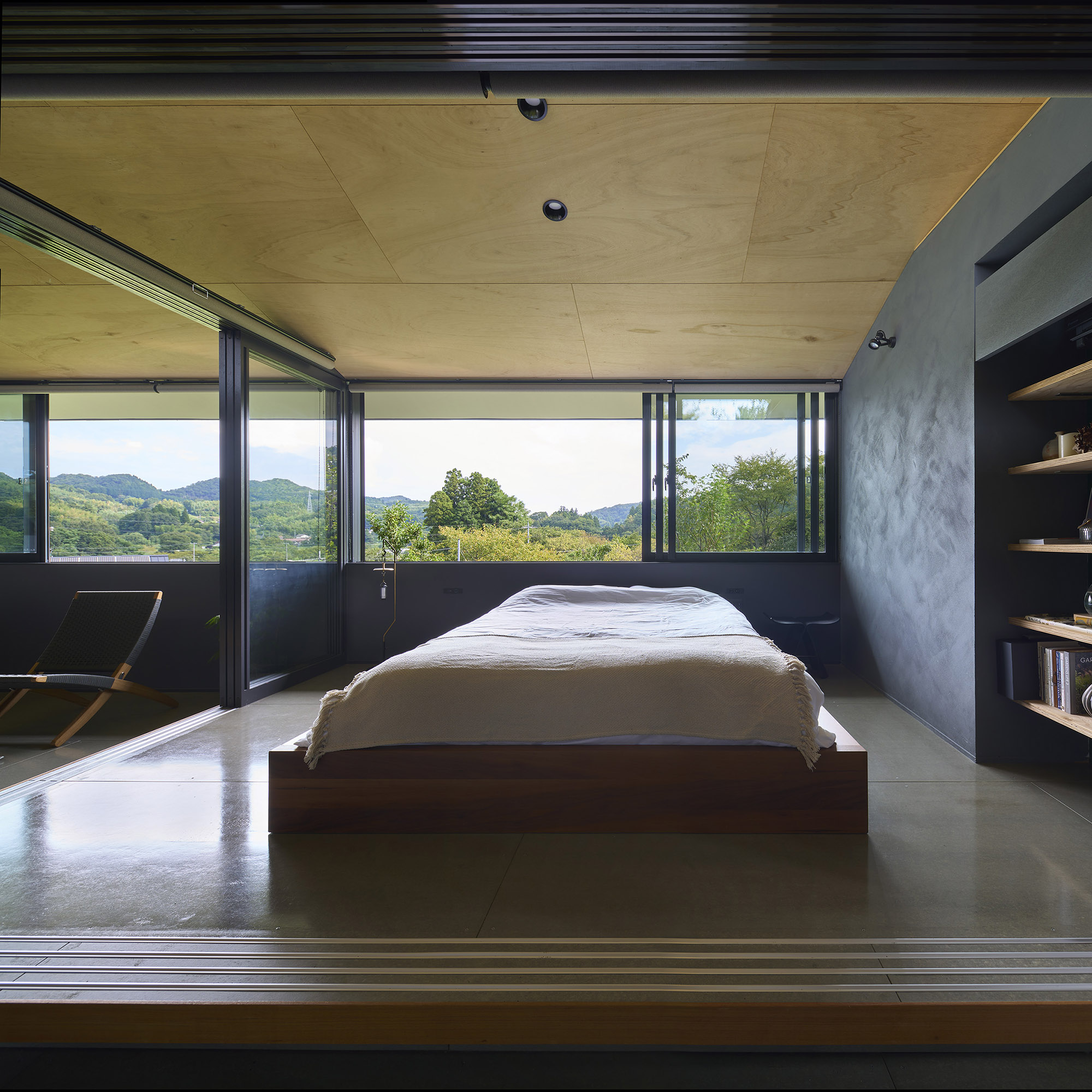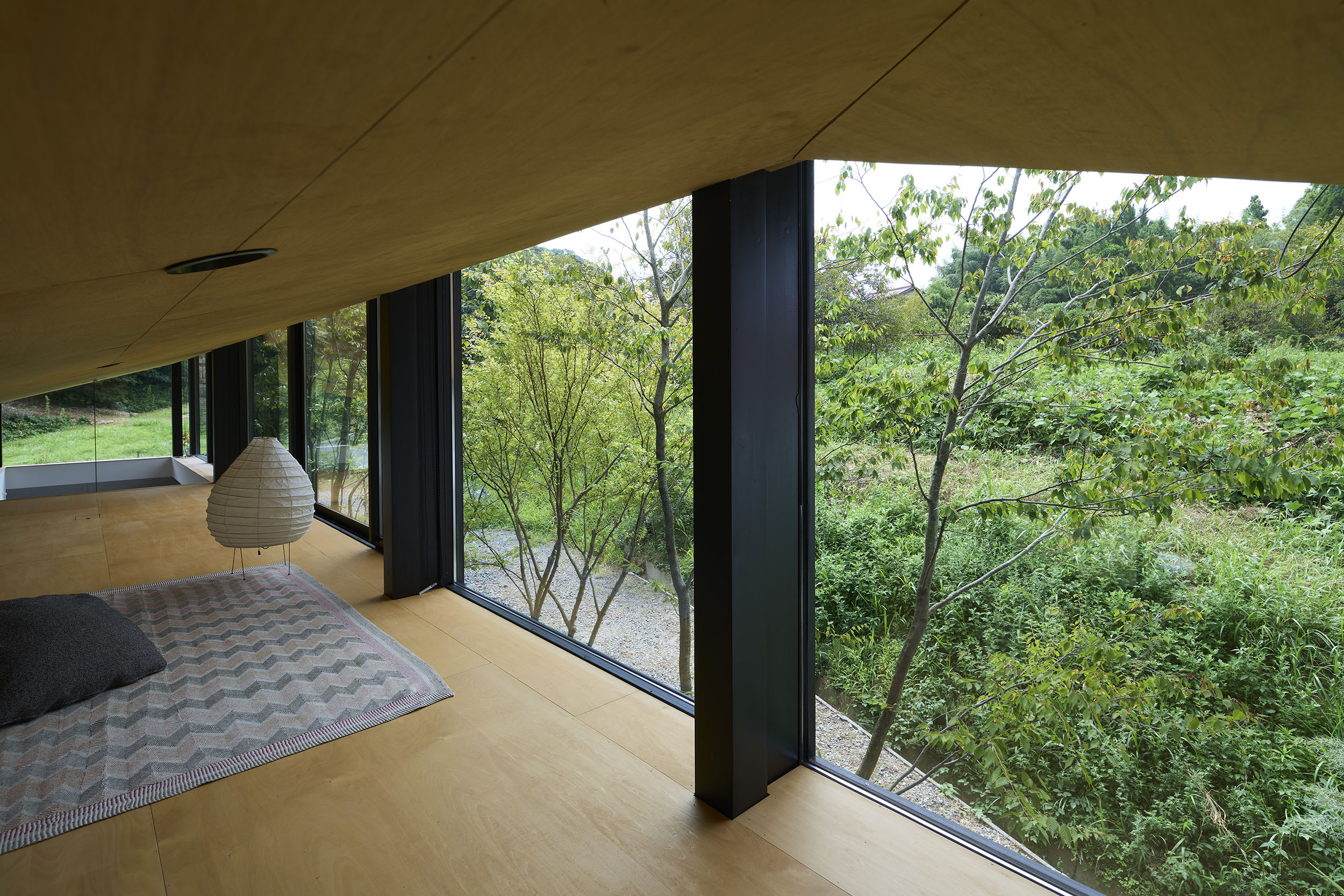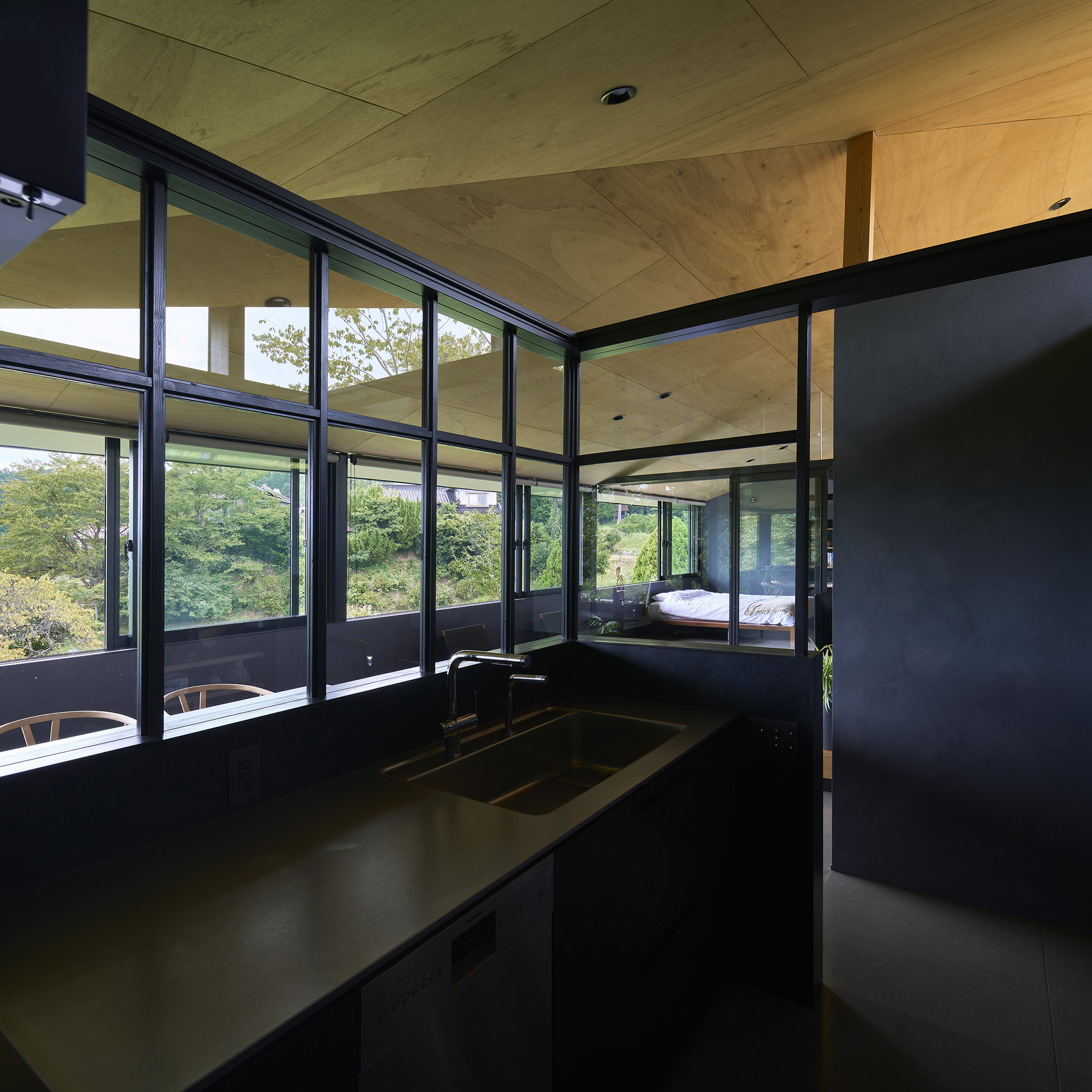 LDKと寝室には、周囲の風景に呼応するように連窓を設けた。腰壁を設けることで、開放的でありながらも落ち着いた内向性を併せ持つ。ロフトには大きな開口を設けることで、景色を切り取るだけでなく山並みや月を眺めながら過ごす場とした。またこれらの窓は採光や眺望だけでなく、風の通り道を生み出し、丘の上を渡る風が建物の中を抜けていく。