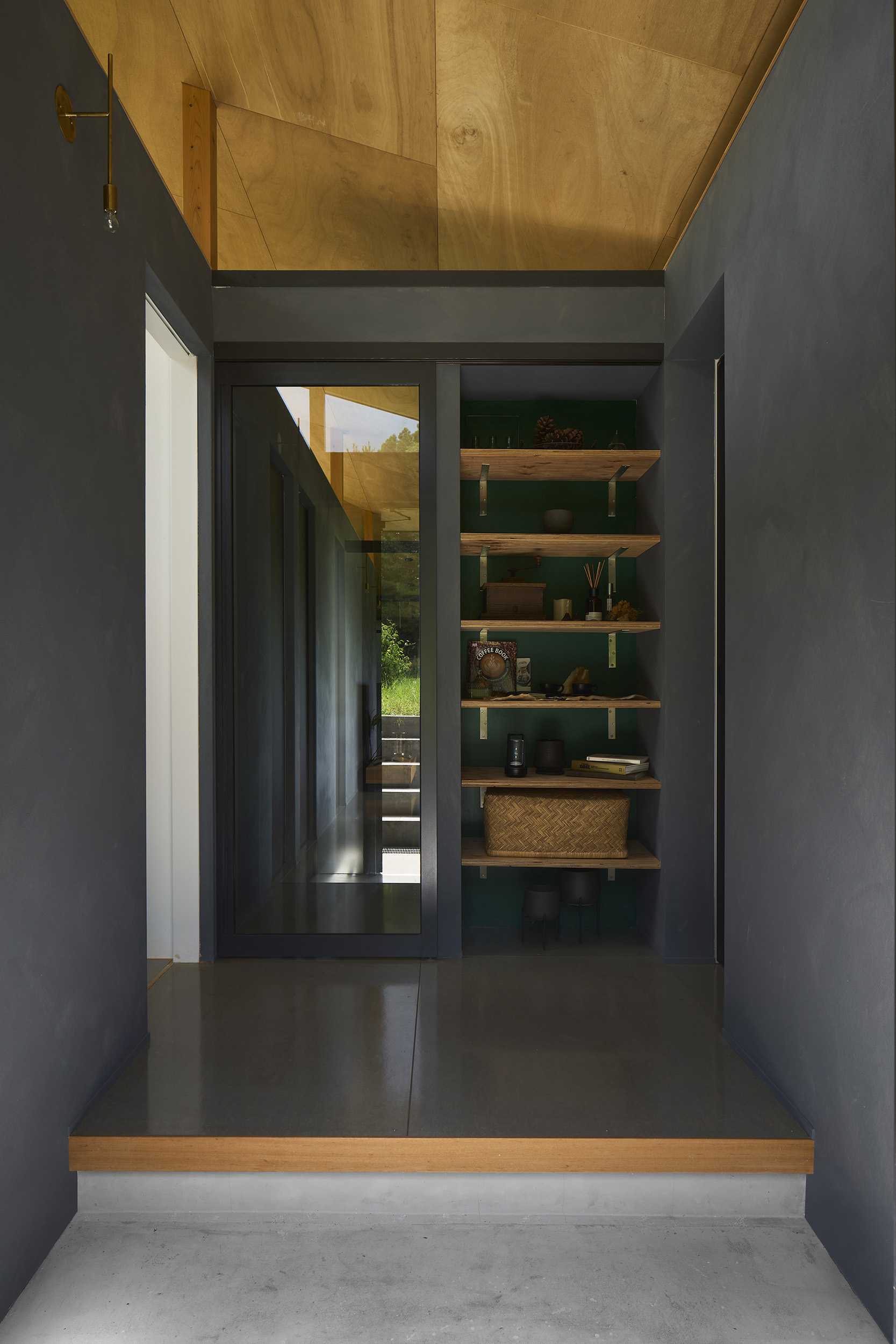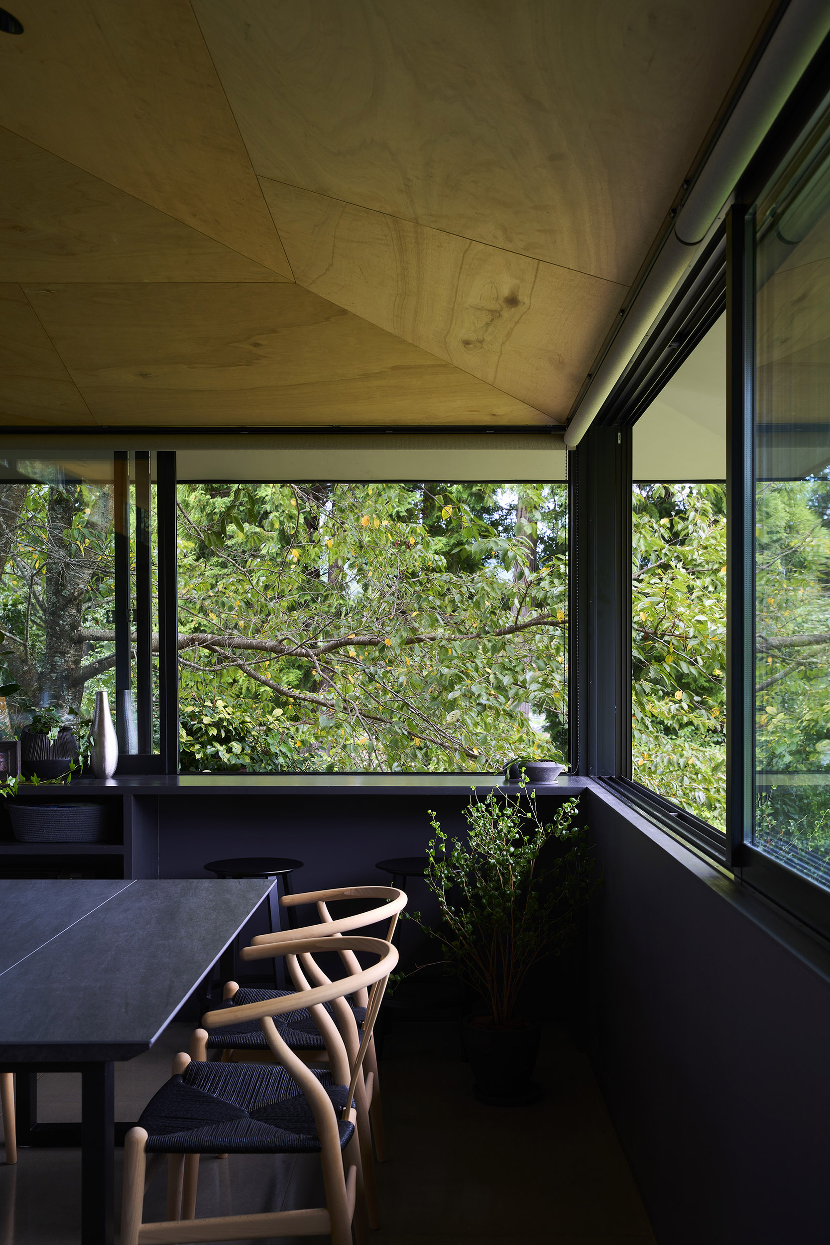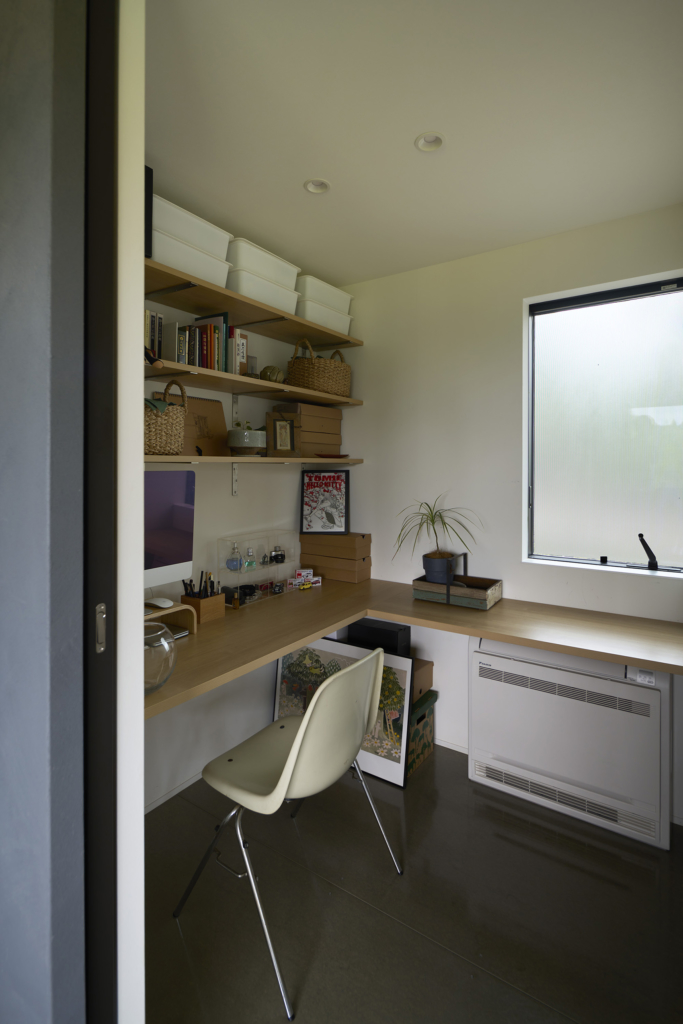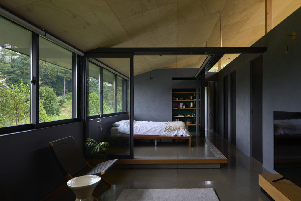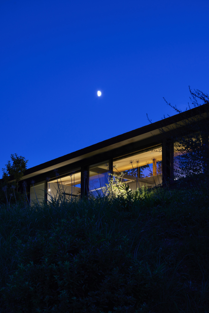 LDKと寝室には、周囲の風景に呼応するように連窓を設けた。腰壁を設けることで、開放的でありながらも落ち着いた内向性を併せ持つ。ロフトには大きな開口を設けることで、景色を切り取るだけでなく山並みや月を眺めながら過ごす場とした。またこれらの窓は採光や眺望だけでなく、風の通り道を生み出し、丘の上を渡る風が建物の中を抜けていく。